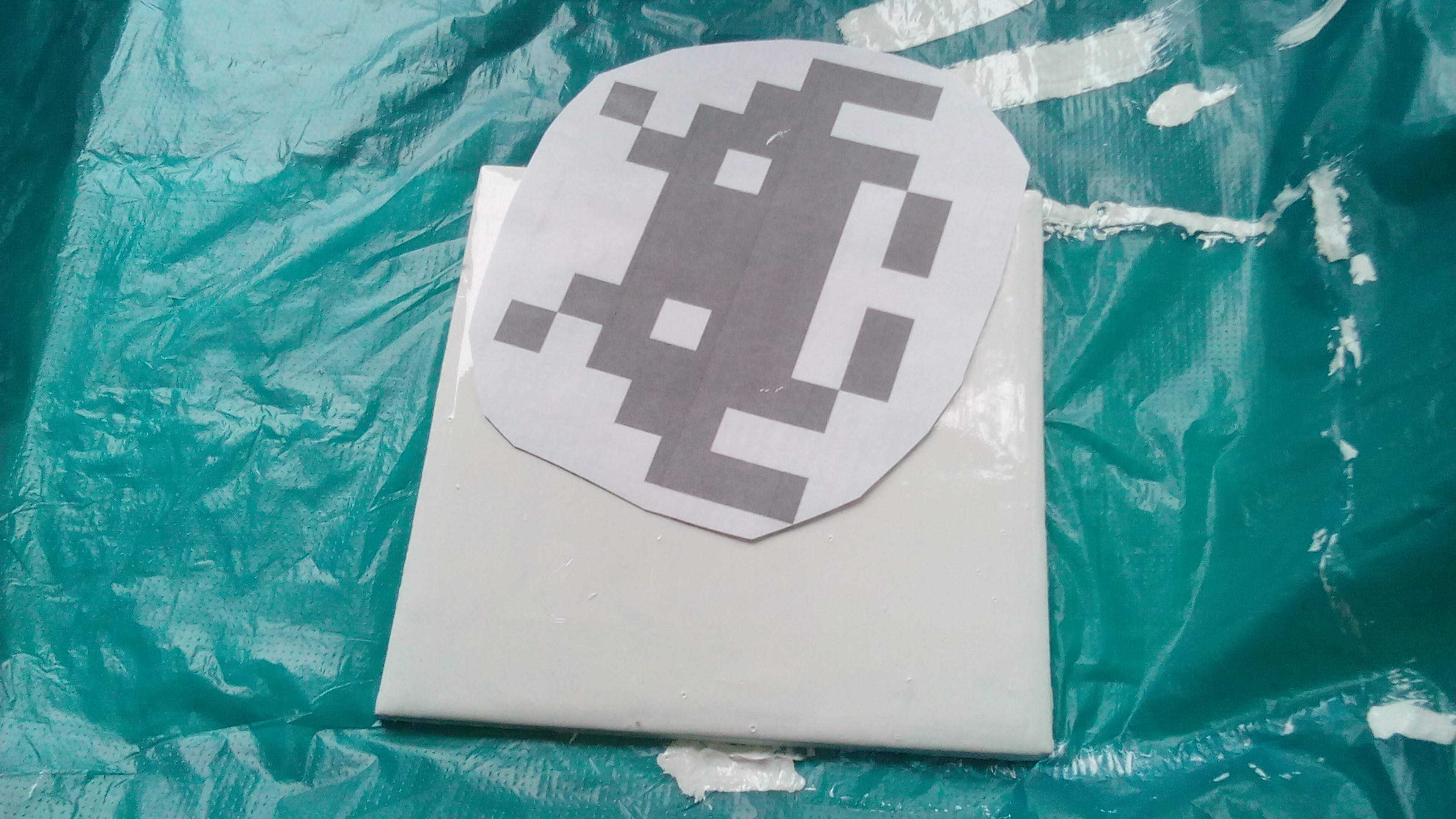 >>206289 Порылся ещё на балконе, нашёл какую-то красную краску. Красная так красная, хули. Сделал трафарет инвейдера (самое простое для тестовой плитки), приклеил на клей-карандаш и закрасил обильным слоем краски, подожду пару дней, пока краска подсохнет и посмотрю, что получилось. Самым сложным было разместить рисунок, чтобы он не перекашивался никуда, до сих пор не уверен, ровно ли положил.