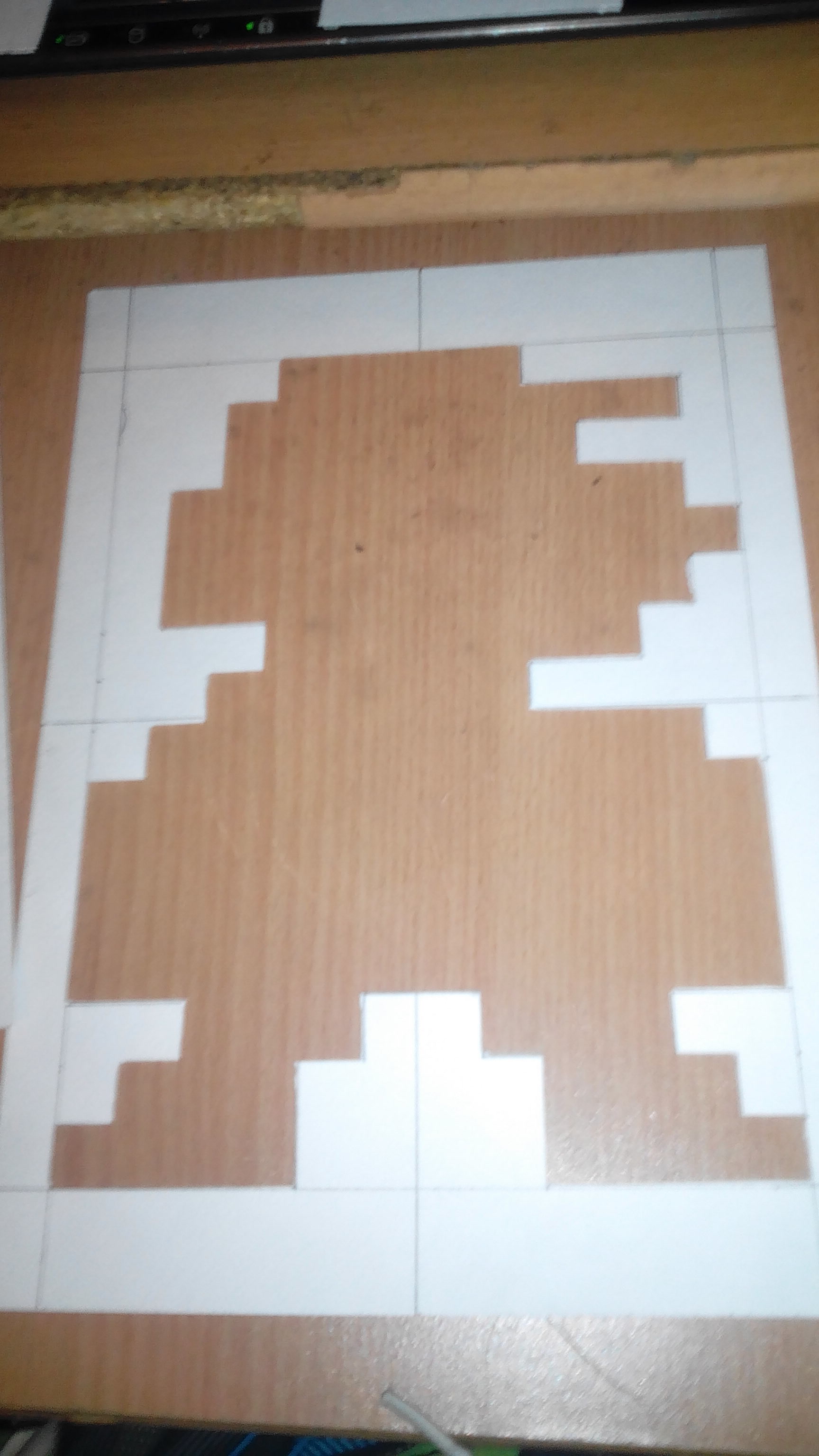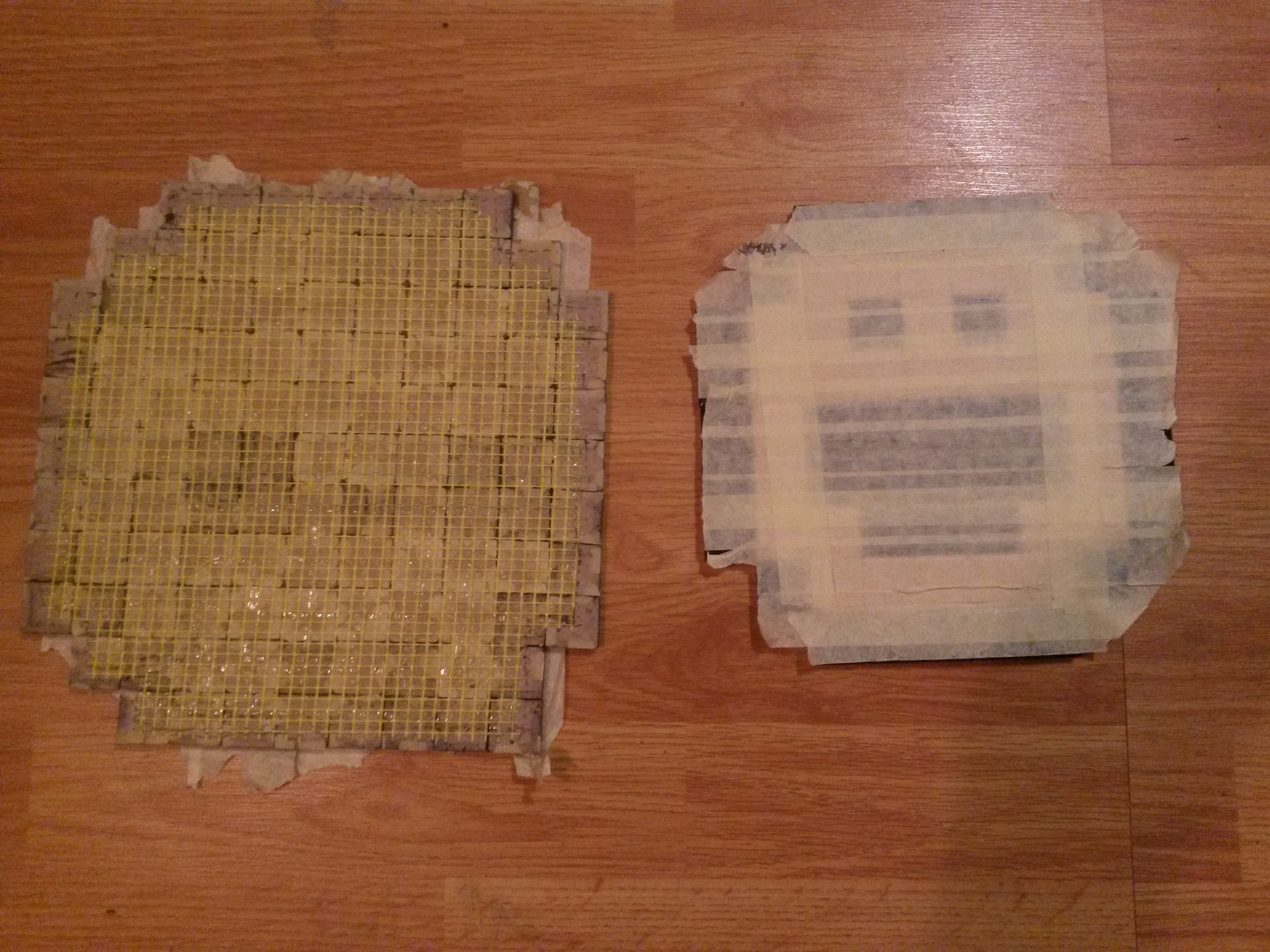Нравится мне тема с мозаикой. Купил в большом строительном магазине однотипной разноцветной мозаики на 900р. Всего получилось 16 цветов. Нашёл на пинтересте для пробы небольшую пиксельартовскую картинку майнкрафтовского зомби. Показал дочери - она собрала картинку из мозаики. Склеил из нескольких полосок малярной ленты клейкий лист на который дочка перенёсла чипы мозаики лицом к клейкой стороне примерно как на картинке с единорогом. Обрезал лишнюю малярную ленту по контуру. Далее решил сделать шаблон для нанесения на стену плиточного клея. Это нужно для того что бы на стене вокруг мозаики стена оставалась чистой и аккуратной. Шаблон сделал из листа А4 заклеив одну его сторону сплошняком скотчем и вырезав по контуру мозаичной фигуры.
