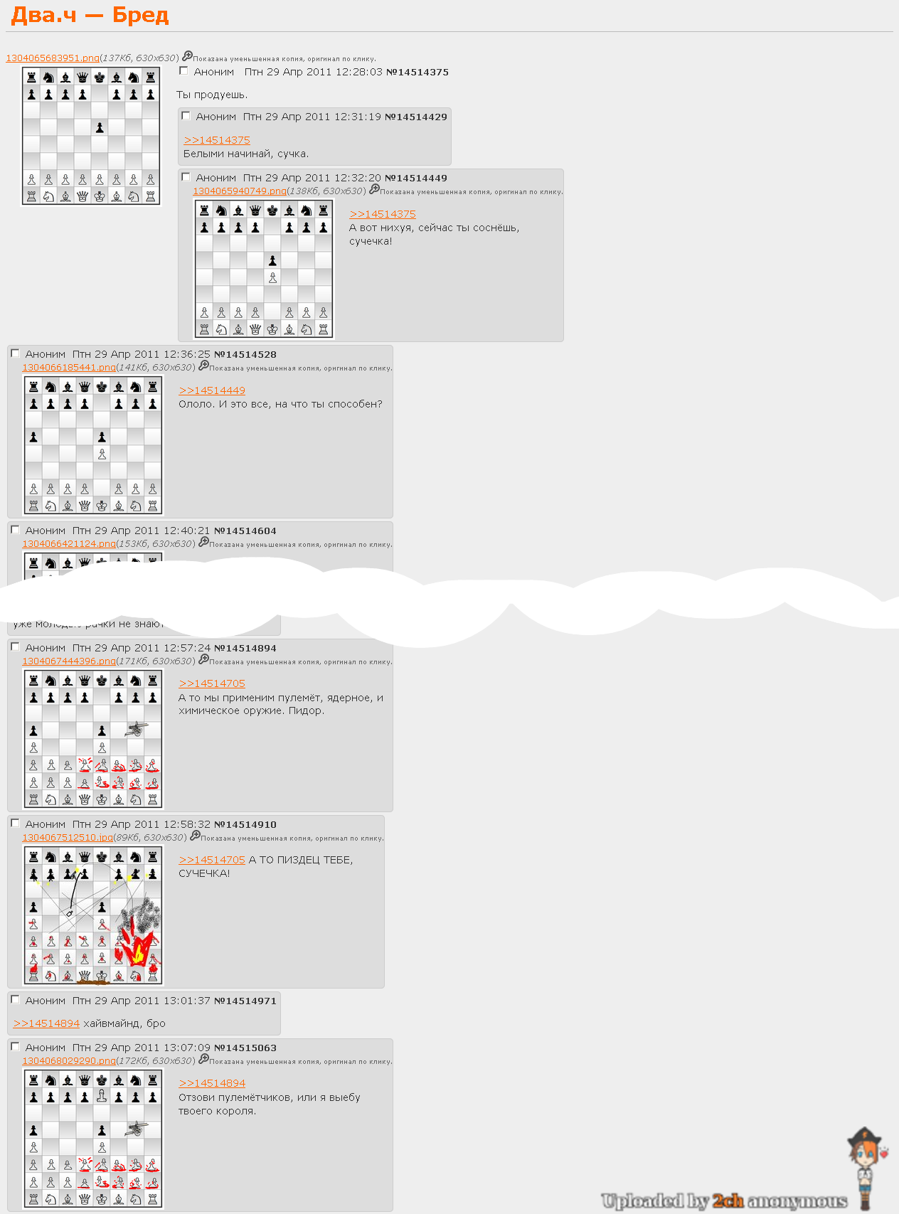 >>754427 Анон, я и не скрывал своего рейтинга, так что с первой строки не попал по самооценке. А про первые линии движка - это скорее метафора, чем буквальный смысл. Сам оцени шахматы: они существуют не первое тысячелетие и до сих пор были живы и интересны. До того как изобрели компьютеры. То, чем раньше занимались целые команды из гроссов, теперь делает в соло комп, расчеты, которые раньше занимали кучу времени и удивляли всех, теперь оцениваются в секунды и просто заносятся в базу данных. Да тех же гроссов оцени сам: чм - Дин, который позорно провел турик с Яном (их игра буквально выразила цитату "в шахматах побеждит тот, кто ошибется предпоследним"), ныне он вообще играть не способен. Остальные гроссы играют сухо и не запоминаются. Магнус, который соло держал планку чемпа и показывал красивую (хоть и сухую позиционную) игру, уже устал от шахмат и пошел маяться всякой дурью.