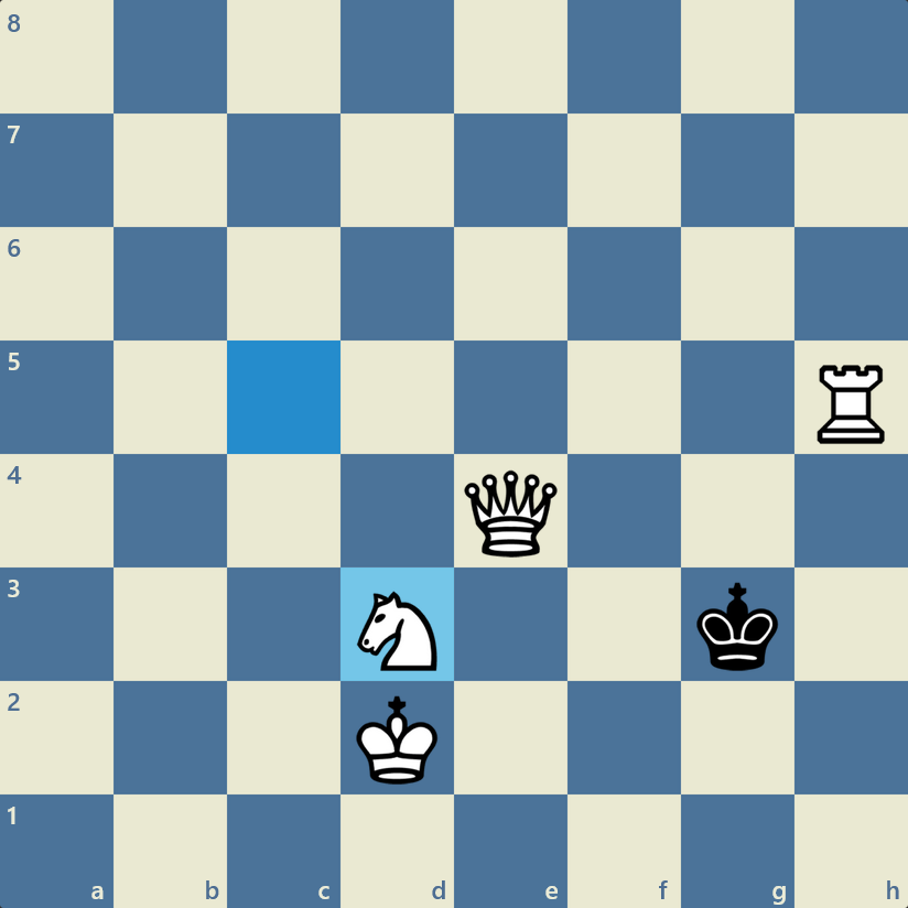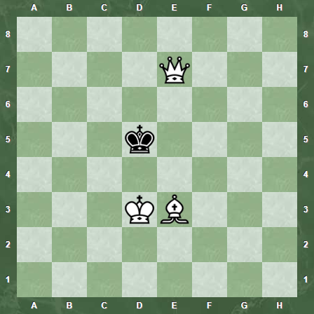 >>454065 Фигуры черных полностью заблокированы, позиция равная, белые ходят только королем по черным полям, так как нельзя позволить белопольному слону выскочить с шахом. При любом отходе слона с F1, последует NxF2#
