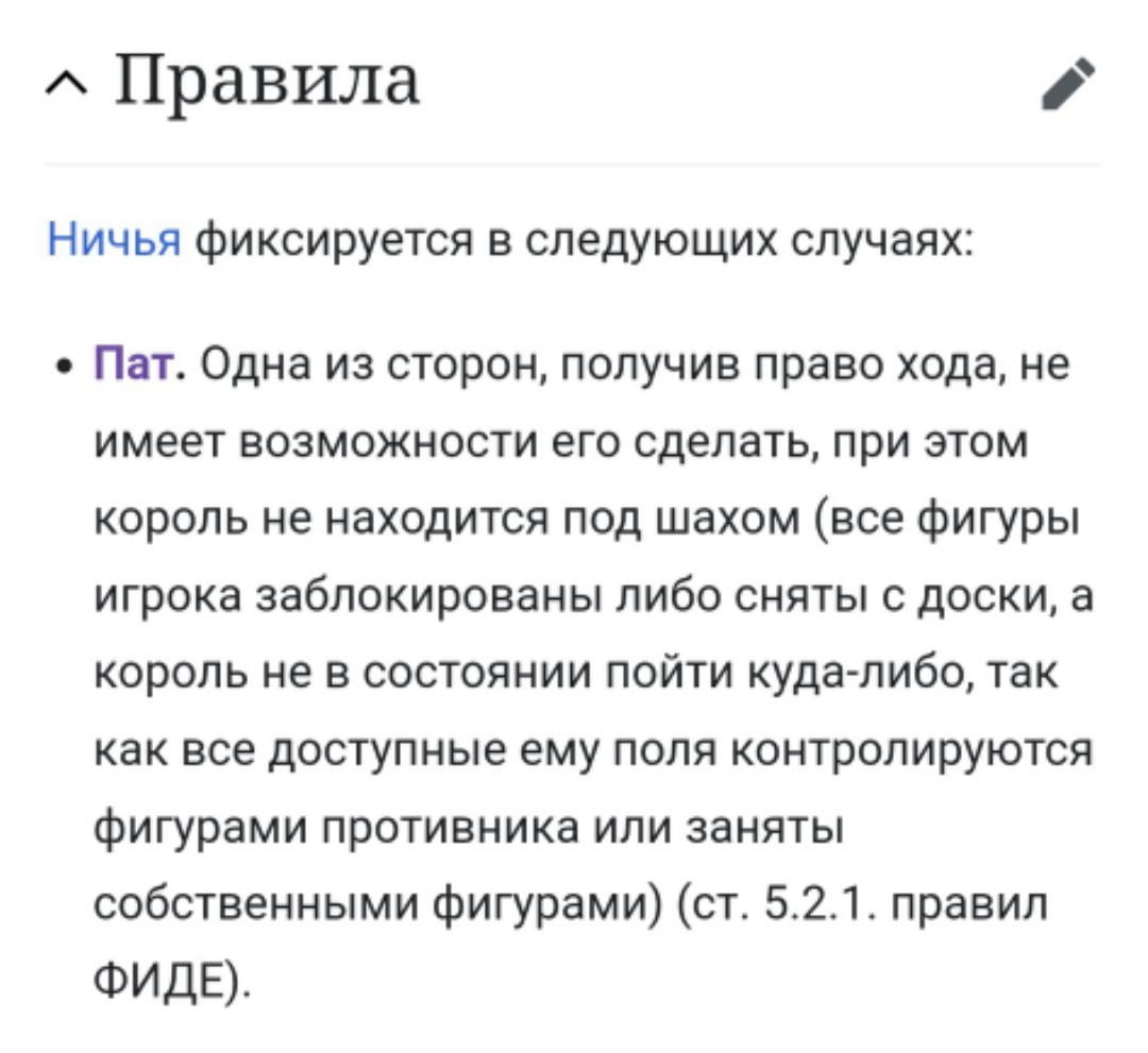 >>669282 Ходить белый должен, все его ходы - шах, значит пат. Если бы ходил чёрный, то он бы мат поставил. >>669300 Тут так же. Белый УЖЕ сходил, теперь ход чёрного, и любой ход - шах. Важно кто в данный момент ходит крч.