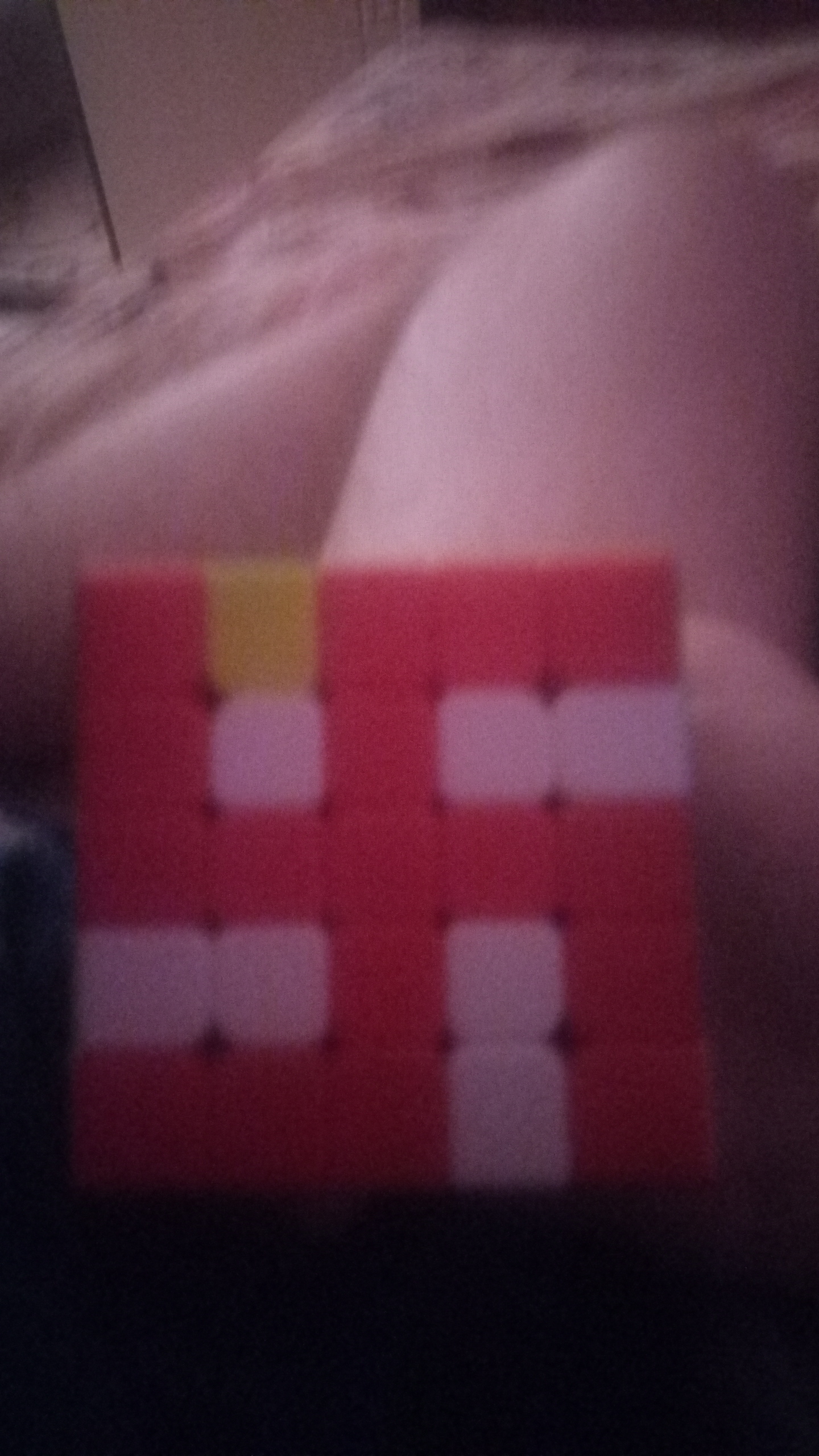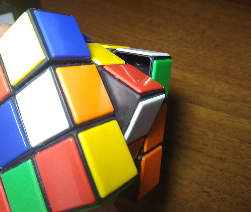 Это говнище изначально совершенно отказывалось вращаться, по причине залитости клеем где нужно и где не нужно. После расклинивания отверткой и ножом, это дерьмо стало поддаваться вращению но со страшным кряхтением и заеданием, не принося ни капли удовольствия от изучения головоломки. Качество этой поделки можете оценить по этим двум фото На первом пике верхняя, левая грань налеплена вообще не той стороной, на зеленой грани клей