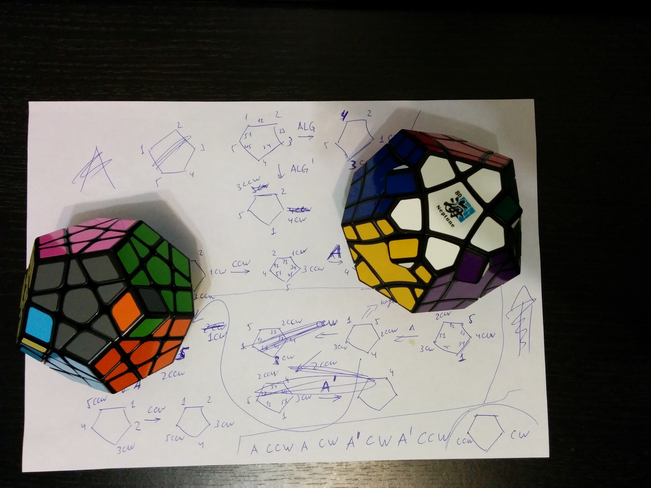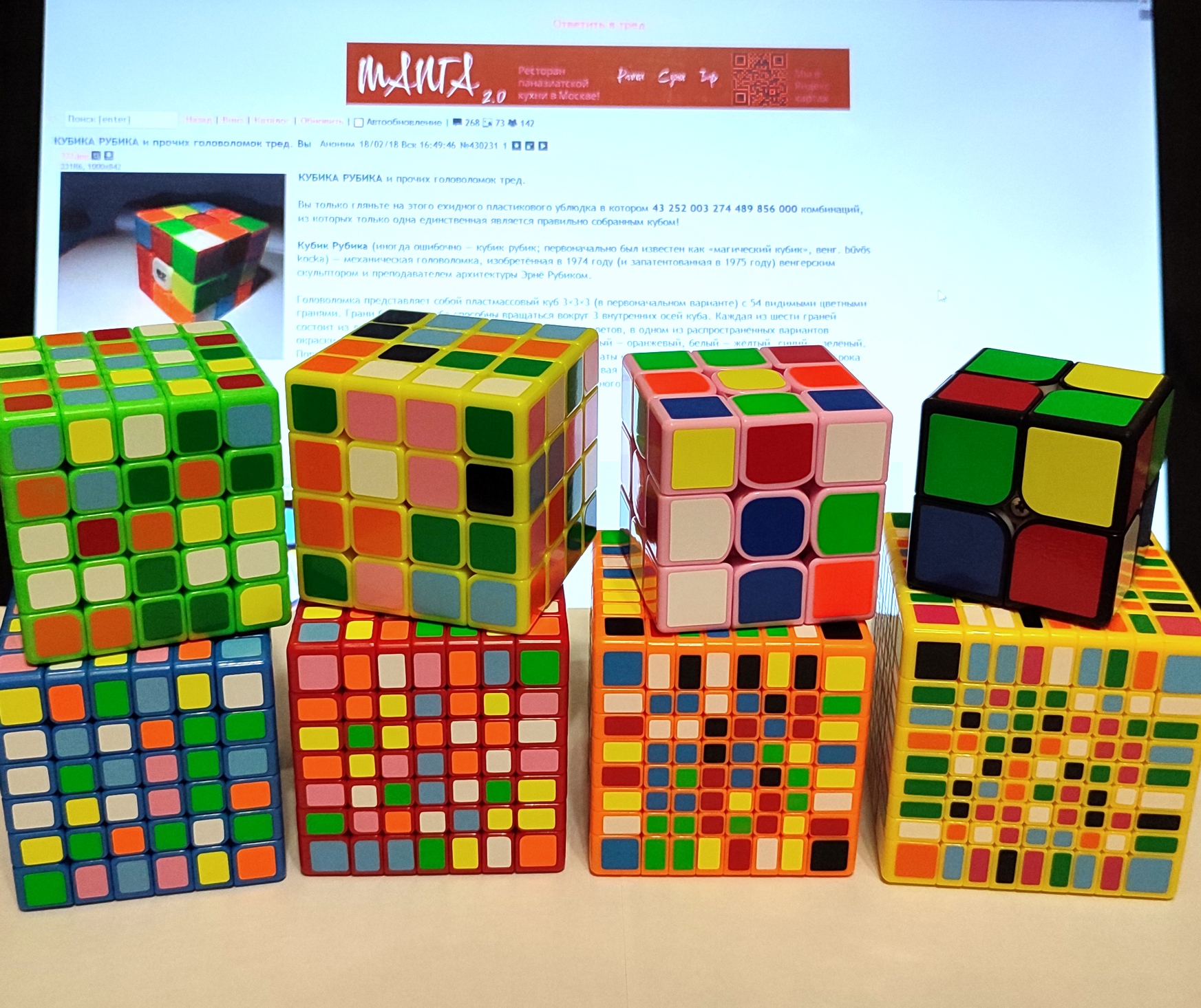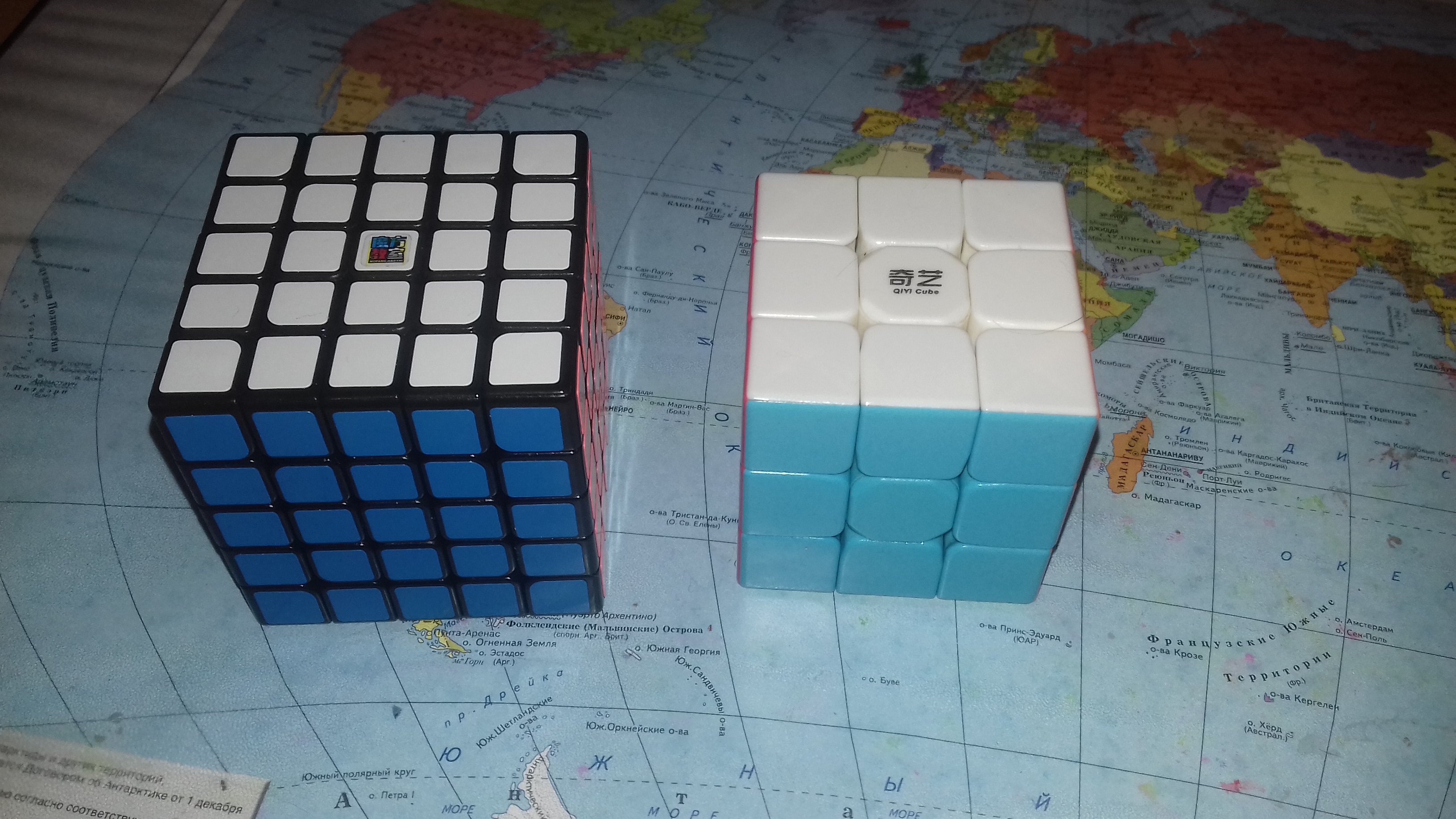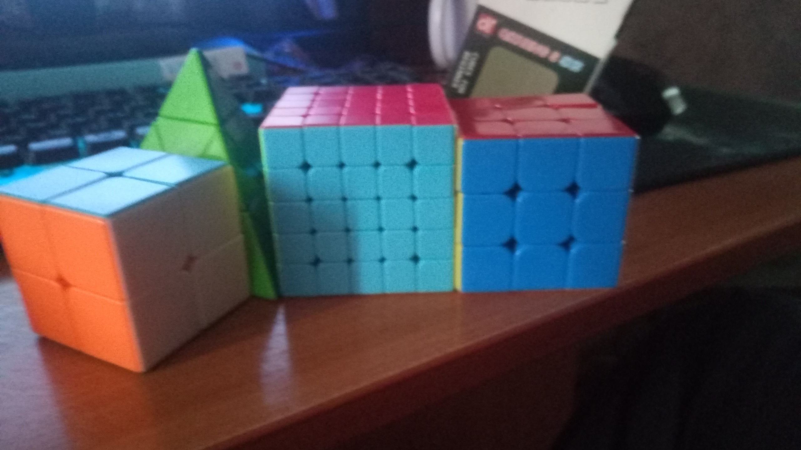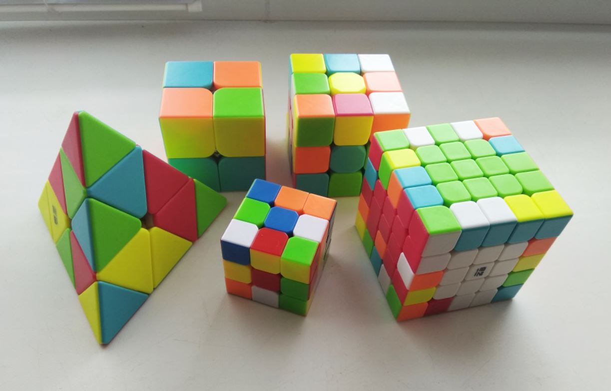 Пополнил коллекцию. 2х2х2 забавный, не такой простой, как казалось изначально, но таки проще, чем 3х3х3. Пираминкс тоже достаточно прост в сборке, пока тоже не зацепил. 3х3х3 40мм - мелкий пездюк. Компактный, но для скоростной сборки не годится. Углы почти не режет 5х5х5 вот это уже поинтересней штуковина. В начале собираются центра и ребра, а дальше уже собирается, как трёшка. Часто в процессе сборке случаются тупиковые ситуации, решения которых, без шпаргалки я хрен решаю.