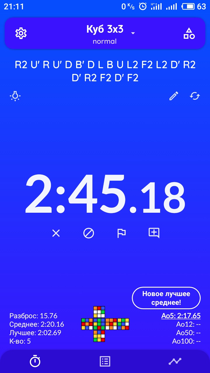 >>431082 До этого мне еще наверное далеко, пока даже стабильно менее двух минут не выходит. Спасибо за совет про сборку креста снизу! Читал, что правильный крест можно собрать менее, чем за восемь движений, хочу уточнить: считается ли R2 или U2, например за один ход или за два?