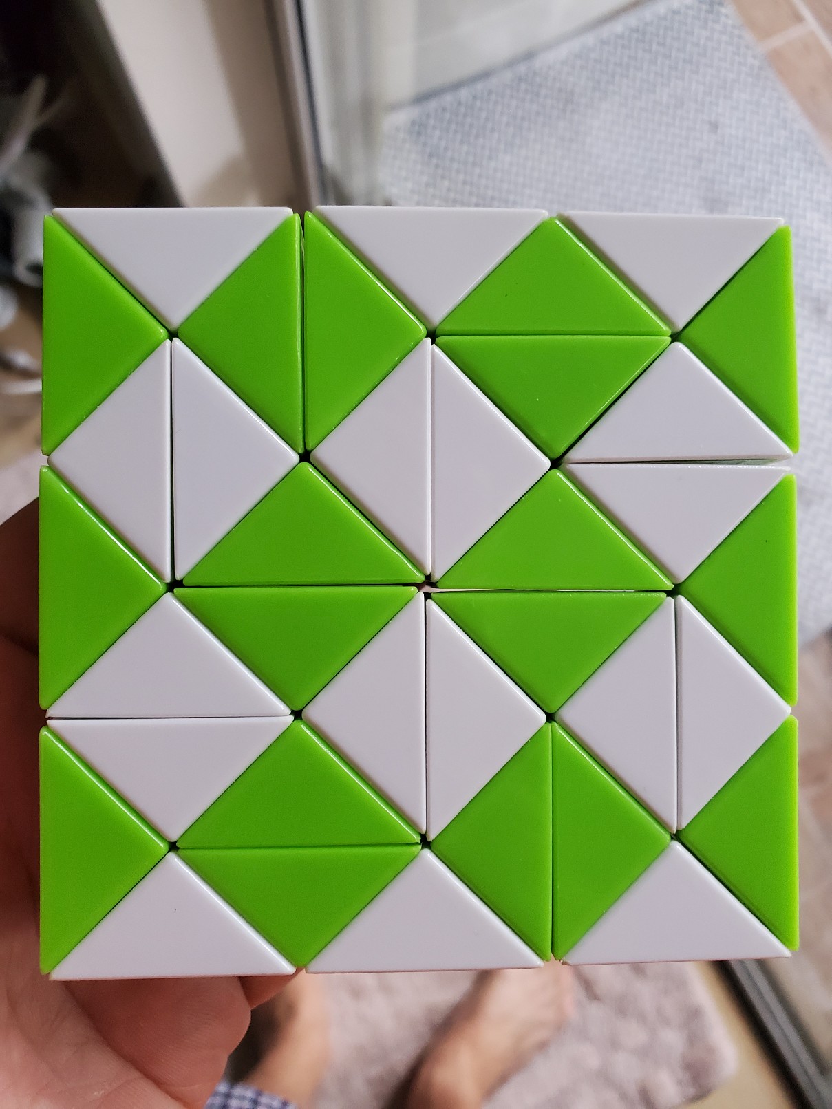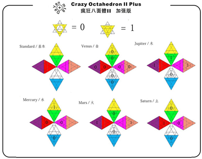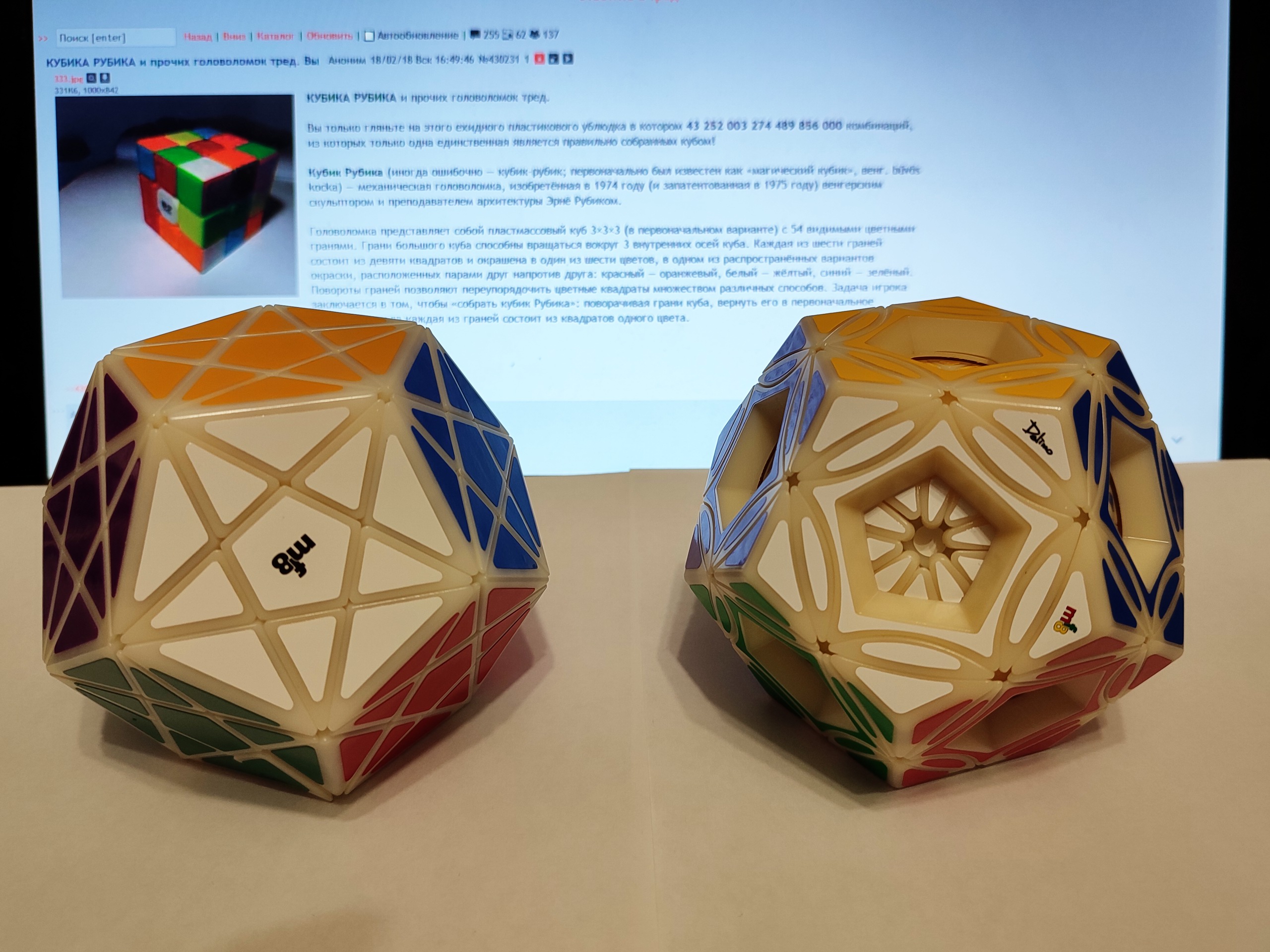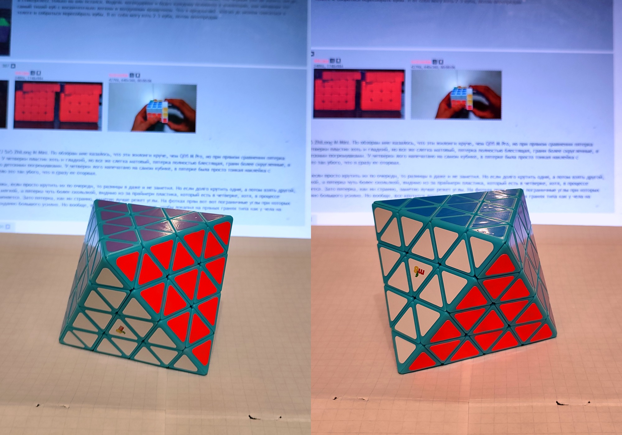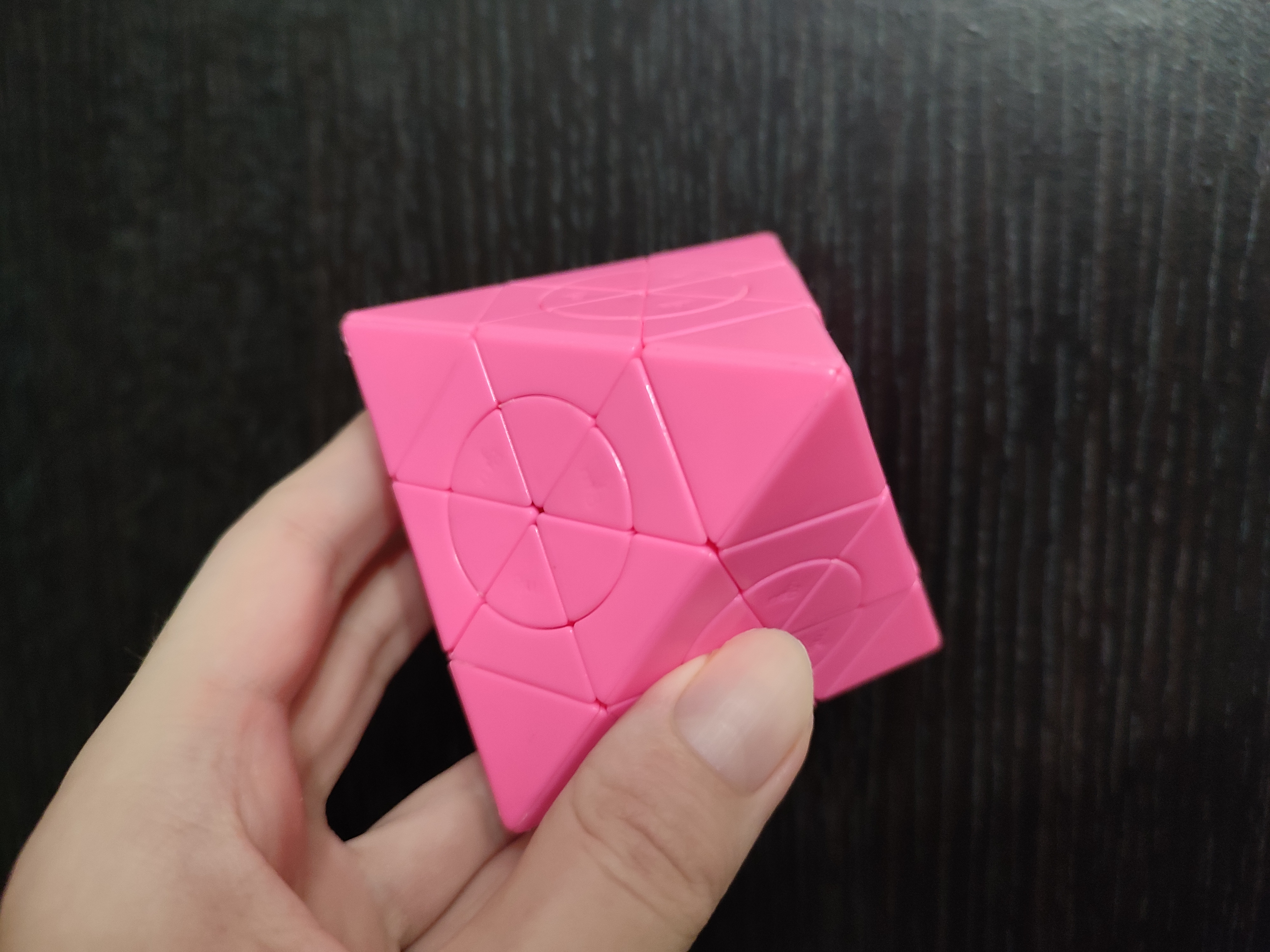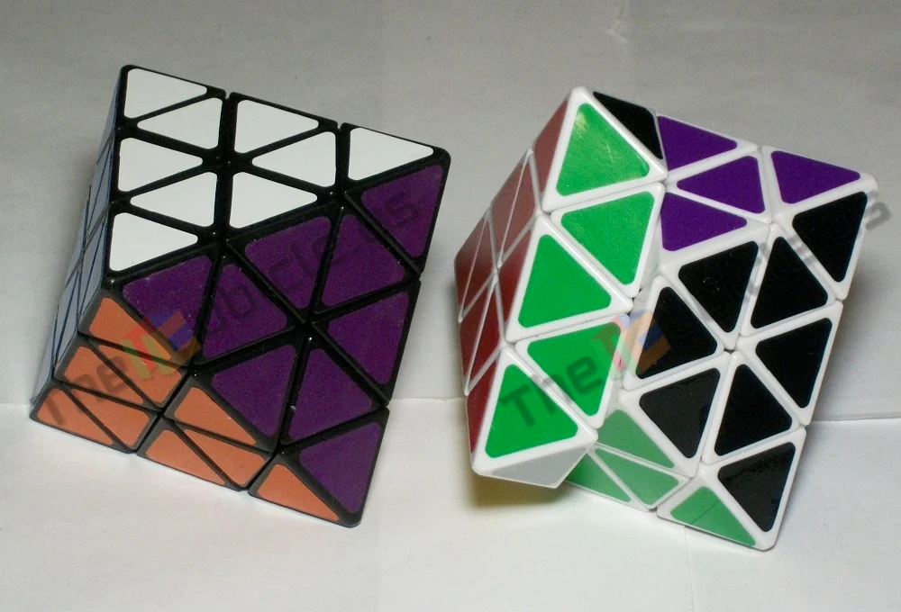 Или пикрил 2, LanLan 4x4 Octahedron. Это тоже просто 4x4, но в форме октаэдра. То есть восемь цветов, которые соответствуют углам куба, а не сторонам куба. Тоже существенно меняет подход к решению, хотя казалось бы, все детальки на месте, буквально тот же самый предмет, только "сточенный" в другую внешнюю форму.