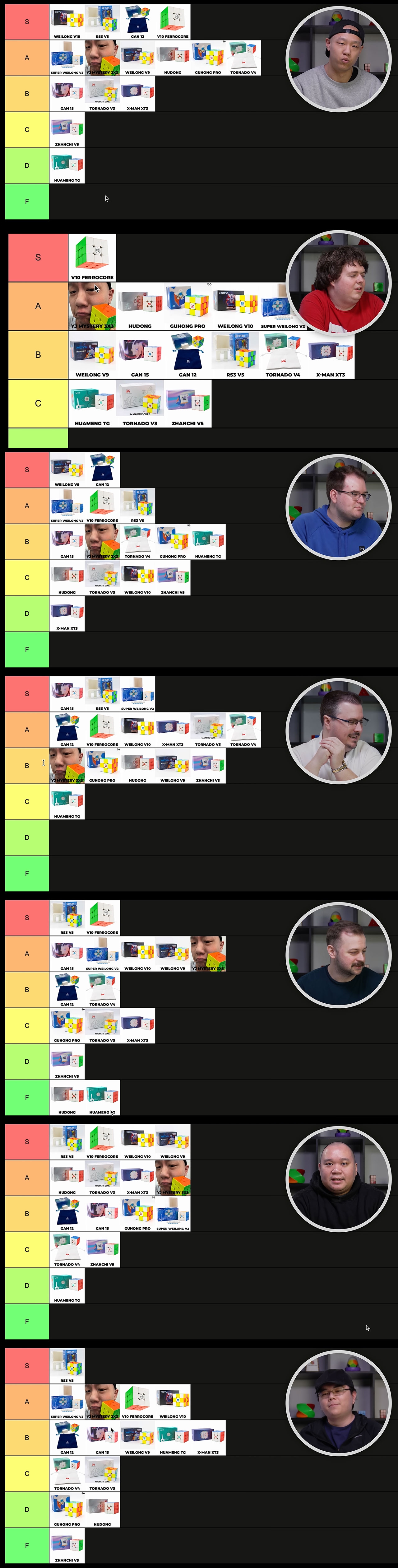 >>817193 >Все это субъективщина Именно к этой мысли ты и должен был прийти после просмотра видео. Лол. 7 человек протестили 15 кубиков и у каждого получился разный список. А уж они-то за жизнь наверняка сильно побольше тебя разных кубов перепробовали, есть с чем сравнивать, но все равно у каждого в итоге свои предпочтения. Пока в своих руках не подержишь все эти списки ничего не значат.