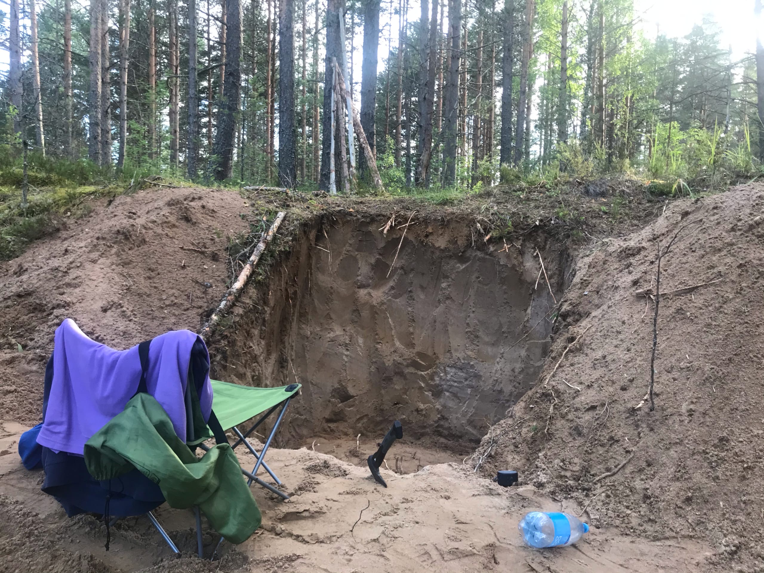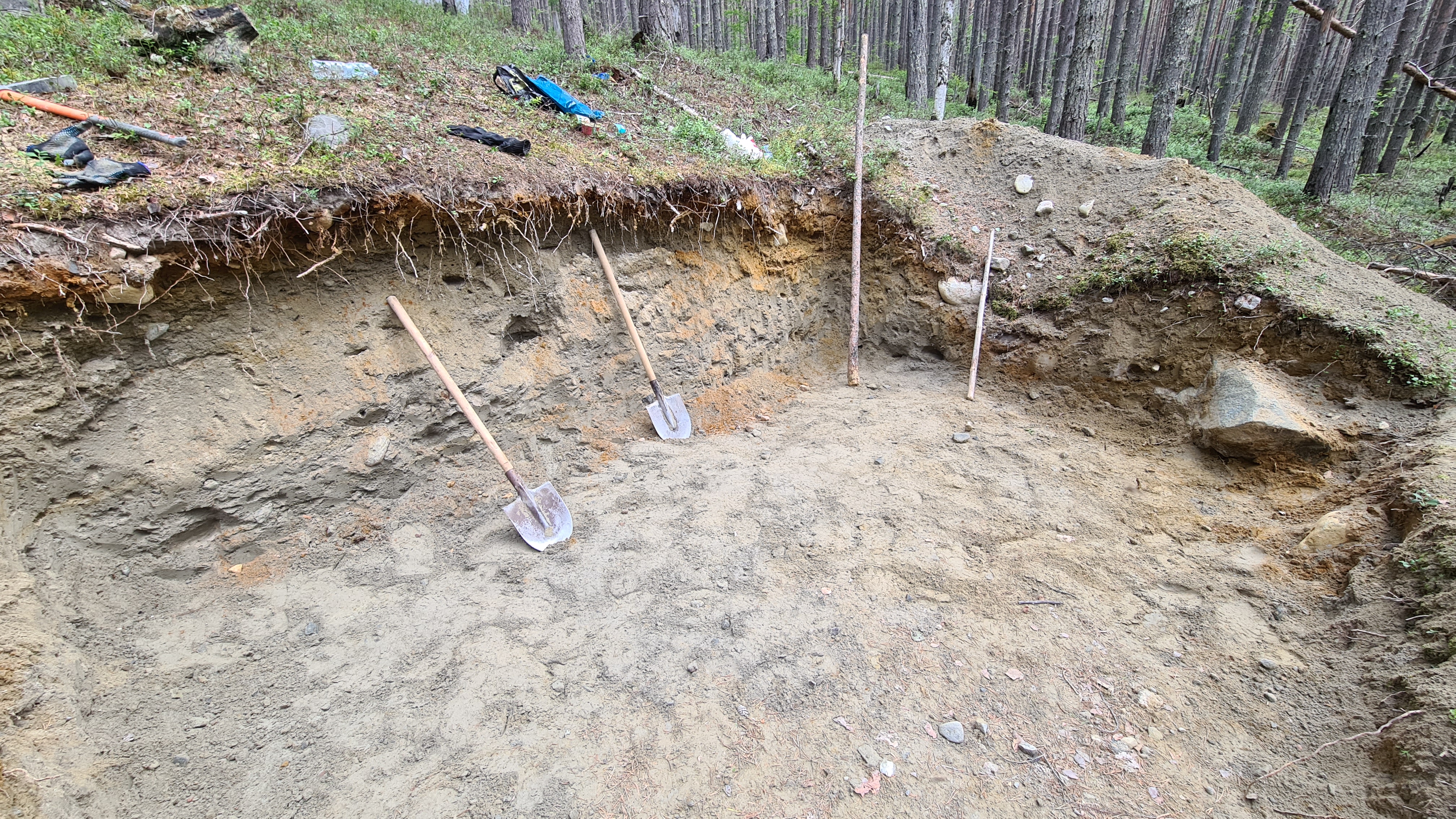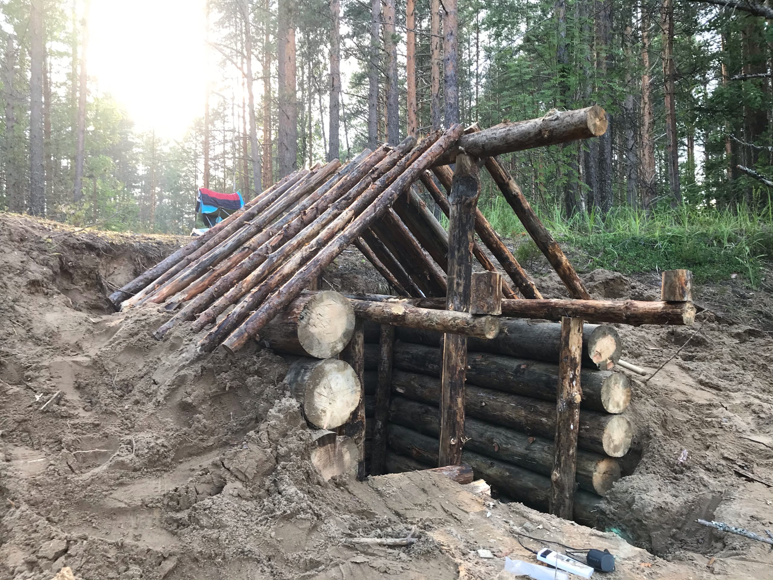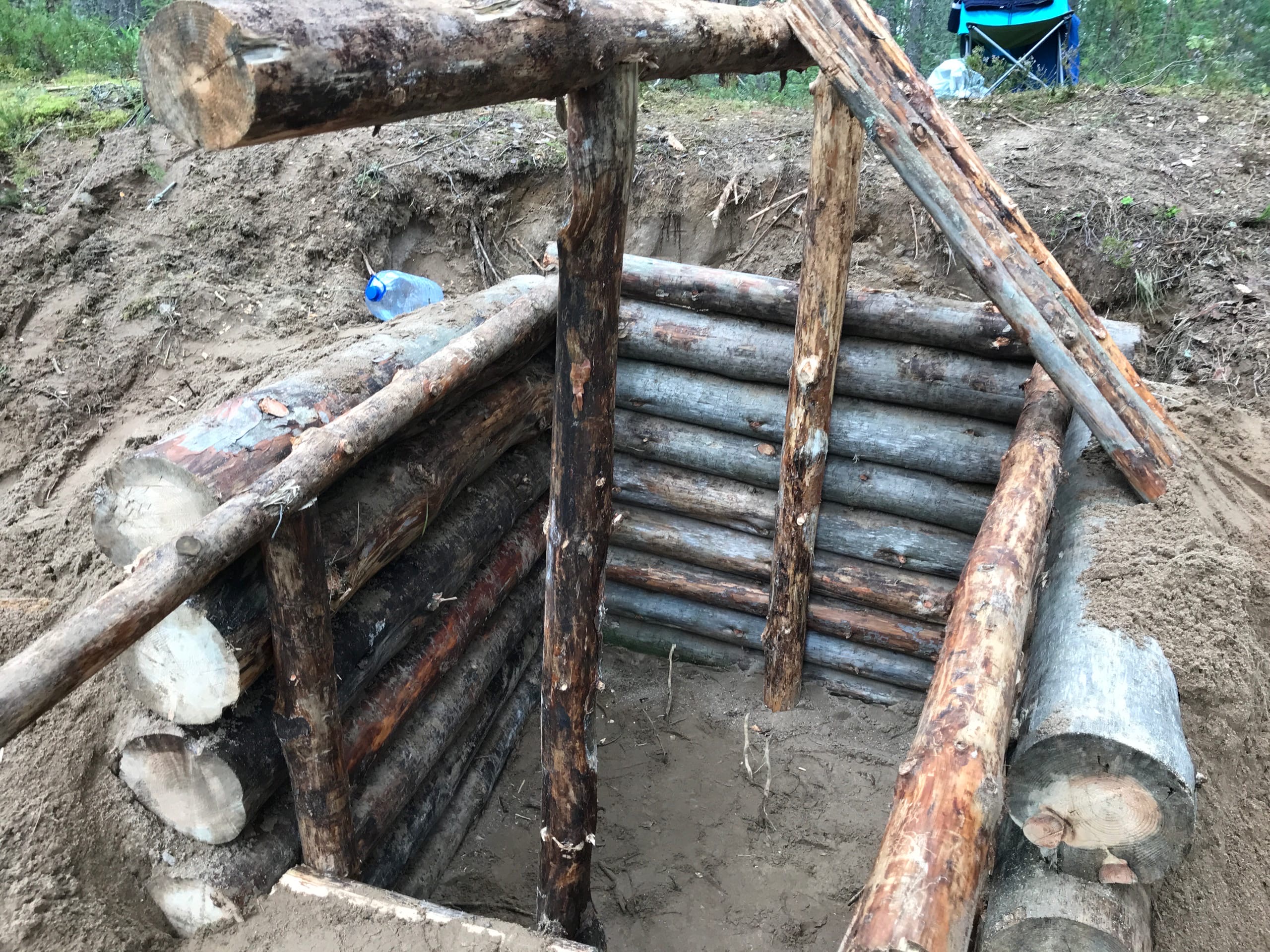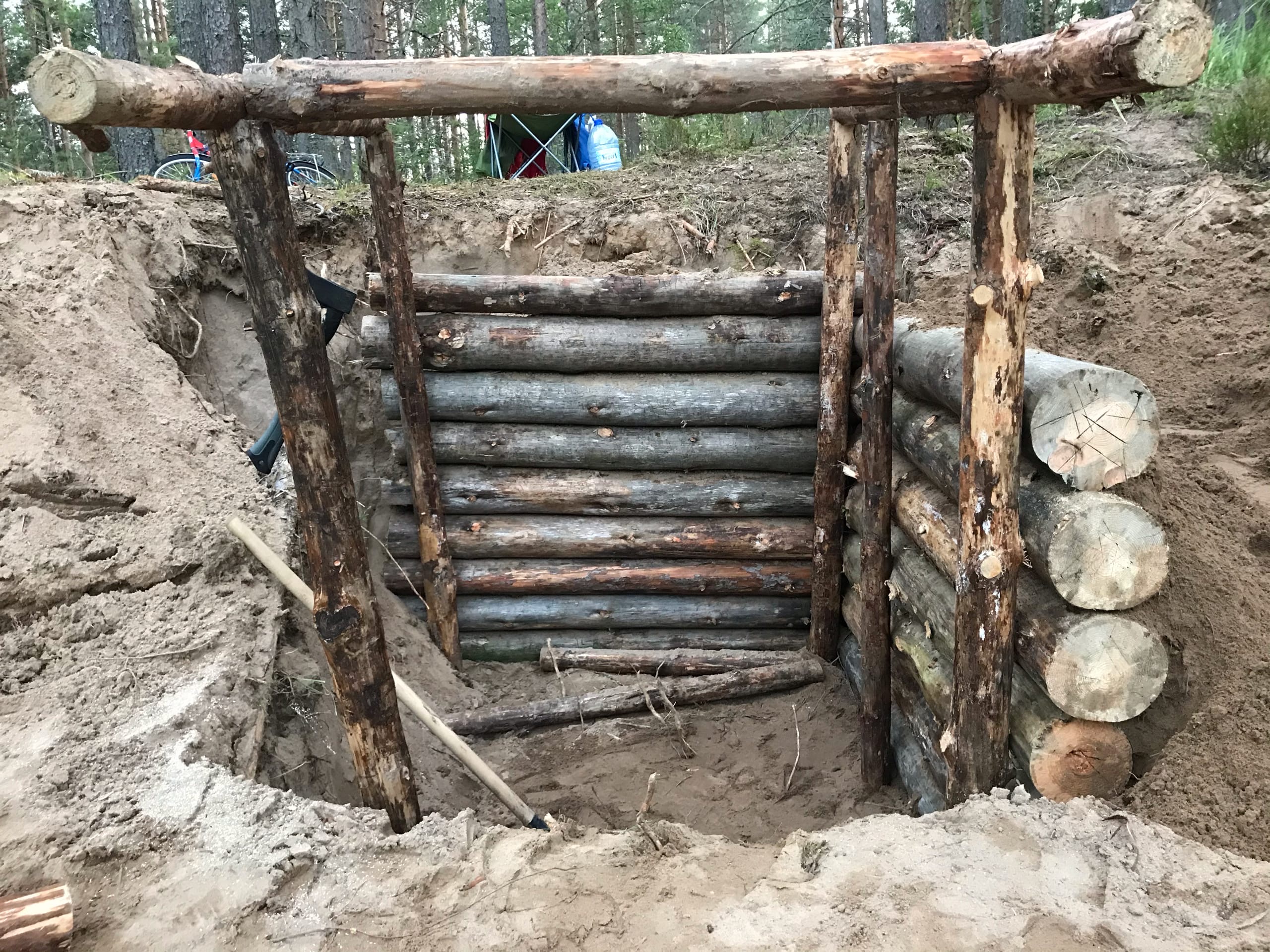 К сожалению, почва в регионе каменистая, поэтому могу похвастаться только ямой, но работы идут вовсю. Глубина 1,5 м, размеры 3х4 м. Землянка рассчитывается на 2 человек, соответственно, на 2 лежака, печку, столик и место для хранения вещей.