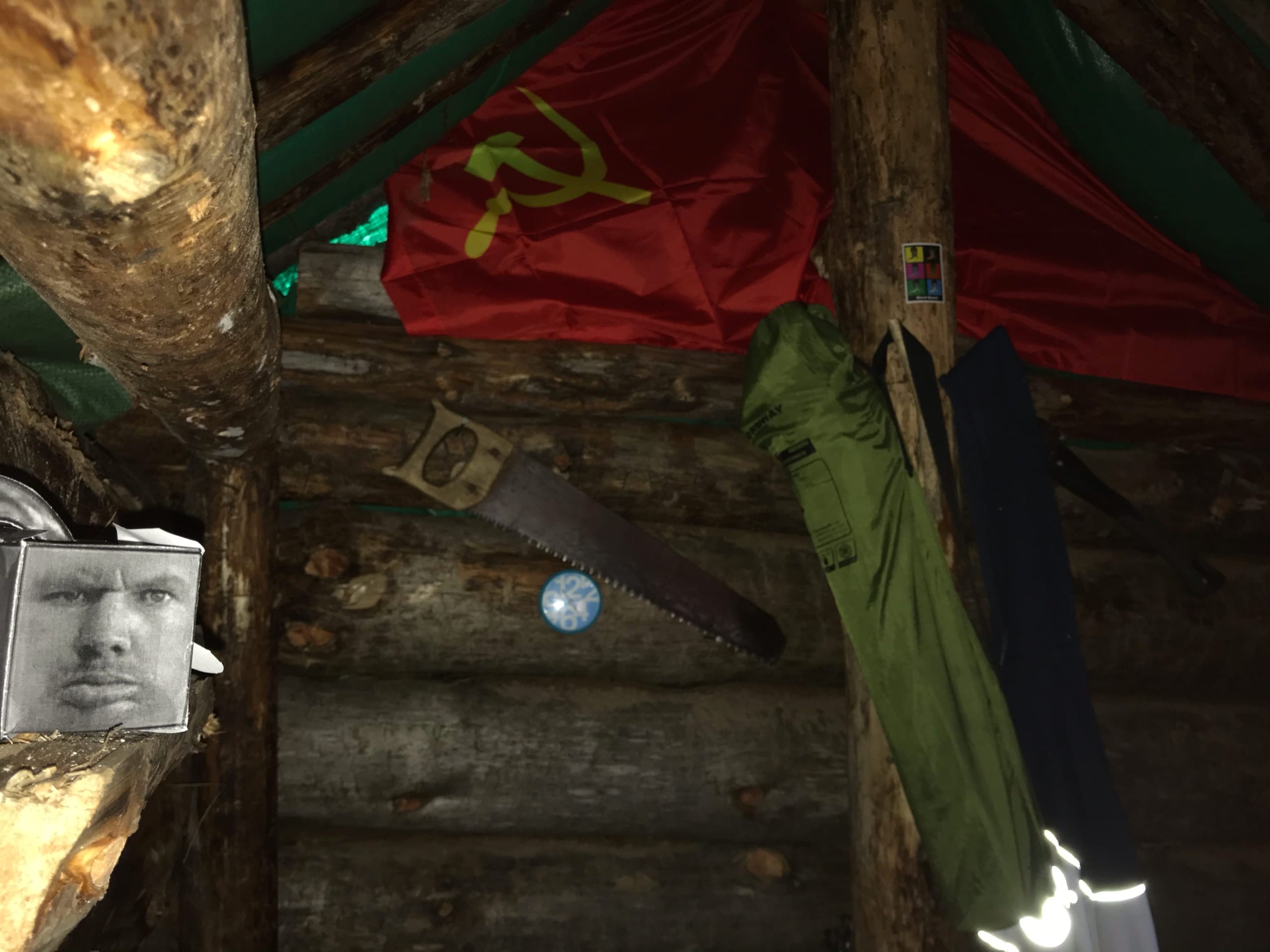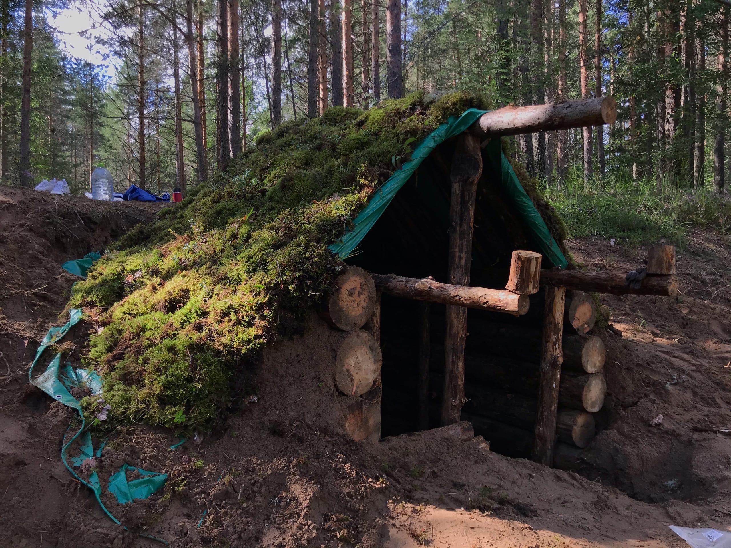 -Помимо топора, лопаты и гвоздей пришлось прикупить строительный тент, чтобы защитить крышу от дождя. -Для скрытия уродливой зеленой хуеты нарвал под трассой мха. -Пластиковое окно-бойница, как в толче у бабки в деревне, спиздил с ближайшей помойки. -Сколотил дверь