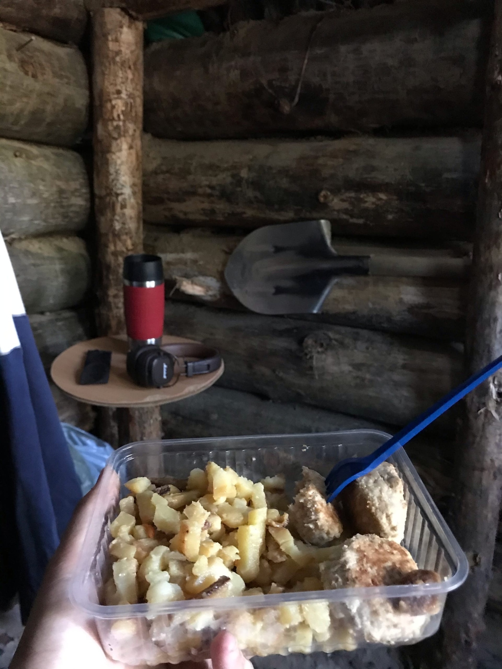 Небольшой маленький совет, насчет топлива дам, хотя он необязателен для исполнения, ты и так неплохо справляешься. Печь ты не планируешь (пока что), но будь печь, или просто костер, ночевать как я вижу ты планируешь. Нужна ДРОВНИЦА небольшая, почему? Дожди. Ты в любой день приезжаешь - у тебя всегда есть сухие дрова на обогрев целой ночи, или днем пищу приготовить по фану, ууух. Когда собираешься покидать землянку, наполняешь дровницу уже нарубленными дровами, даже если они и сырые, подсохнут. Но как мы видим в самой землянке место и так не много, только самое необходимое жизненное пространство, хотя ты в этом и выиграл... хата быстрей протопится, тепло сохранять будет дольше. Так что можно недалеко от хаты, или вплотную, сделать что то типа ящика с крышкой для дров, и замаскеровать его, камуфлировать под ухаб, неровность поверхности, землей вокруг присыпать, округлить форму, сверху на крышку мха, веточек, как обычно. Вот. Это конечно на твой вкус. Что бы ты не на погоду смотрел, блин дождь, че делать, а на желание кайфово заночевать при звездах.