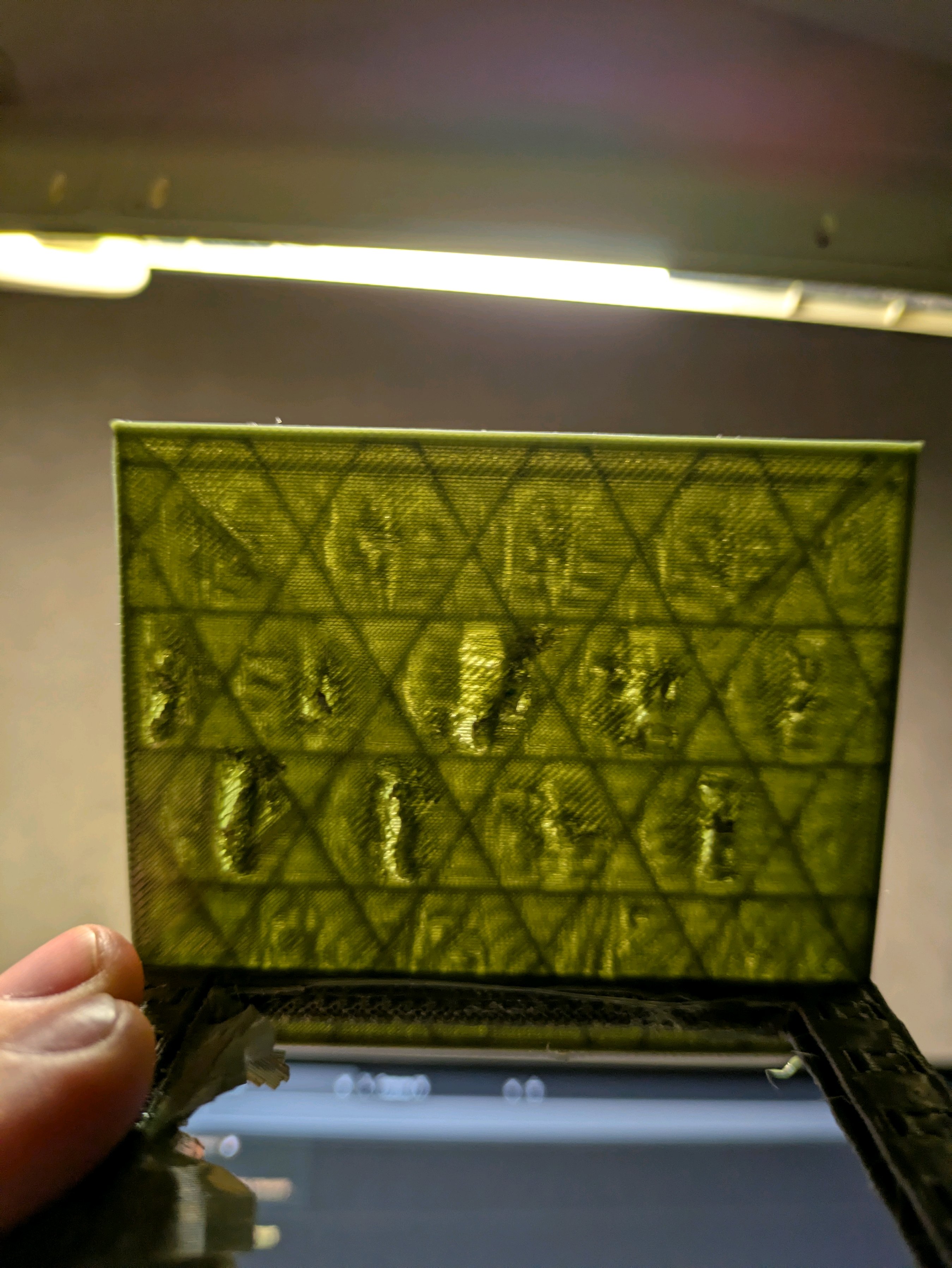 >>818785 Да у тебя тут всё говно. Начиная с проекта, нахуя ты лист печатаешь? Ну и да, увеличивай заполнение. А лучше количество краевых слоёв увеличь пока верхний и нижнний не встретятся чтобы это стало монолитной деталью.