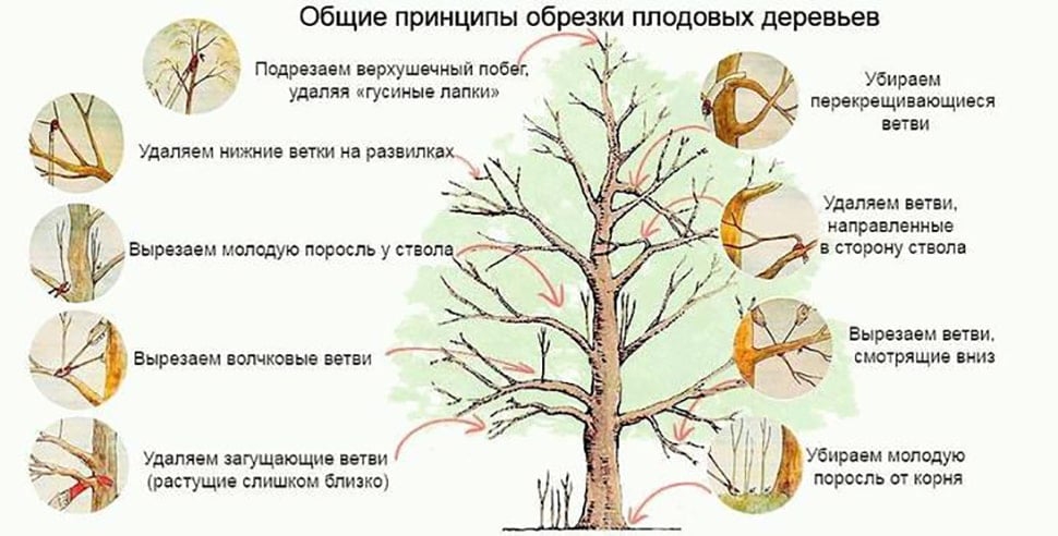 Есть несколько типов обрезки плодовых деревьев: формирующая, санитарная, детальная, омолаживающая. Очень важно понимать, какая нужна твоему дереву сейчас, но в любом случае мы делаем санитарную, весной, немного летом, и осенью: удаляем прикорневую и приствольную поросль, ветки, растущие вверх (волчки), вниз, внутрь кроны, перекрещивающиеся, провисающие, больные, сломанные, сухие, паралельные (они же загущающие, растущие слишком близко в одну и ту же сторону).