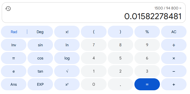 >>801559 1 га это 10к квадратных метров, если твои предположения о площади верны, то нужно разделить полторы тонны на 9.48 * 10к, это будет примерно 16г Ну это же школьная арифметика же ну...