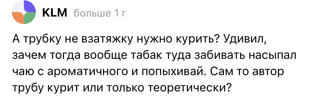 Анон, научи, как чувствовать вкус дыма. Взял батину трубку BigBen бильярд, которая 20 лет лежала в шкафу (подарили, но он не курит), взял вроде бы неплохой табак Peterson Old Dublin, по крепости он вроде считается средним. Аромат табака из банки такой вкусный, что его хочется даже сожрать. Но вот как только начинаю курить, то для меня все это превращается в обычный "дым от костра" или жженой бумаги, какие то нюансы вкуса конечно есть на фоне, но дымная гарь все перебивает. Сигареты никогда не курил если что.