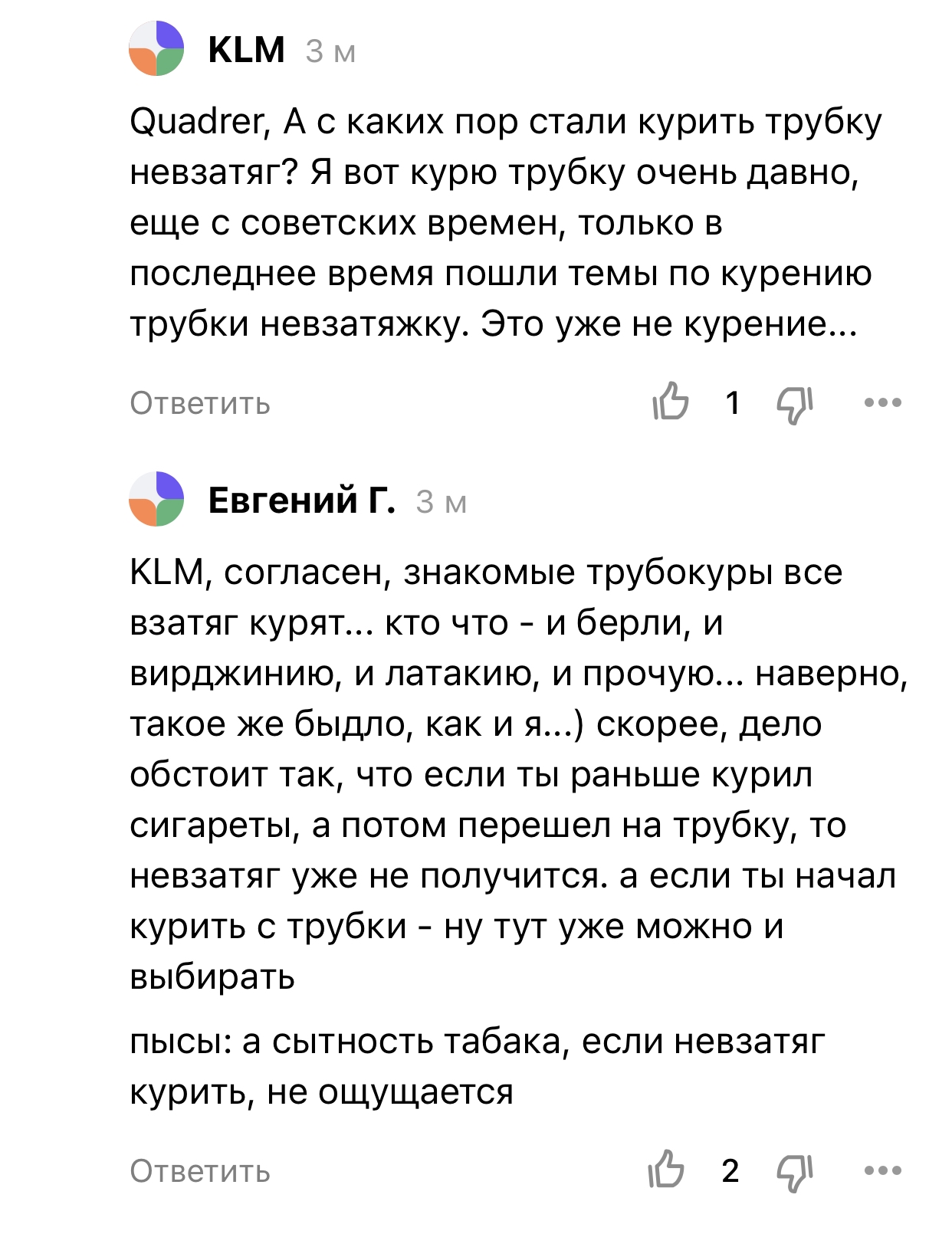 В целом табак сейчас в идеальном состоянии для курения. После курения трубки - очень глубокий и насыщенный, я бы так описал. Но я в целом не курящий и табаков пробовал не очень много. И во времена когда свободно все продавалось и был широкий ассортимент. Поэтому правда ли он так хорош как мне кажется, доподлинно не выяснить.