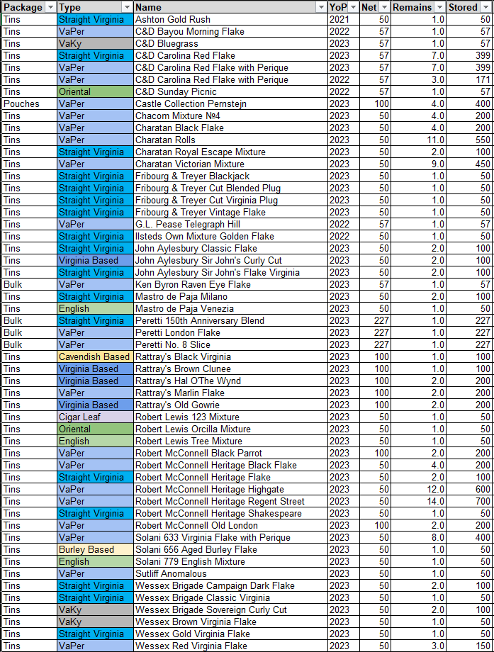 >>765422 На сегодня 11 банок/кисетов открытых (в стекле), 139 невскрытых, и 15 едут (из тех что официально не импортируются). По весу 8+ кг, с открытыми 9+.