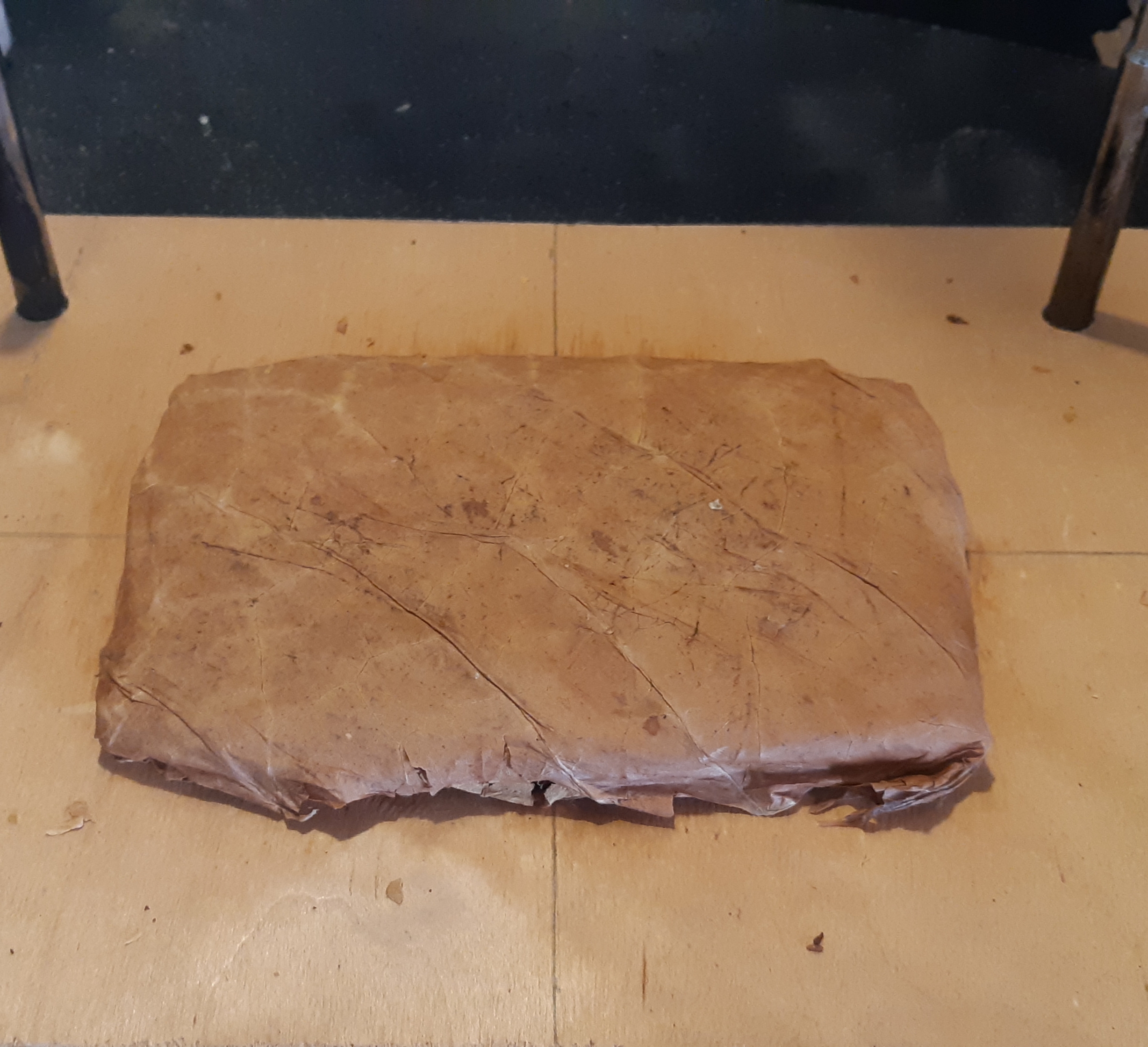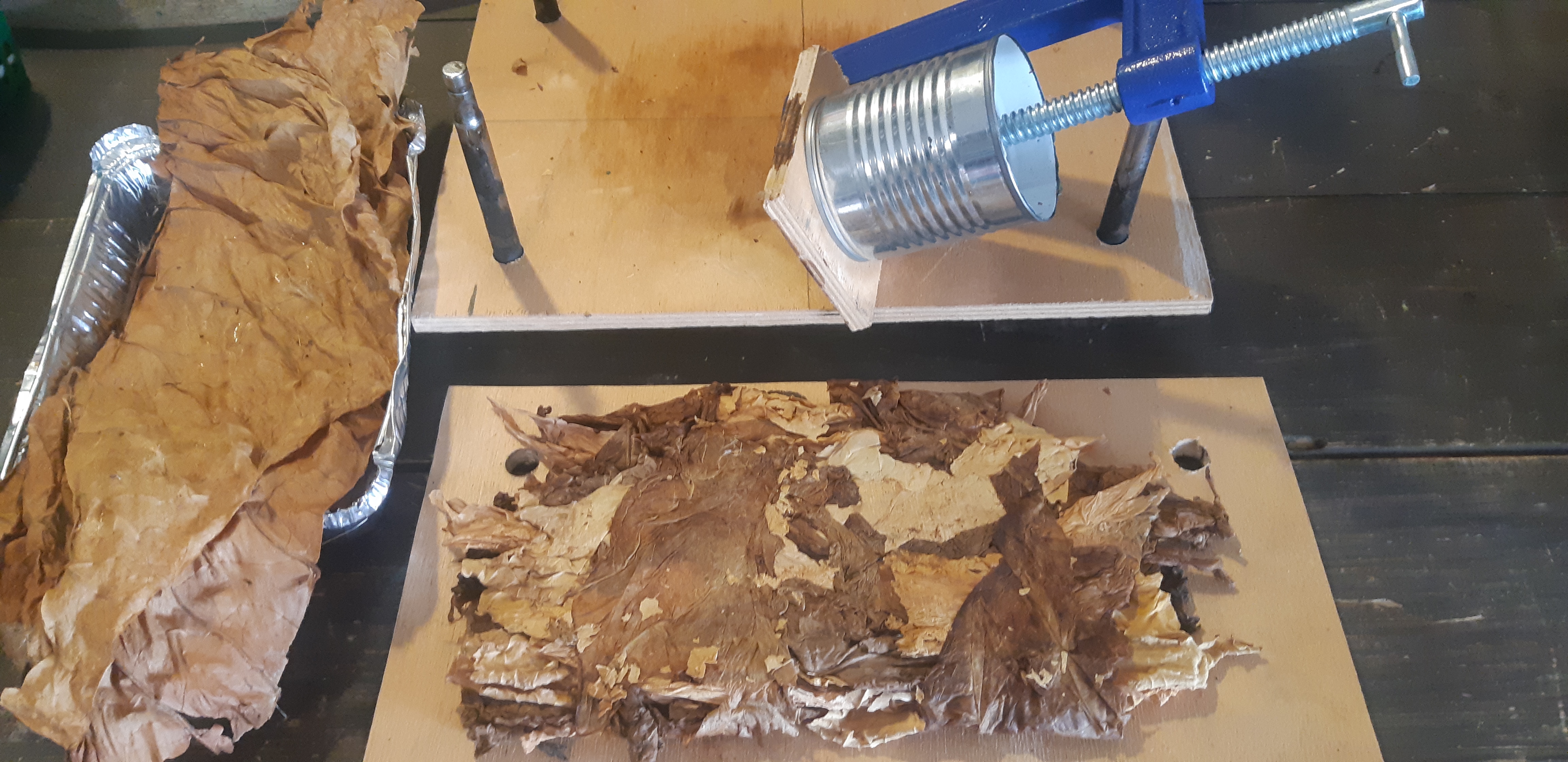 Получилось не очень. Несколько лет назад с первого раза сделал лучше. В "прессе" ~272.6см, рядом лежат ~111.9см. Вирджиния и берли. Ушла полная банка табака. Эту банку считал за контрольную и час держал открытой перед транспортировкой, видимо слегка пересушил, были листы с суховатыми частями по краям. Стоит проверить остальные и "пшикнуть" при необходимости. Сигары средней плотности, до завтра дам полежать, потом заверну в самый красивый лист, если найду.