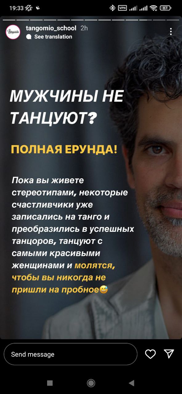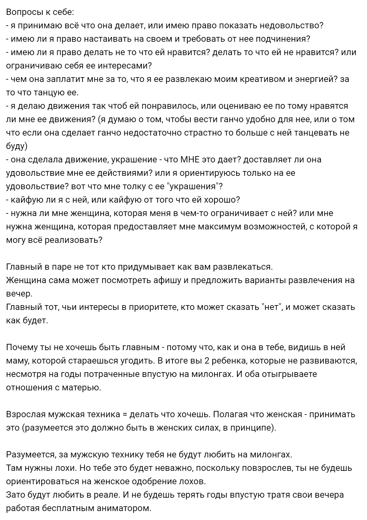 Короче говоря возвращаясь к проблематике. Я вот узнал, что в свое время Эльвира Малишевская, лет 15 назад набрала группу мужиков, причем даже вроде их отбирала, и учила, говорят, бесплатно. Спустя 15 лет из этих мужиков сразу несколько преподавателей в ДС-2. Кстати такие, с котоыми пивка хочется бахнуть. Я на свое танцевание отдаю в месяц минимум 15к. Я-то могу позволить, но это недешево. Если бы каждая школа брала бы по 3-5 молодых пацанов в год за околобесплатно, с условием волонтерства и всего такого, то через полтора-два года на милонги вышли десятки клёвых пацанов, а за ними потянулись бы и клёвые бабы. А там и все остальные.