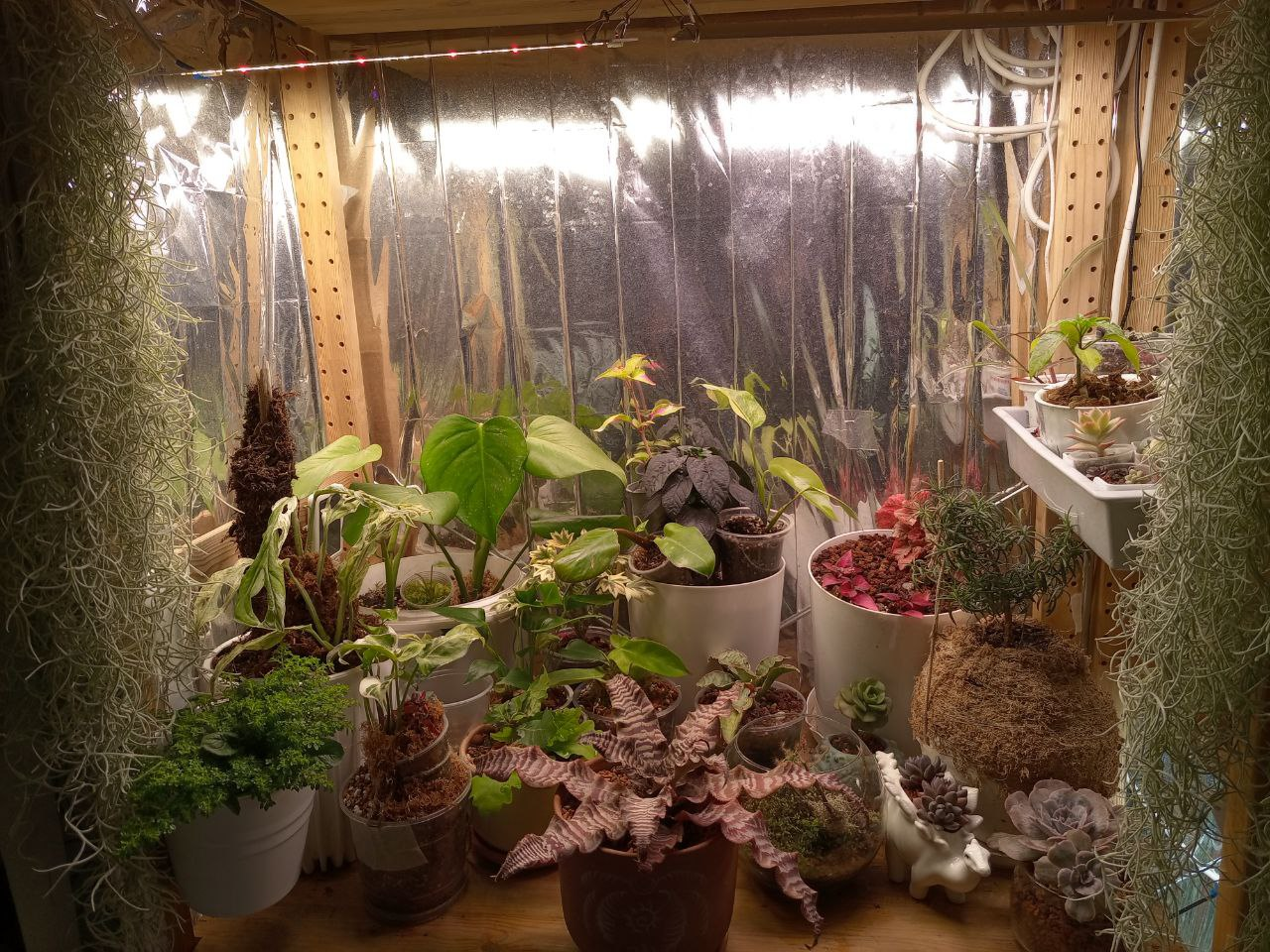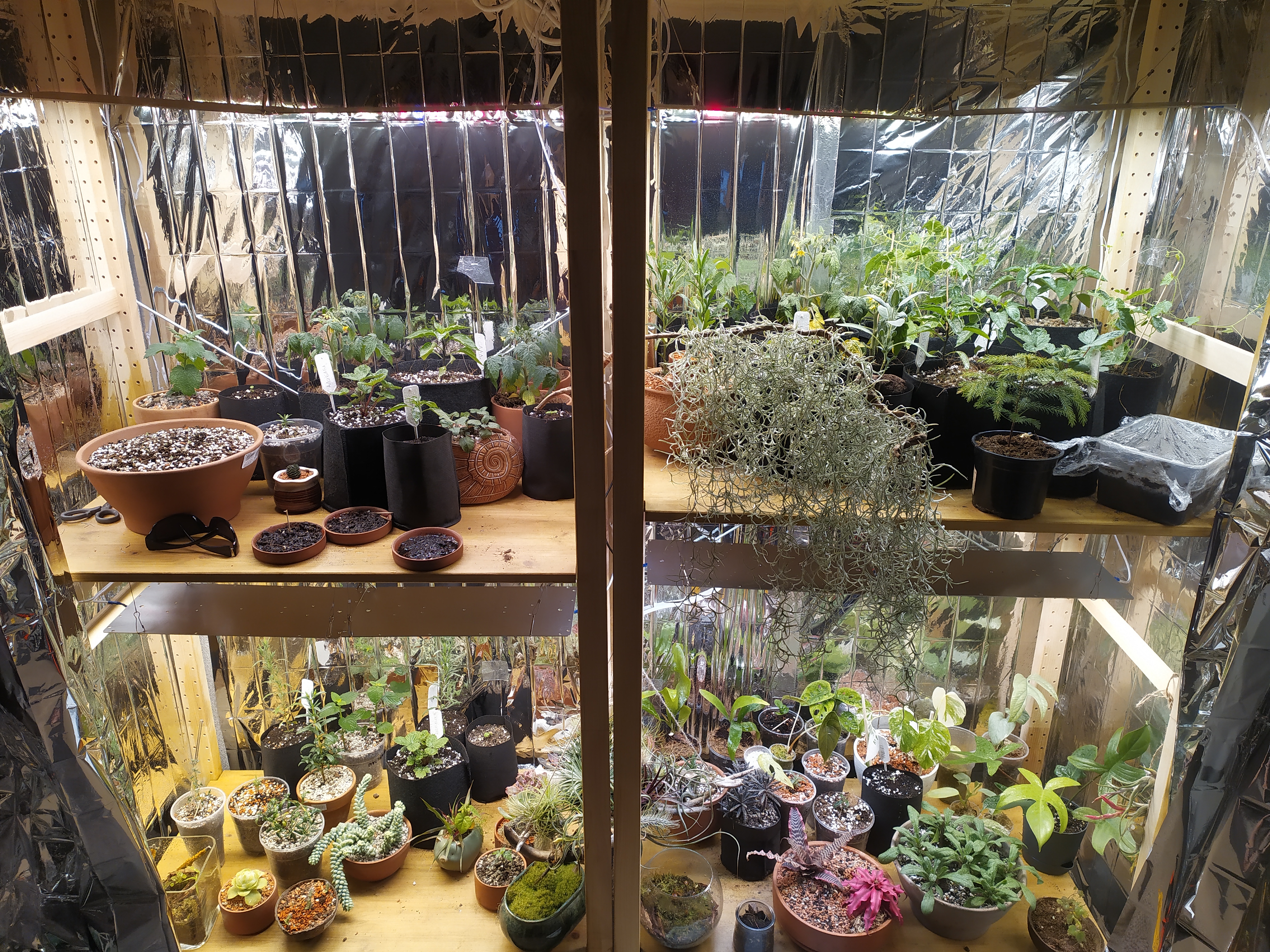 На данный момент орхидеи (7 + мини реанимаха) живут в импровизированном гроубоксе (хотя скорее гроутубус) из пенофола 5мм со светоотражающим полом и потолком. В качестве освещения используется две настольных лампы: линейная с панелью примерно в 20см 6500к (9w/400lm на коробке, по номиналам блока питания- 7 ватт) и точечная 4000к на 8 диодов (4 ватта по номиналам бп), 14-16 часов света. Согласно замерам с помощью смартфона свет составляет в среднем 4,5к люкс на уровне листьев. В боксе влажность стабильно 50% на пассивных испарителях (периодически повышаю до 70% пульвиком), температура 24-26 (грею за счёт двух китайских термосов, которые нихуя не термосы, но оказались хорошими грелками. Вместо крышек сделал алюминиевые колпаки с маленьким отверстием сверху по центру - тем самым создавая общую влажность до 80-82%), без них- примерно 21 днём и 18-19 ночью. 4 растихи имеют цветоносы или цветут (дали ещё до бокса), остальные раскрыли корни и/или дали их новый рост / растят листики.