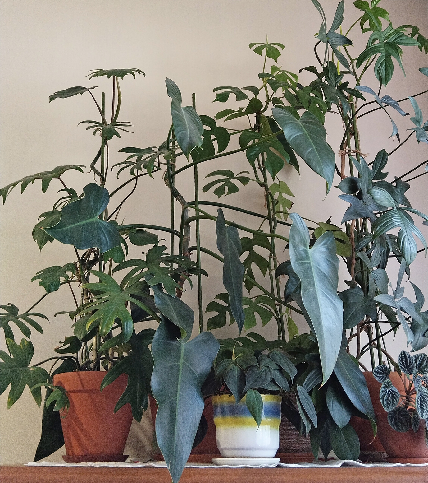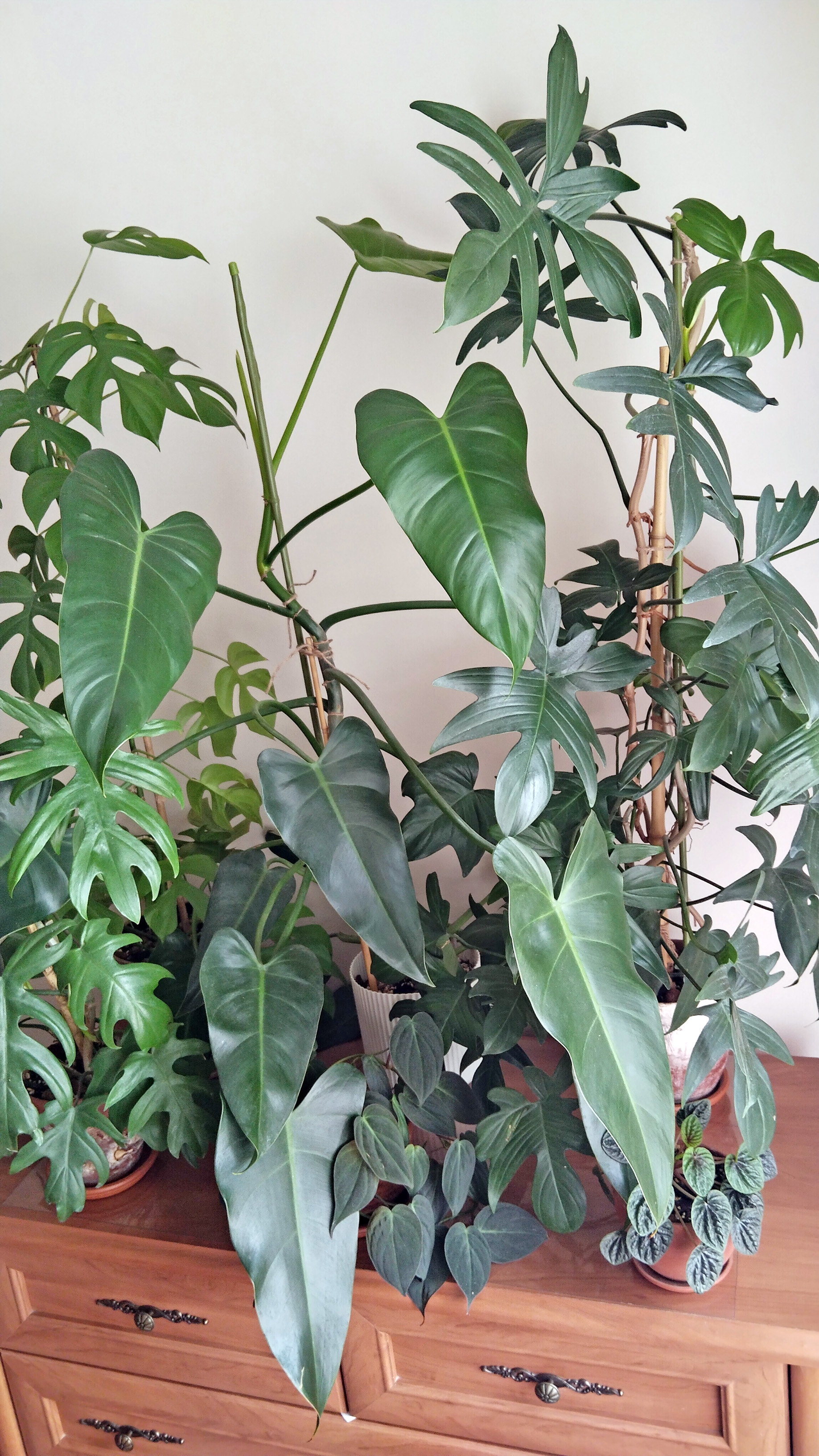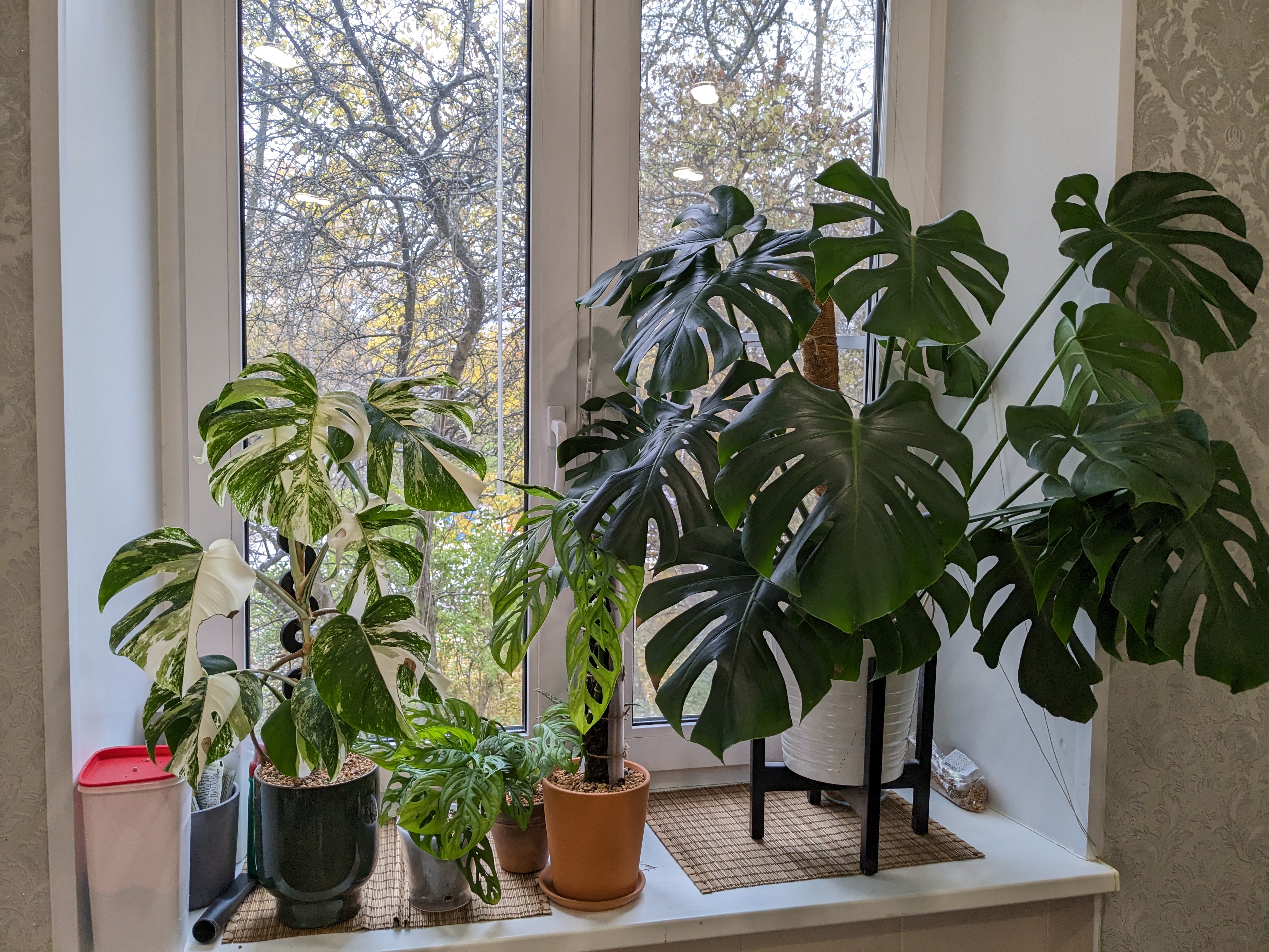 Немного вброшу. Покажу свою засохшую монстеру (на неё жаловался в треде прошлом, перенесу в другое место, а пока на лоджии откисает) и её товарищей. Фотки немного устарели, фил сагиттифолиум из пластикового горшка перелез в больший терракотовый и т.д.