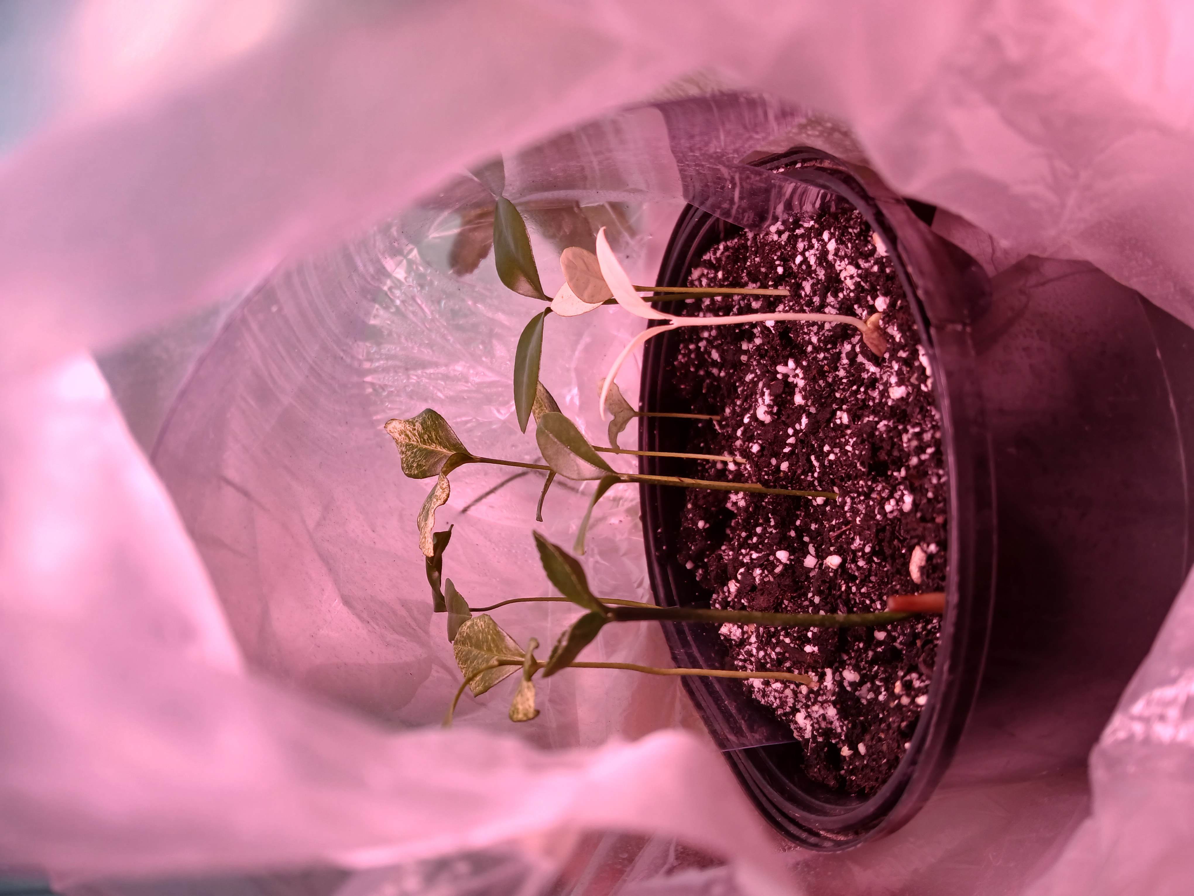 Фактически я их перезапустил после околоебланского осенне-зимнего периода (благо я их лишь опрыскивал по листу и по поверхности горшка, а не заливал- корней порченых почти не было при пересадке) а так же неебического светового стресса по своей дурости и незнанию - была неделя солнечной ясной тёплой погоды и я их поставил на юго-западное окно, где их дня 3 пару часов жарило прямое солнышко (выдавая 30к люкс согласно замерам смартфоном). Итог - одна растюха получила краевые ожоги листвы, привявший кончик нового листа, который вот только начала растить, лист побагровел дабы защититься от такого избытка счастья. На другой получил ожог малого листа в виде ярко-жёлтого пятна с выступившей сетчатой структурой. И почти угробил миньку, которую отправил в стеклянный стакан на реанимацию. На одной даже лист начал хлорофилл отбеливать под нейтронную звезду бы ещё подставил, ага. Но при этом тургор листьев сохранили. В общем- легко отделался.