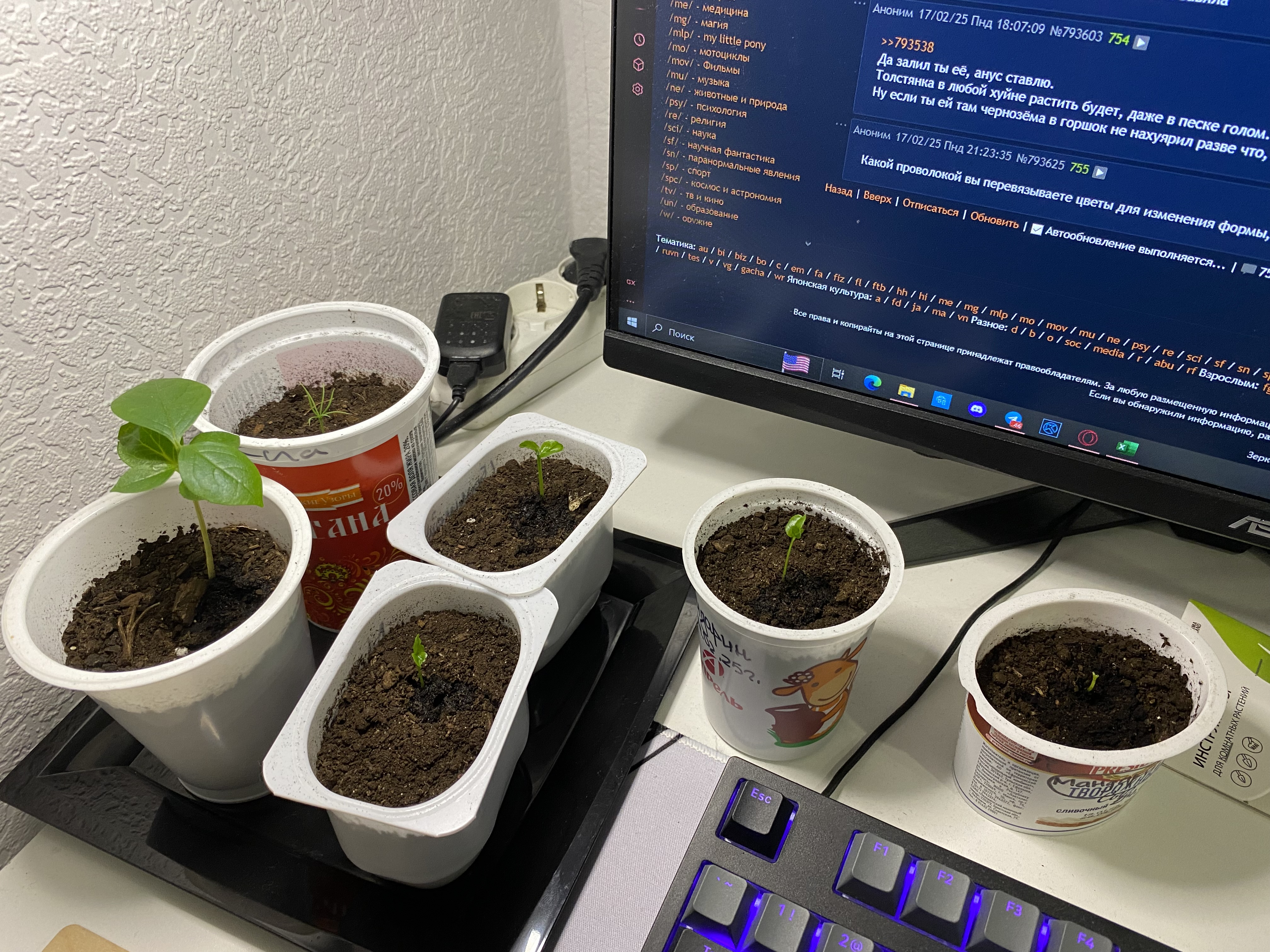 >>769041 Спасибо, анон, за поддержку, а то я что-то взгрустнул. Анон выше очень метко определил мое времяпрепровождение как "радость шиза", грустно стало, когда что-то пошло не так. В прошлом году, с которого все началось, мне просто уезжающий родственник отдал ящик уже крепенькой рассады "балконных" помидоров из 7 кустов в небольшом ящике. Оказались индетерминантными, и это я только потом узнал такое слово. В итоге - не прищипывал, не удалял побеги и листья, не прикармливал, только повысил стенки ящика из плотного картона раза в 2,5 и досыпал земли, и этот ящик занял натурально половину балкона, стоя на полу, и буквально до потолка. Красота несусветная и божественный запах, но, разумеется, практически без выхлопа. Думаю, полкило где-то черриков набрал. Но сам кустище доставлял неимоверно. А клещи, наверно, появились из-за кордилины, которую я подобрал на помойке. Буквально. Возле работы рядом с уличной мусоркой стояла, на вид не сильно чахлая, без горшка, в коме земли с пакете. И как-то не подумалось мне, что не просто так ее выставили.
