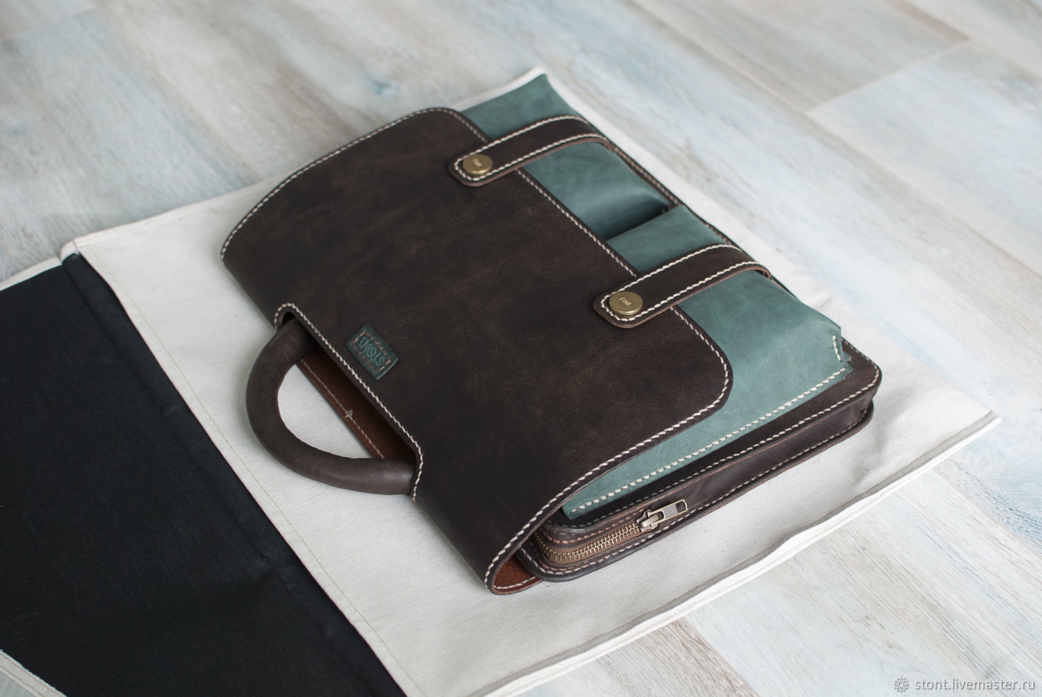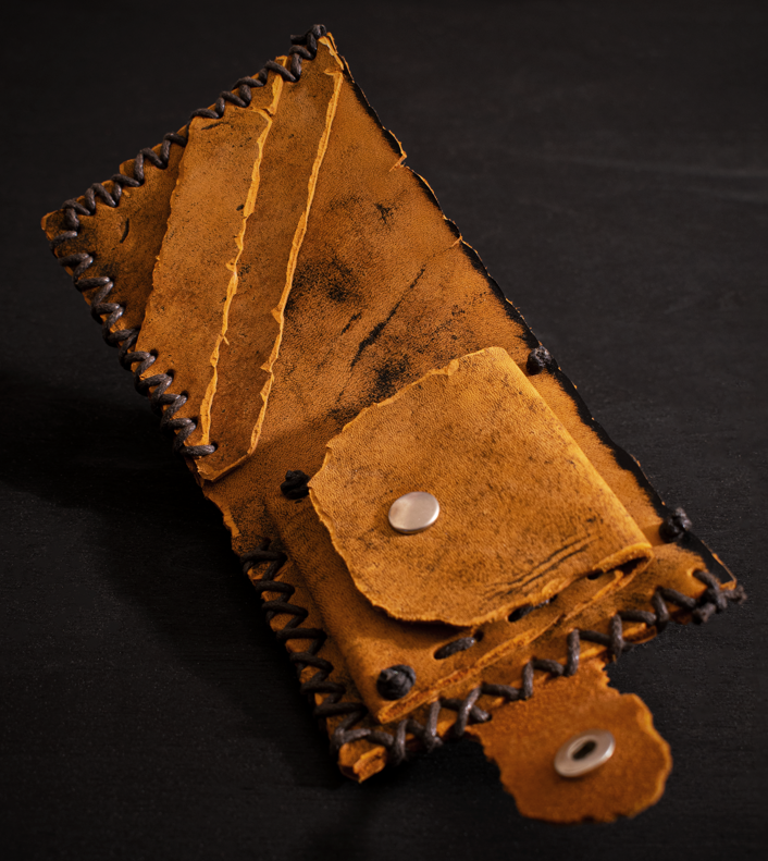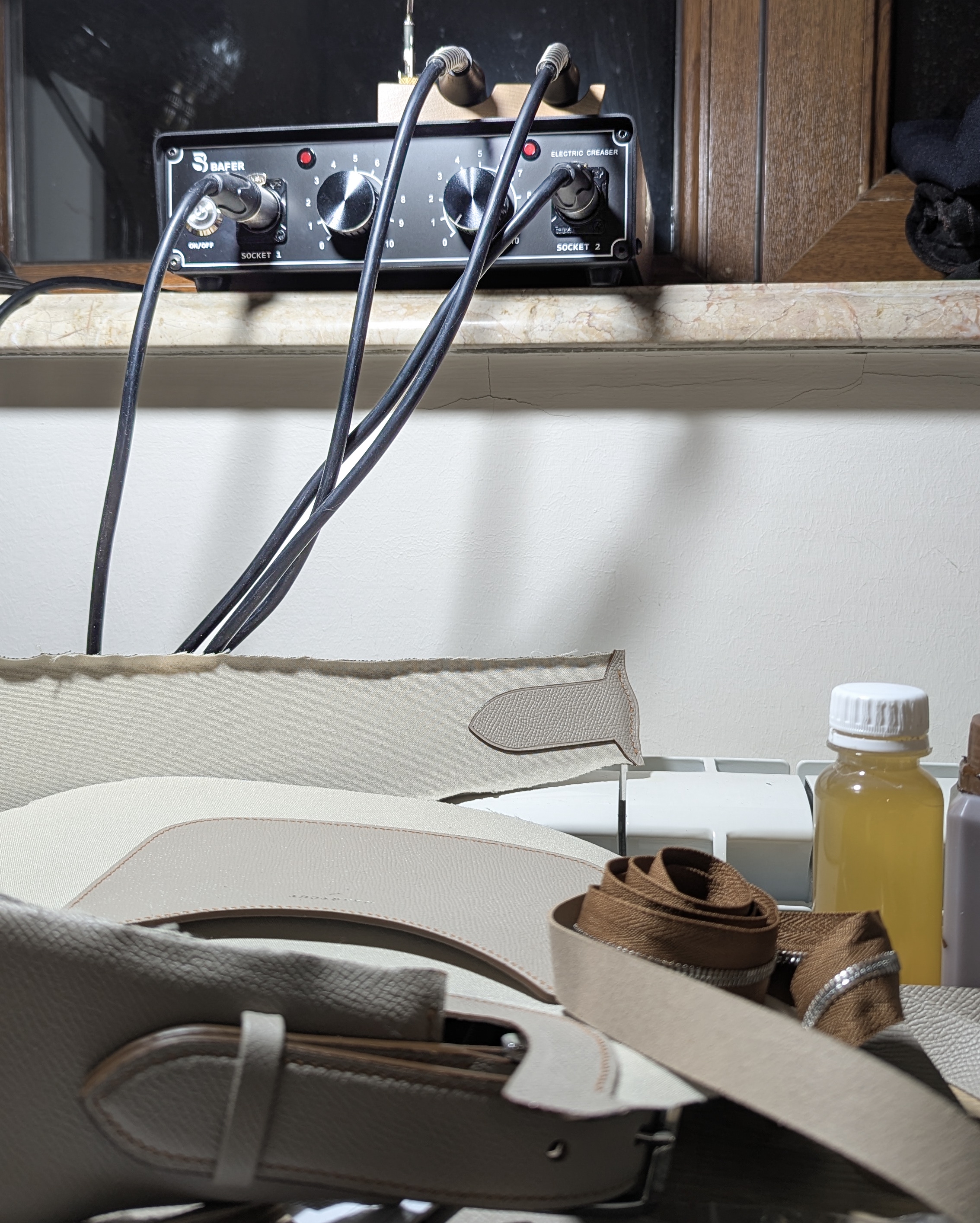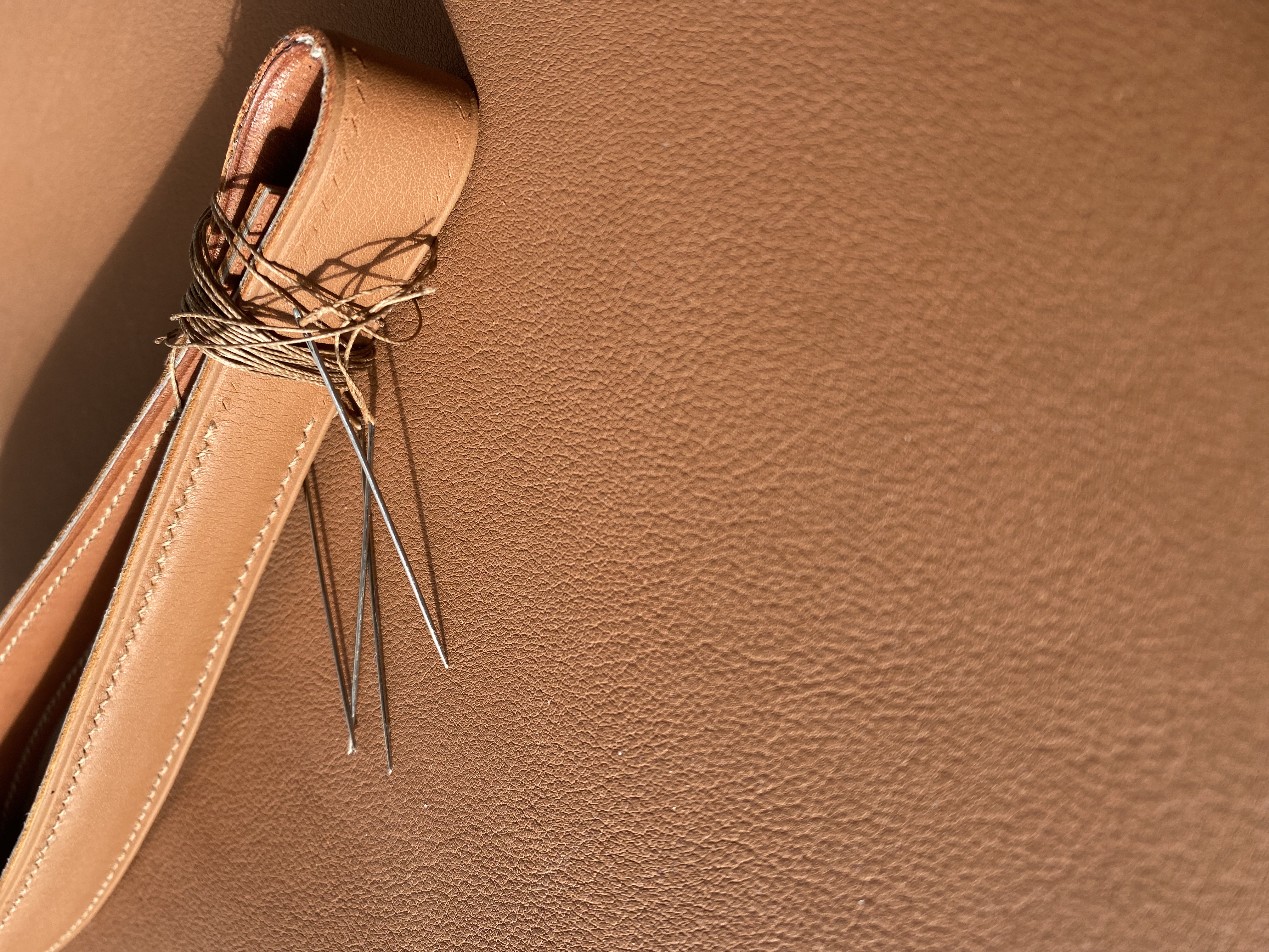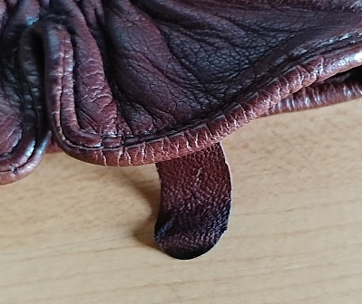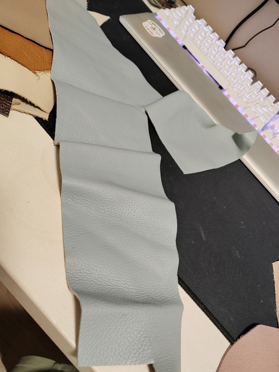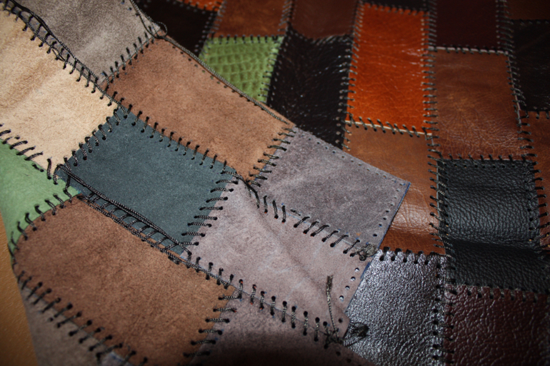 Но в любом случае это тонкая кожа, ее для такой работы нужно продвоить. Я бы сказал до 0.5мм, чтобы подгибы хорошо легли. Ну и если хочется такого же винтажного эффекта, то это должна быть растишка, которую можно самостоятельно пропитать неравномерно разными средствами, помять, поцарапать и т.д.