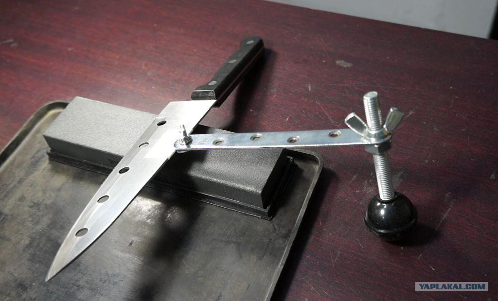По поводу угла заточки. Если совсем сложно, то вот такой костыль собирается из говна и палок в ближайшем строительном магазине. Шпилька м6, пара гаек, любая длинная пластина. Вариантов есть два - в одном нож зажимается между пластинами, в другом используется неодимовый магнит. Делается быстро, стоит копейки, гуглится по "точилка-костыль".