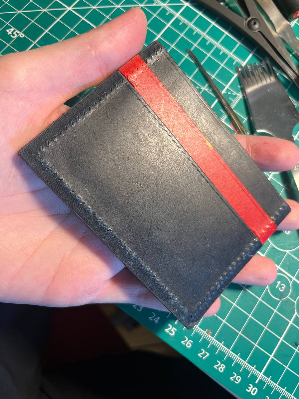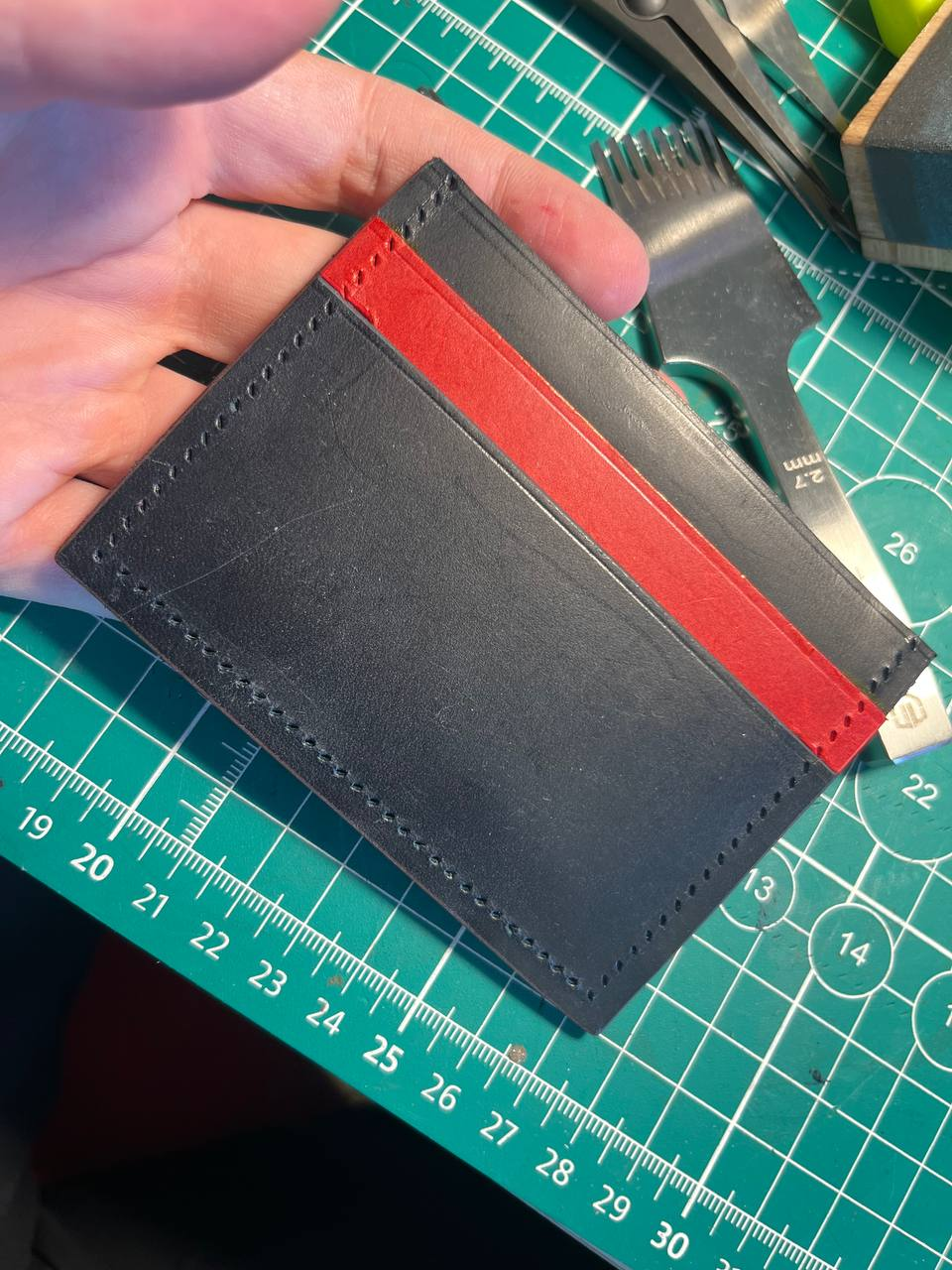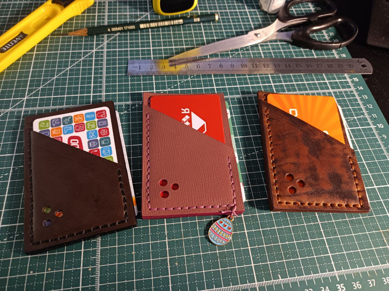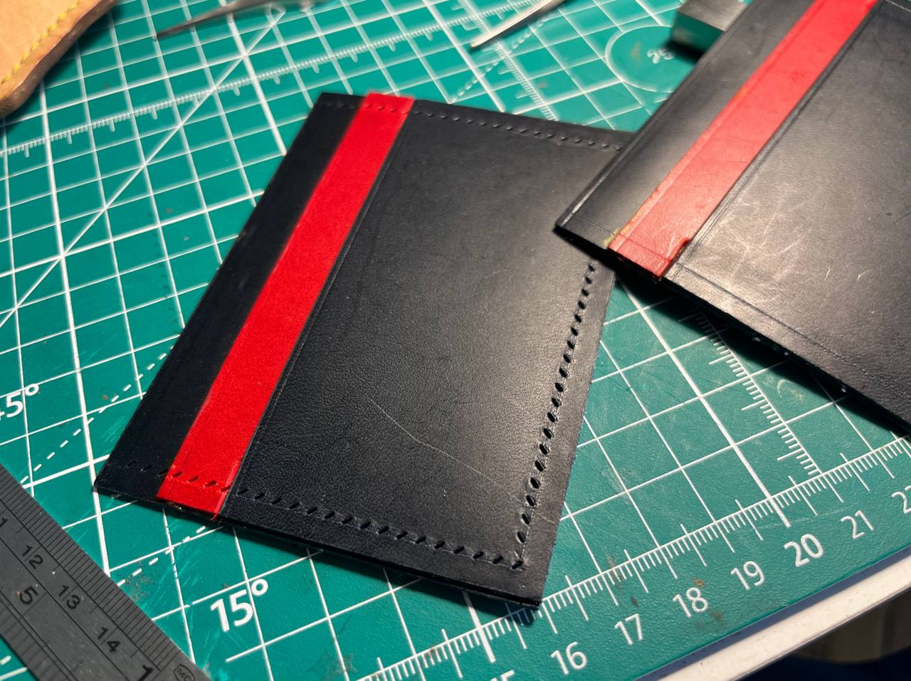 3. Возьмем тот же кардхолдер как базовое изделие. Вы сначала вырезаете все элементы по четким размерам и потом их пробиваете, склеиваете, собираете и готово. Или вы всё пробиваете, склеиваете, сшиваете и только потом отрезаете все лишнее с отступом вокруг шва? Не понимаю как лучше, чтобы было меньше косяков.