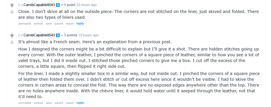 Если хочешь непосредственной корреляции между потраченными на изделие часами, стоимостью материалов и ценой - пили какие-нибудь седла и прочее профессиональное снаряжение, которое должно, внезапно, работать, а не просто быть. Для холдеров/кошелечков/сумочек и прочей подобной галантерейки работает именно описанное выше. Глупо спорить с этим в попытках придать ценности своим бессмысленным телодвижениям.