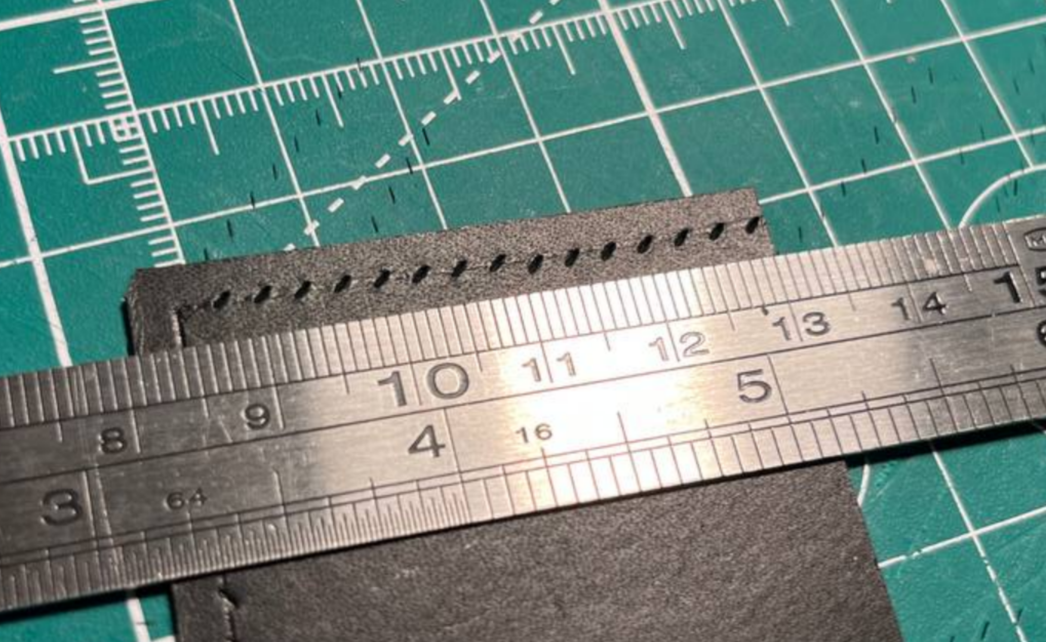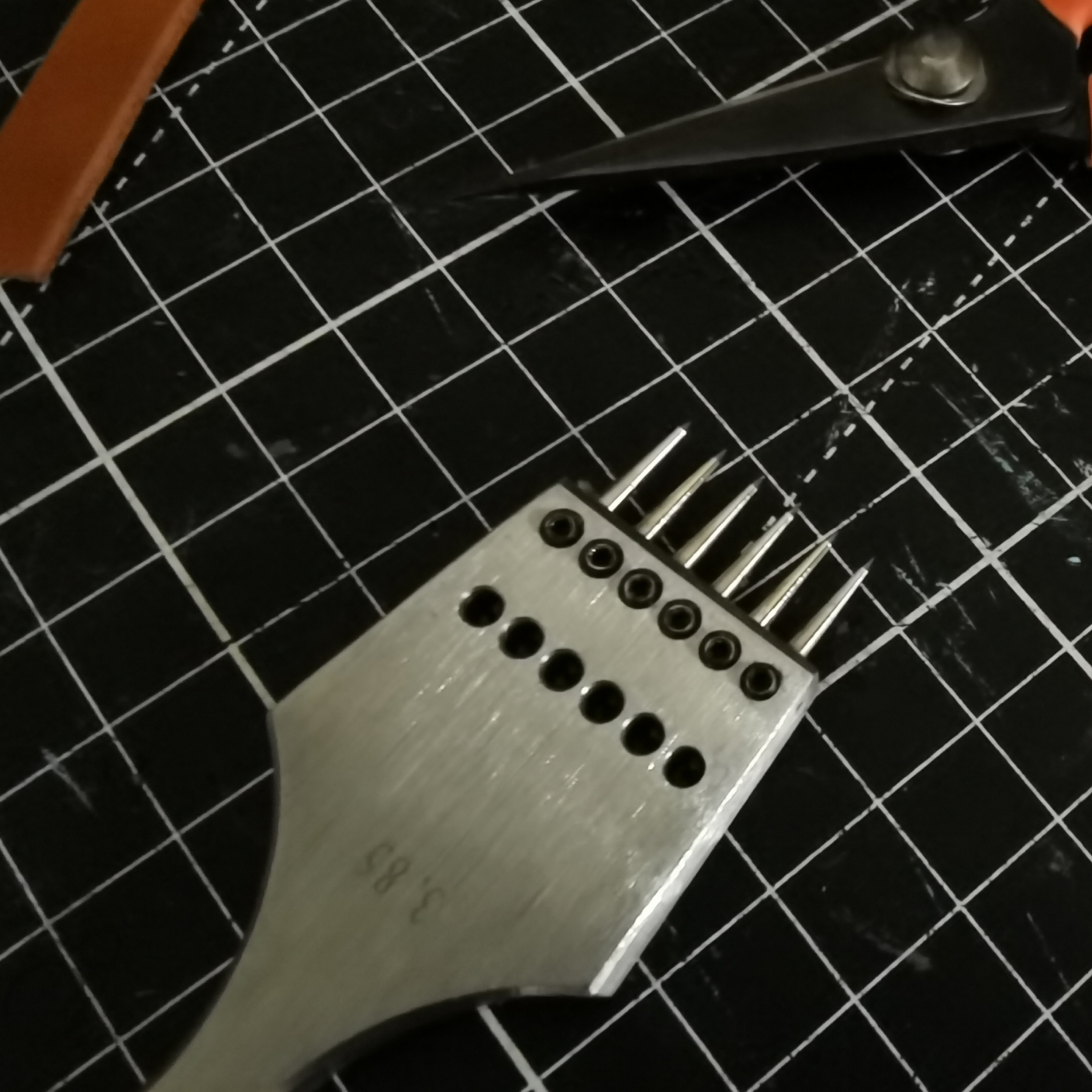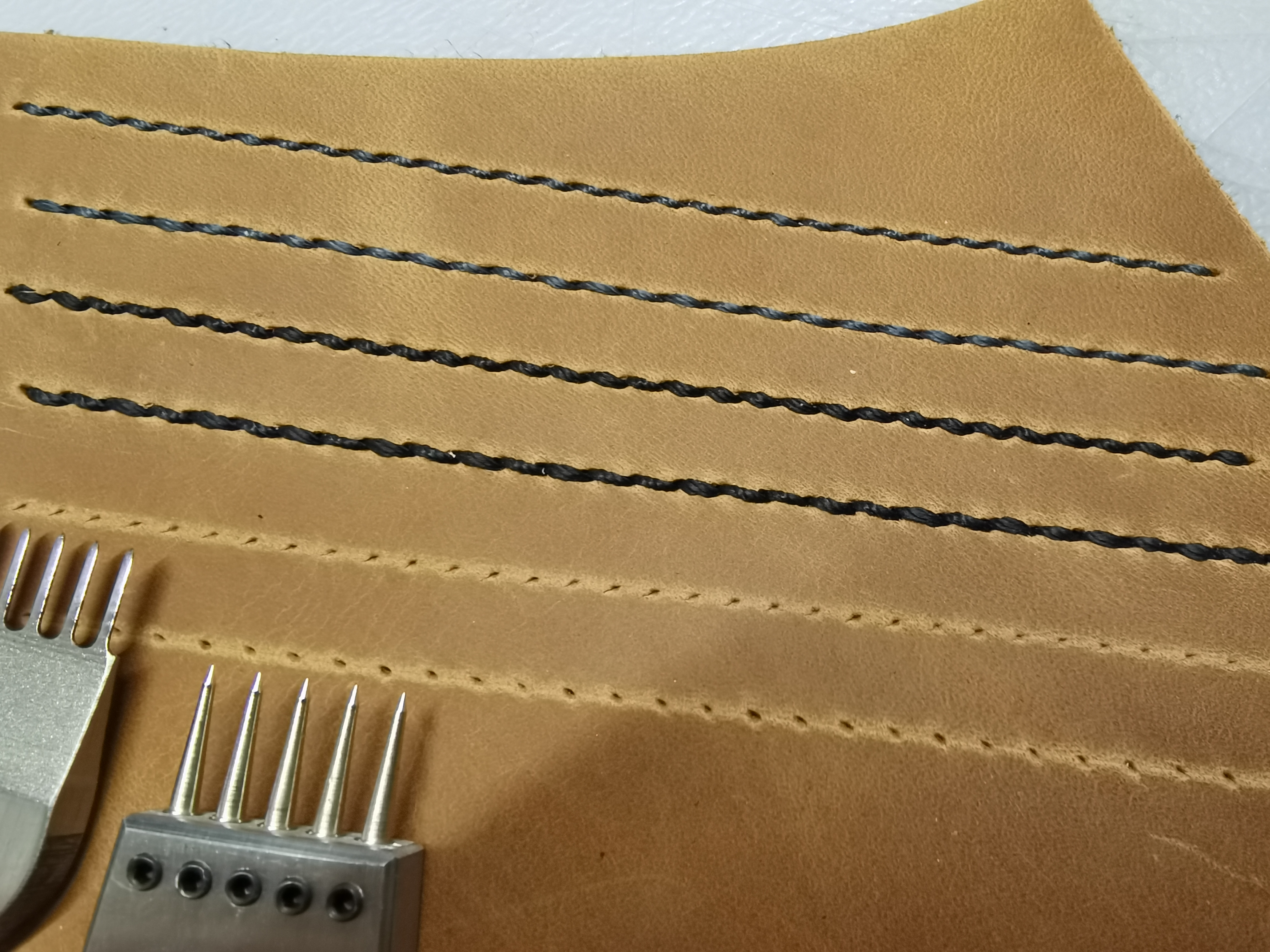 1. Прочертил прямую линию по линейке. 2. 5-зубчатым пробойником слабым нажимом разметил будущие отверстия по этой линии. 3. Пробил по этим отметинам, сохраняя угол. 4. ??? 5. Шов нихуя не получается прямым лол.