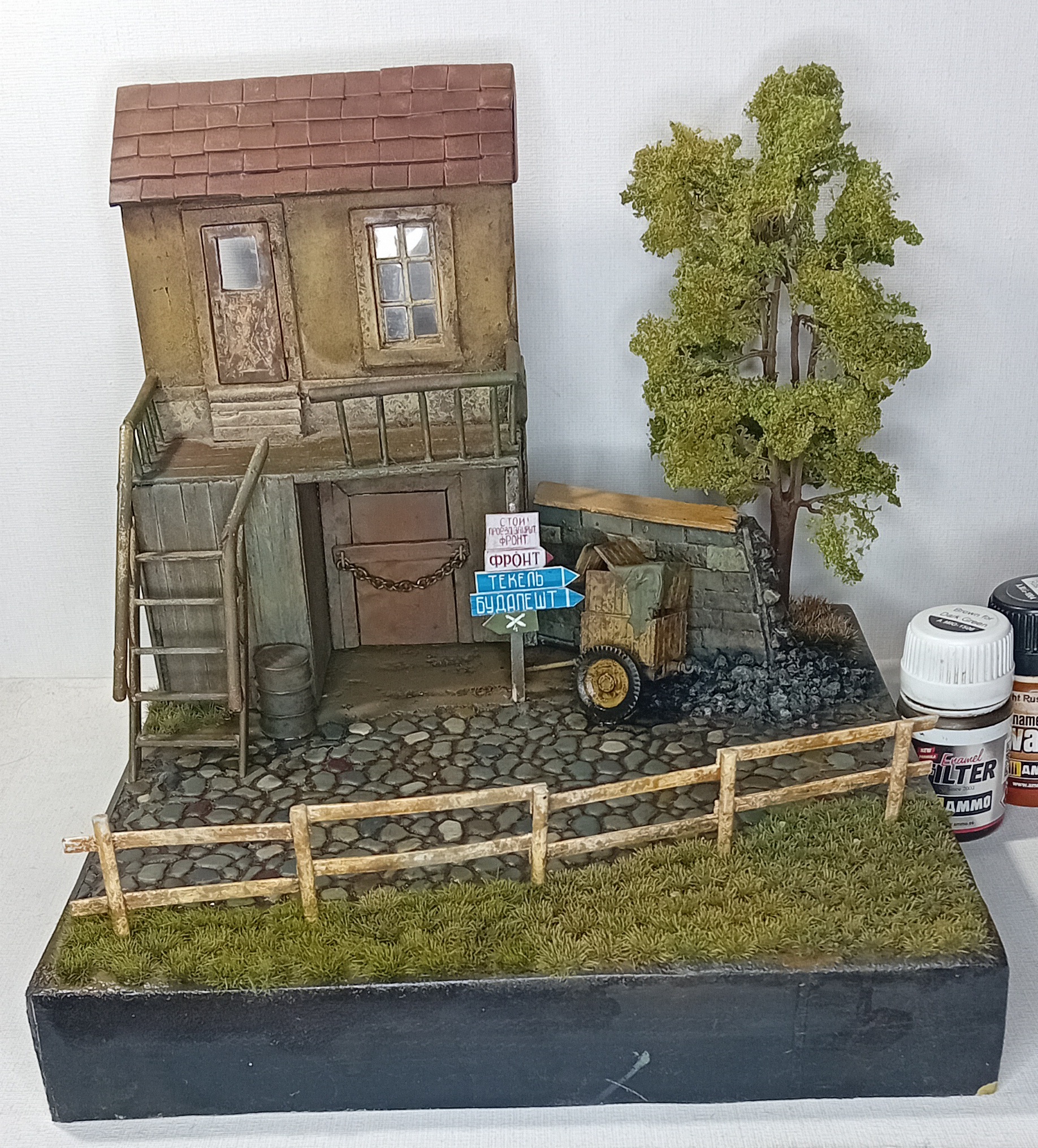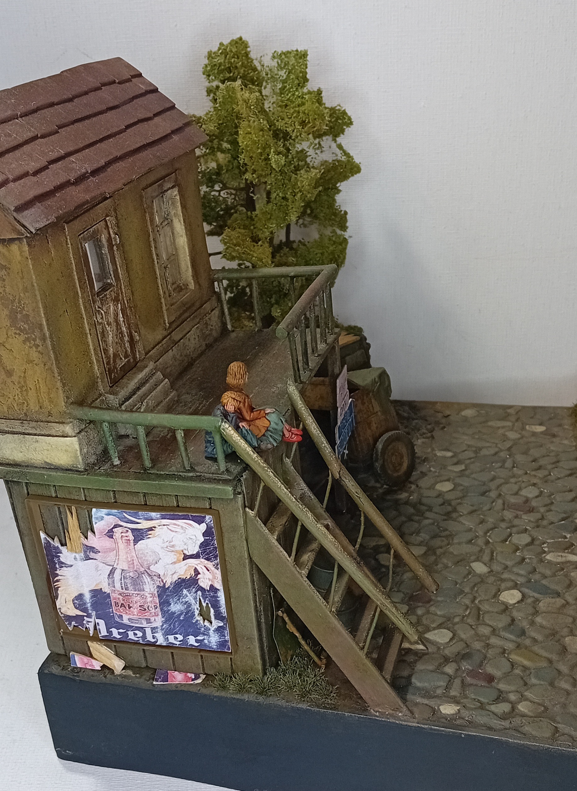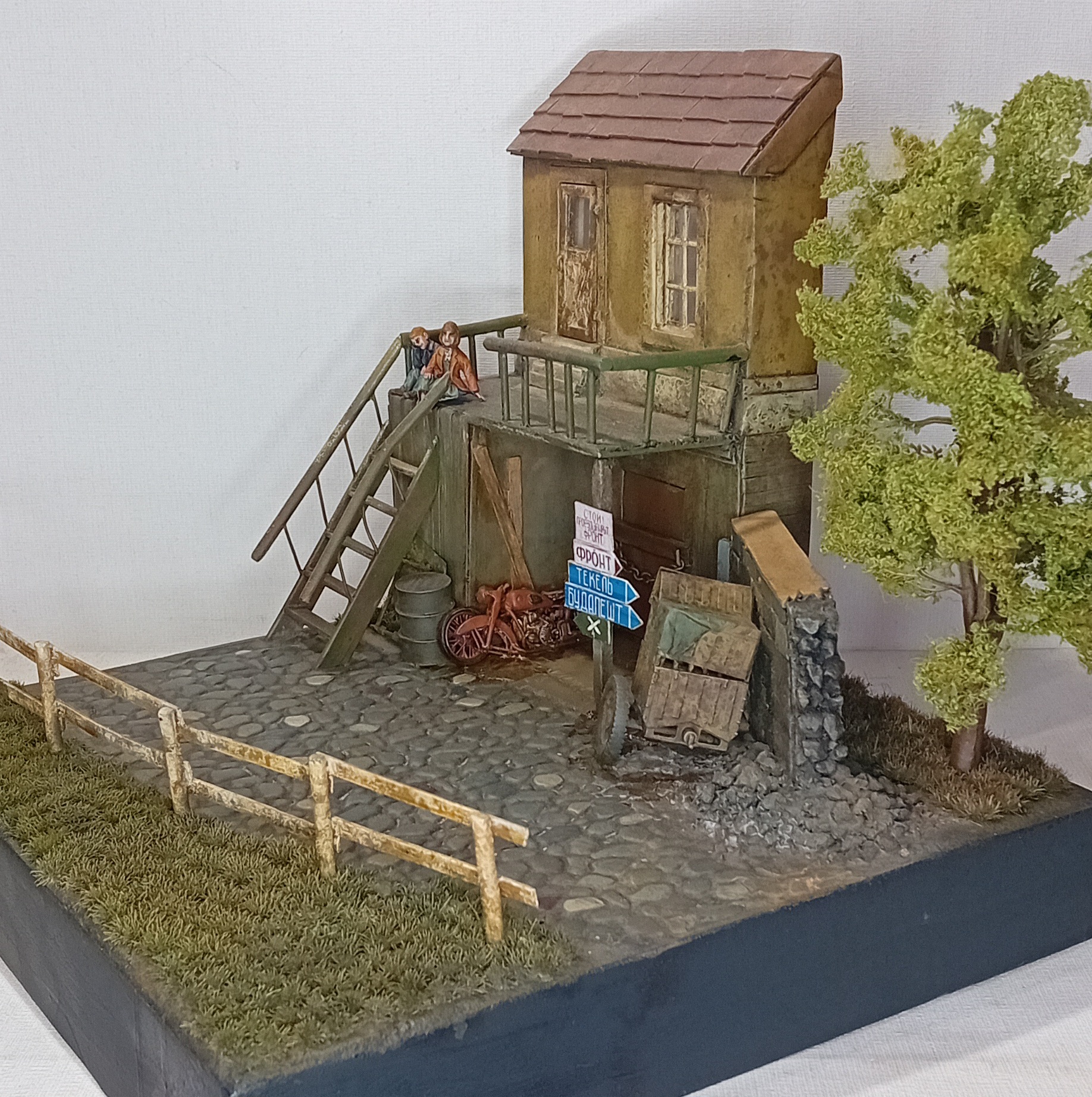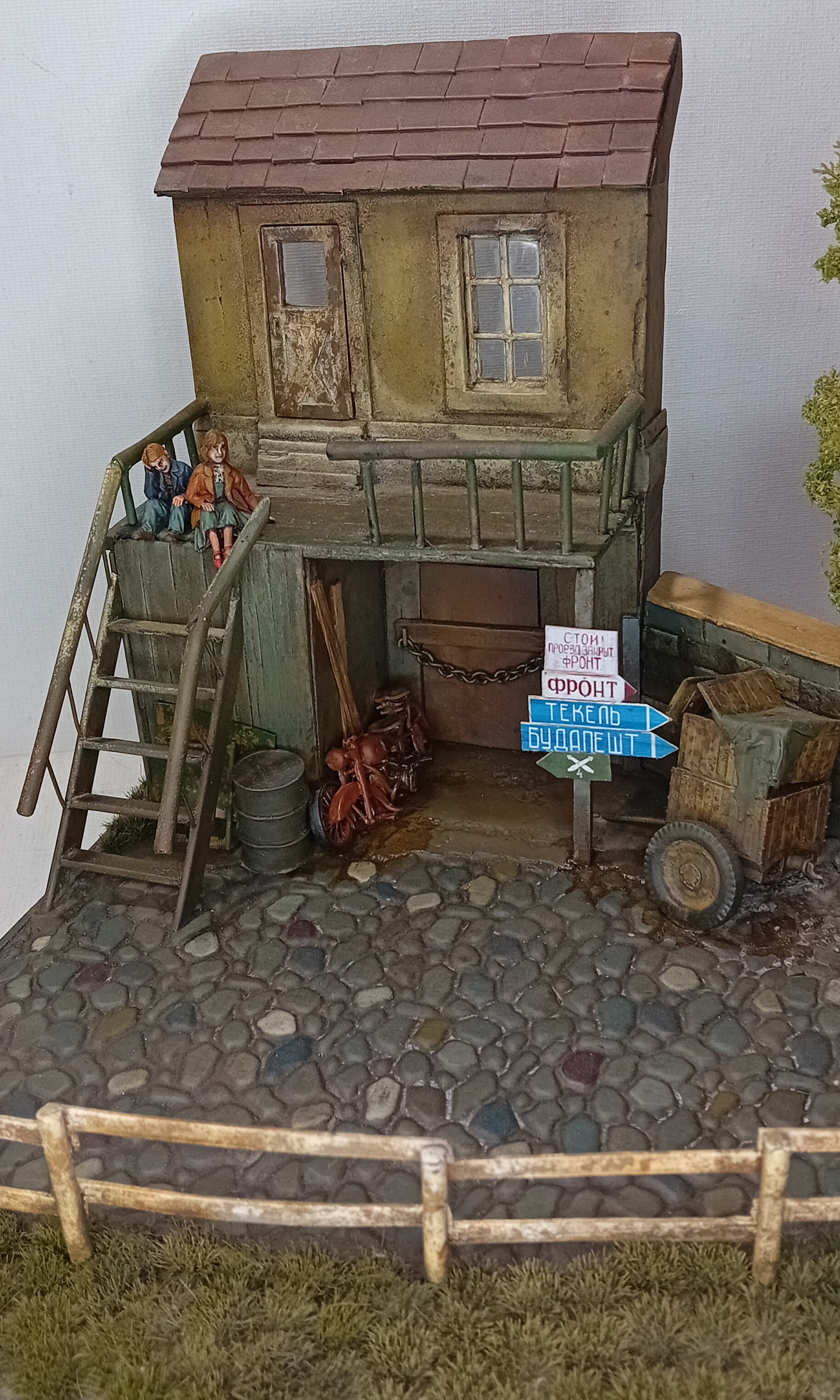 Двинулся немножко вперёд по диораме. Добавил фигурки детей, плакат на дом, старый мотоцикл.. Попробовал поработать пигментами, но результатом пока не удовлетворён. Также покрасил двух разведчиков из смолы - в какую работу я их пристроить пока не знаю, дальше видно будет, а пока так.