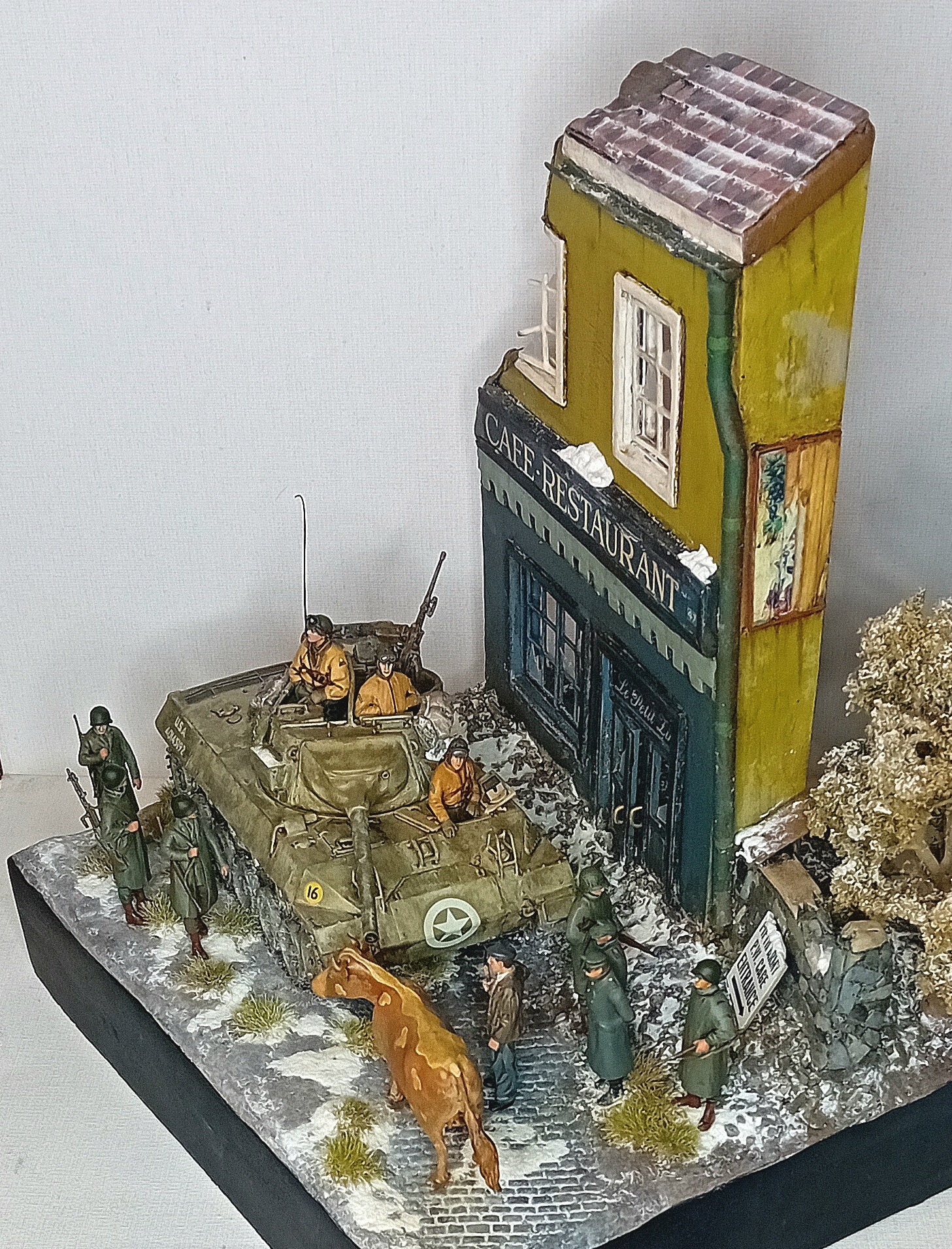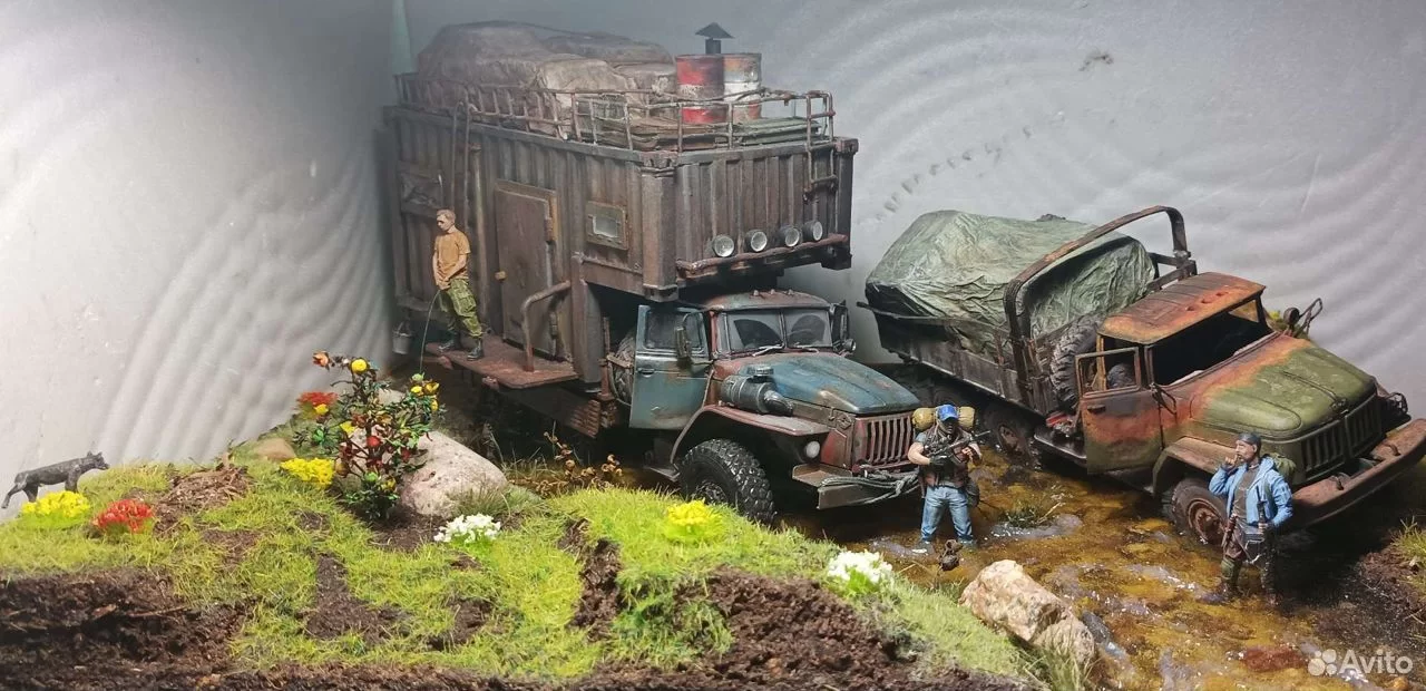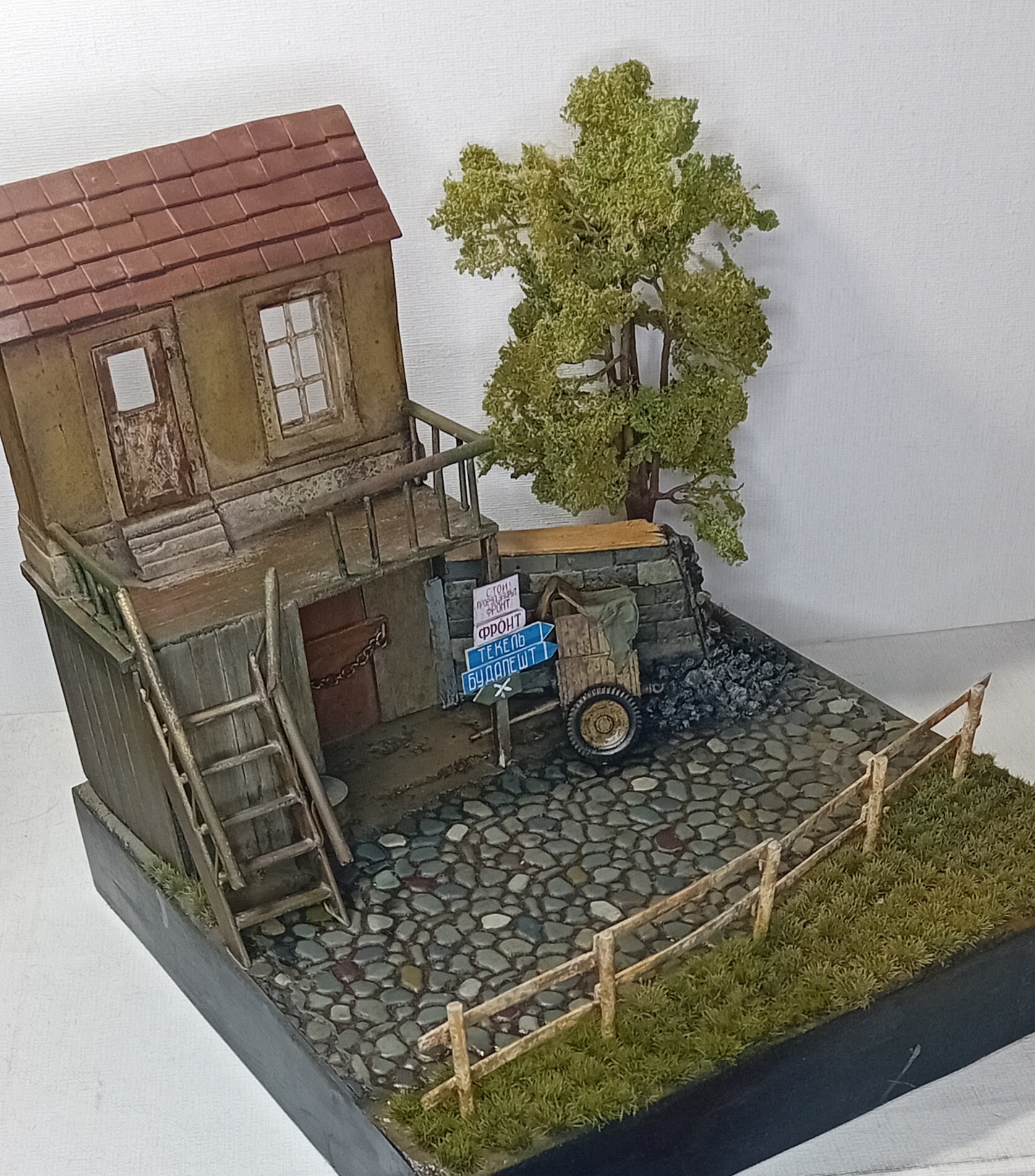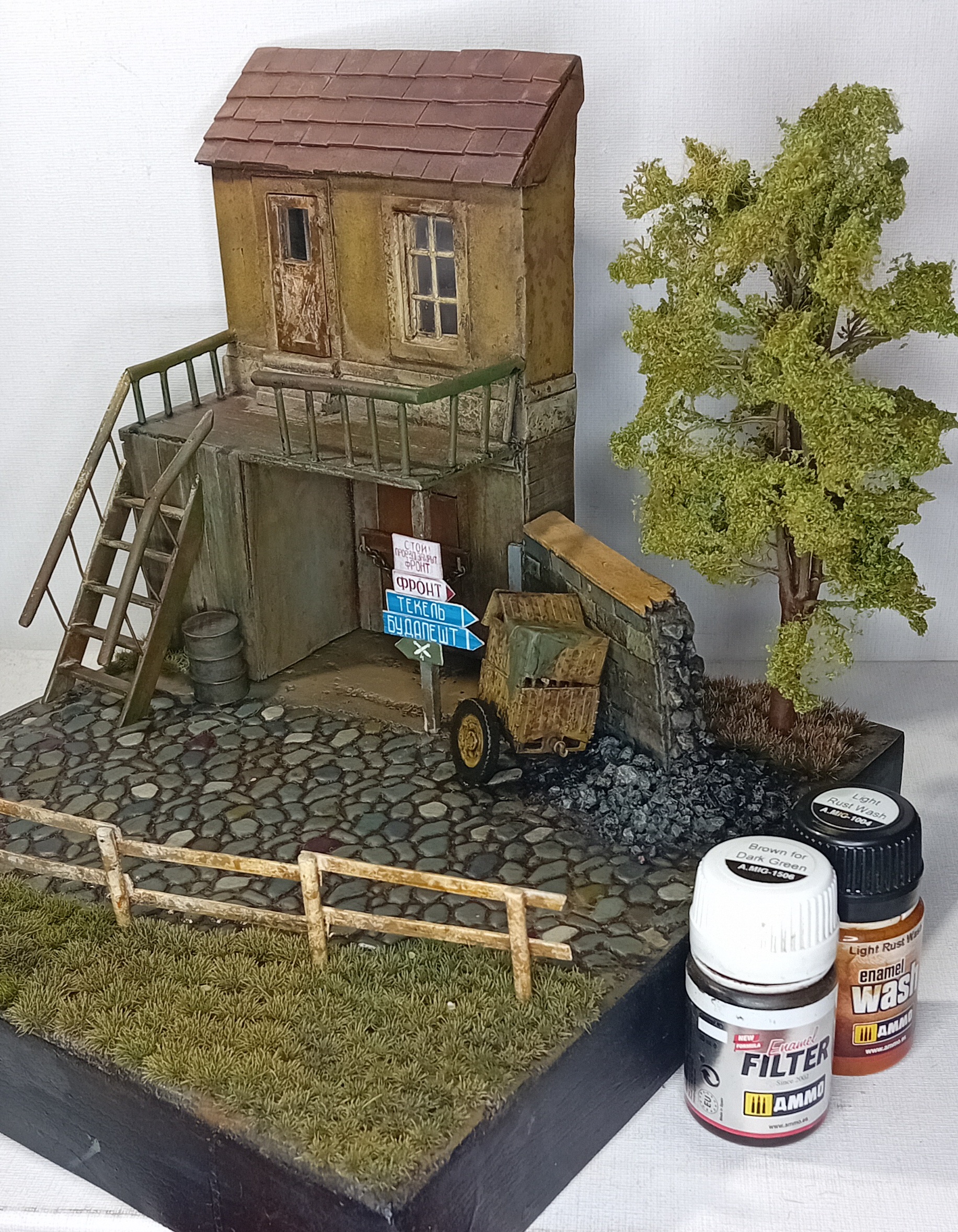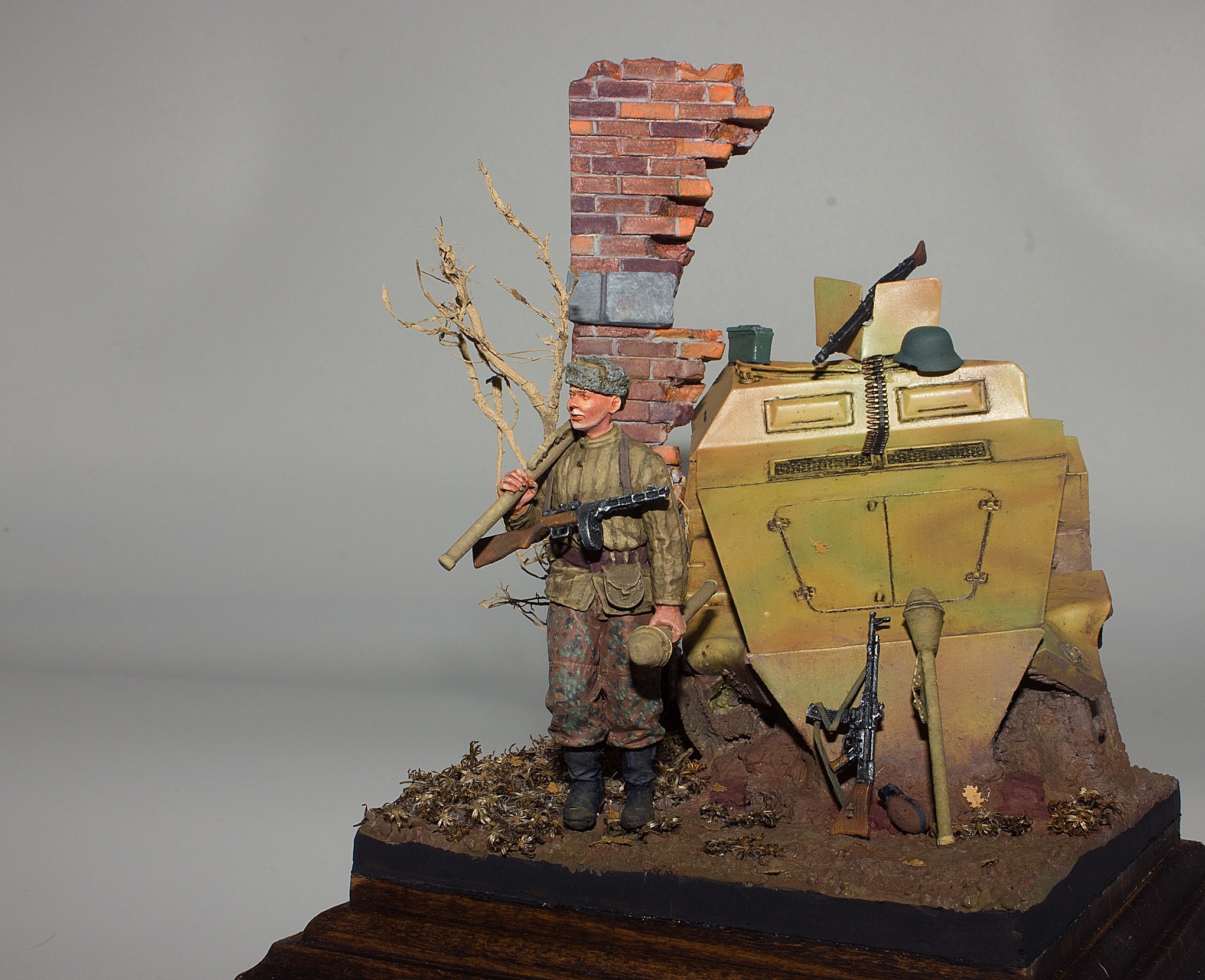 Двинулся немножко вперёд по диораме. Добавил фигурки детей, плакат на дом, старый мотоцикл.. Попробовал поработать пигментами, но результатом пока не удовлетворён. Также покрасил двух разведчиков из смолы - в какую работу я их пристроить пока не знаю, дальше видно будет, а пока так.