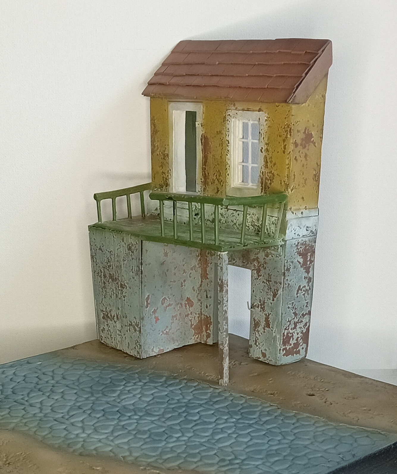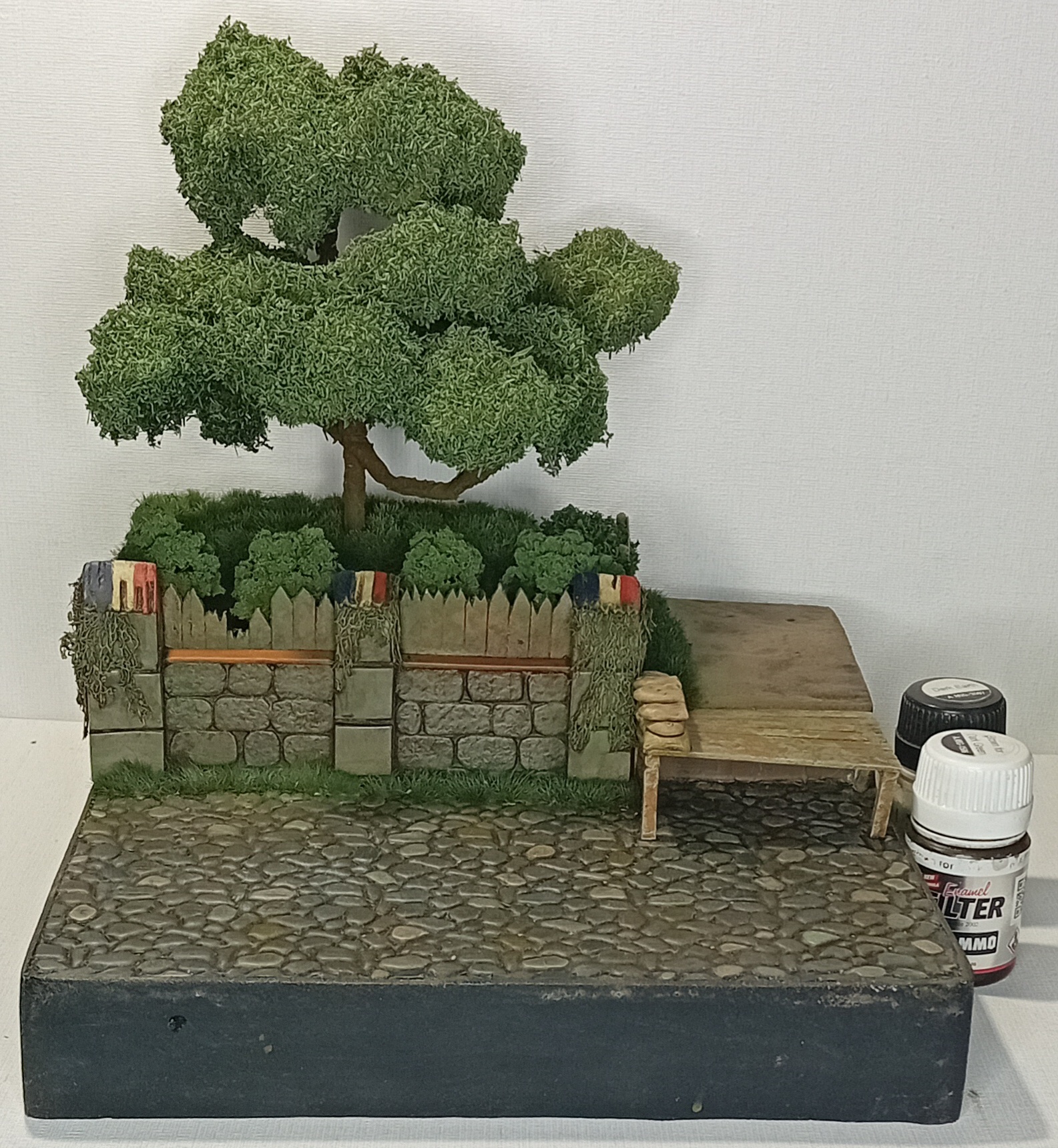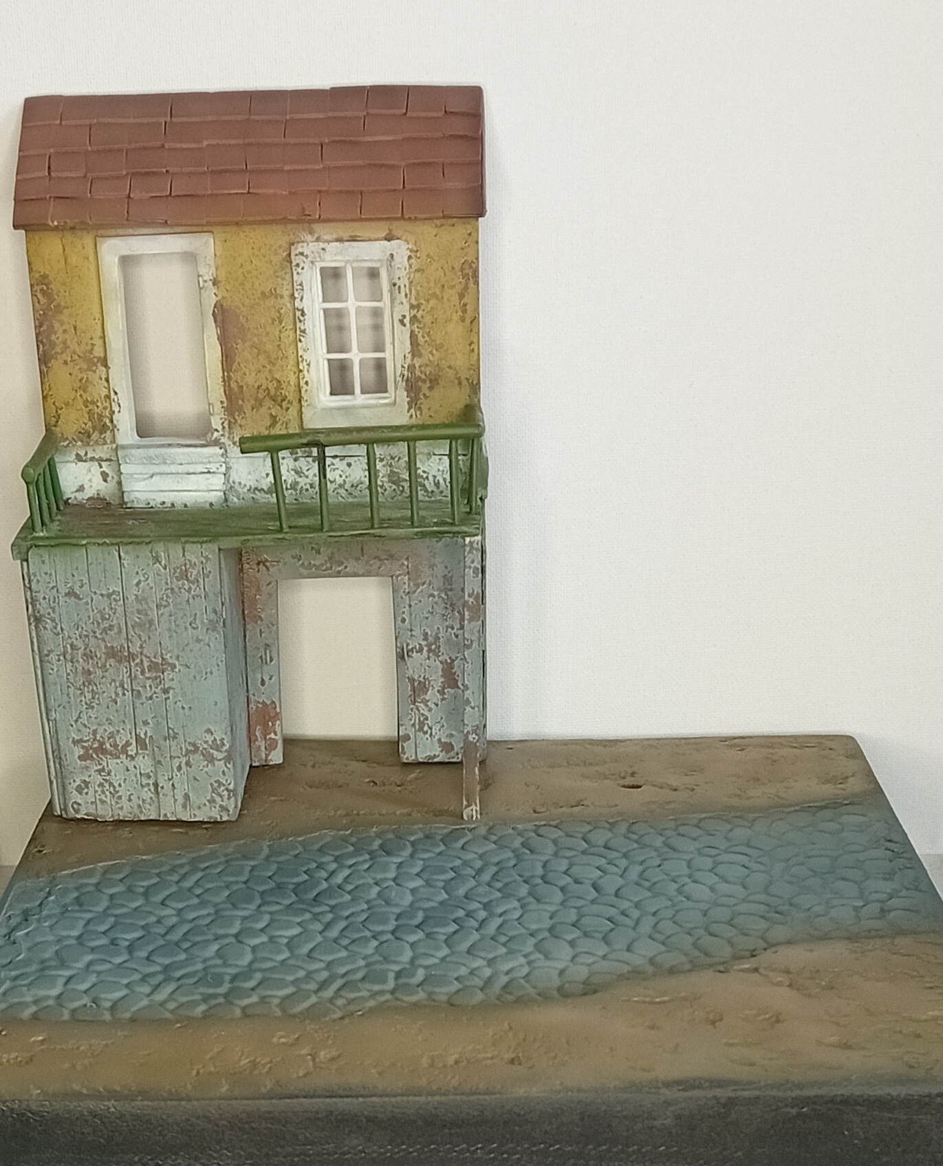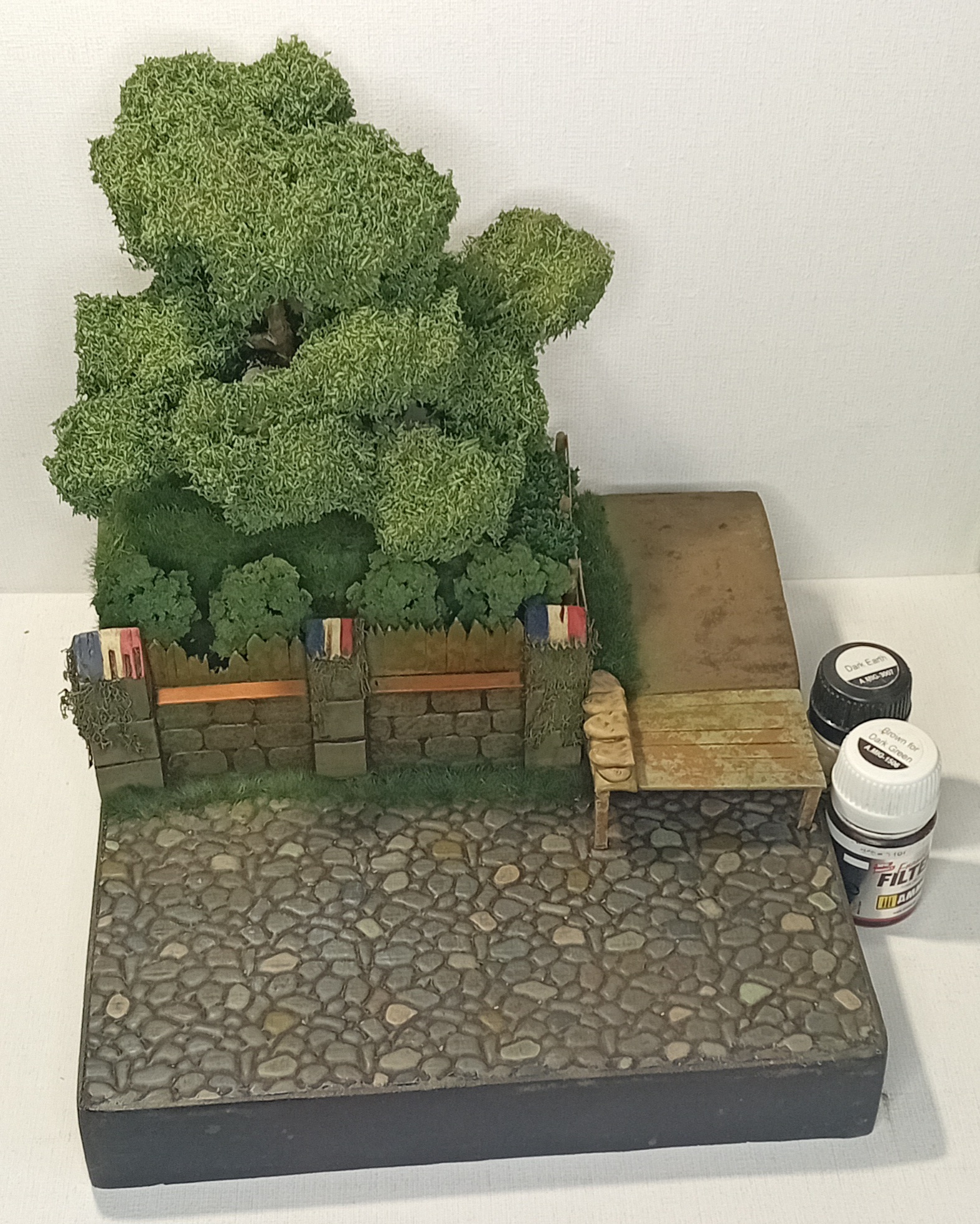 Двинулся немножко вперёд по диораме. Добавил фигурки детей, плакат на дом, старый мотоцикл.. Попробовал поработать пигментами, но результатом пока не удовлетворён. Также покрасил двух разведчиков из смолы - в какую работу я их пристроить пока не знаю, дальше видно будет, а пока так.