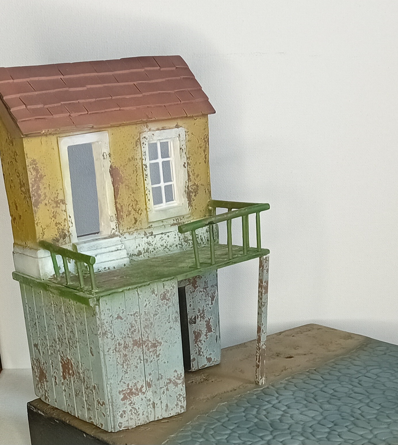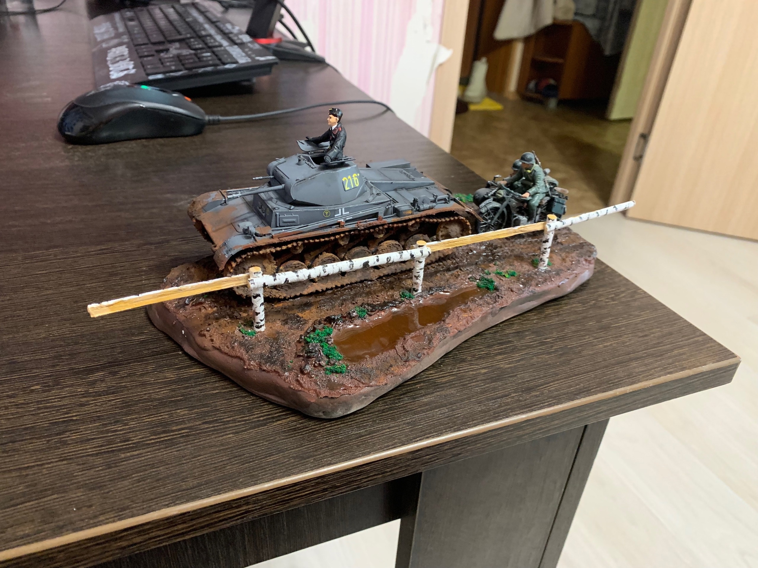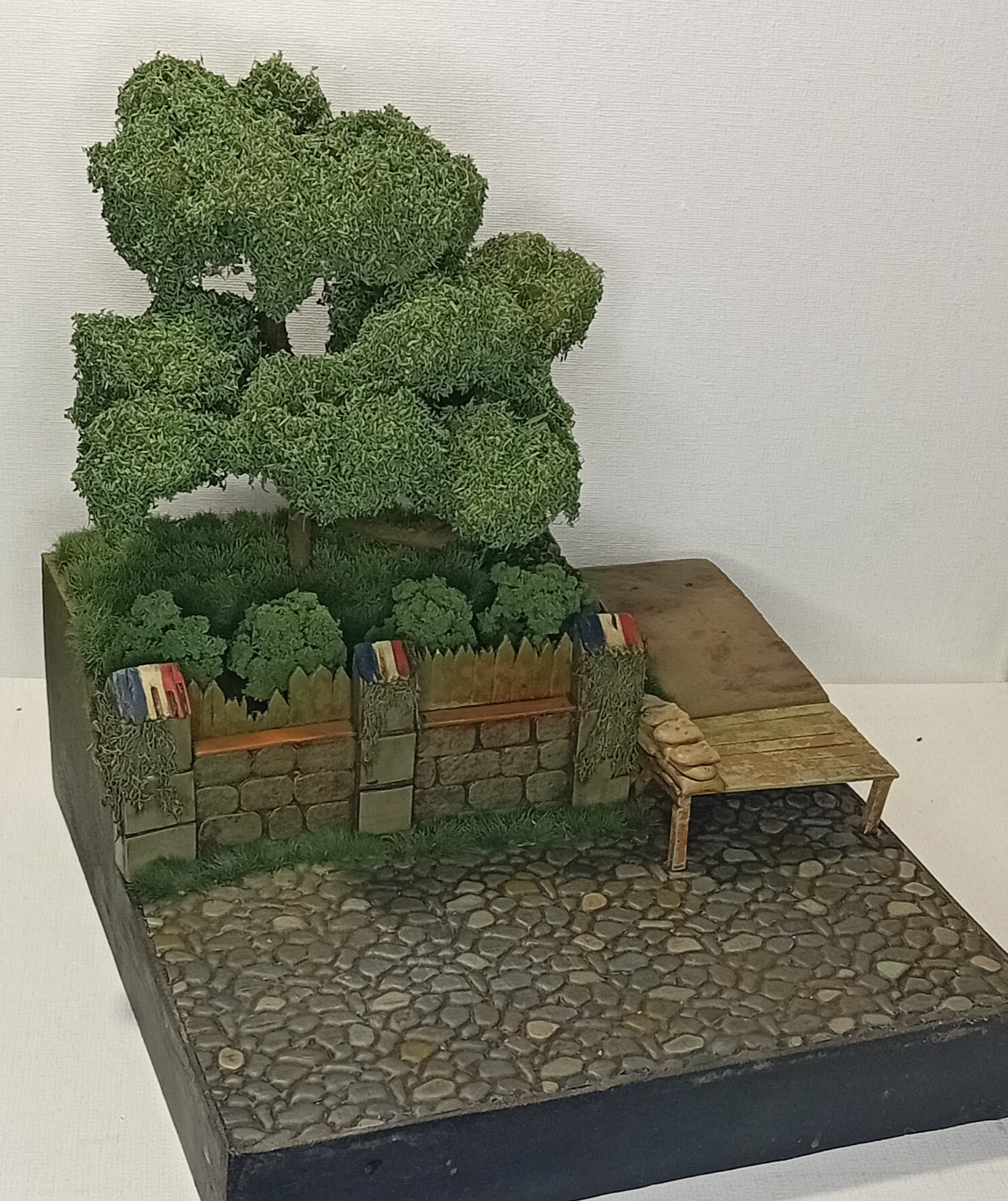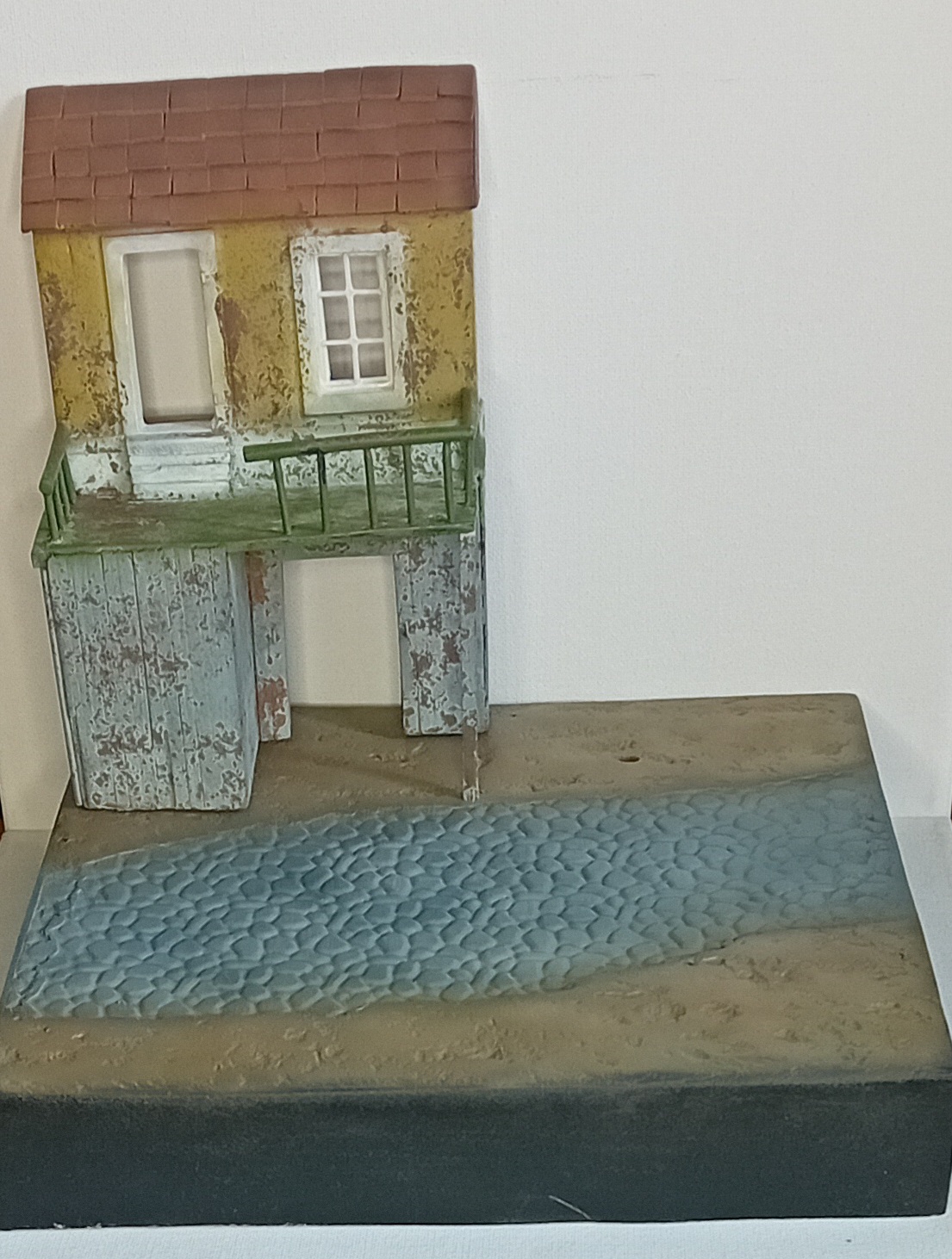 Двинулся немножко вперёд по диораме. Добавил фигурки детей, плакат на дом, старый мотоцикл.. Попробовал поработать пигментами, но результатом пока не удовлетворён. Также покрасил двух разведчиков из смолы - в какую работу я их пристроить пока не знаю, дальше видно будет, а пока так.