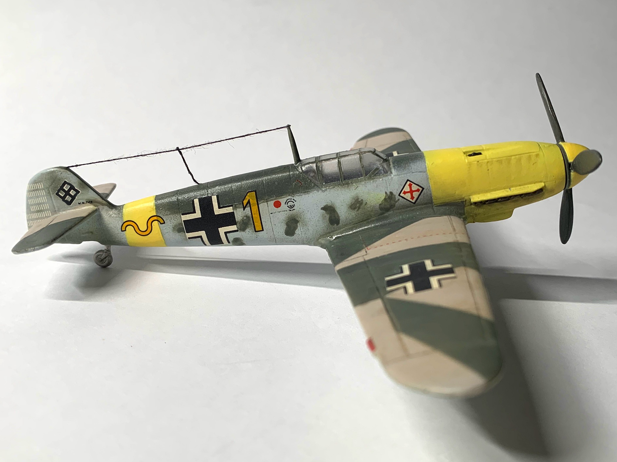 >>787116 Если декали пожелтели, то можно их на солнце или под Уф-лампу на длительное время, я на окно в прозрачном пакетике вывешивал (зимой на месяц, летом недели хватило) . Попробуй сначала ненужный элемент перевести, если не развалится в воде/при переносе - отлично! Если разваливается, можно задуть лист с декалями лаком (я использовал Decal Fix от Валлейо, но это, походу тот же водно-акриловый лак). Я думаю, пулемёт для юнкерса можно отлить из смолы, форму сделать по пулемёту от 110-го.