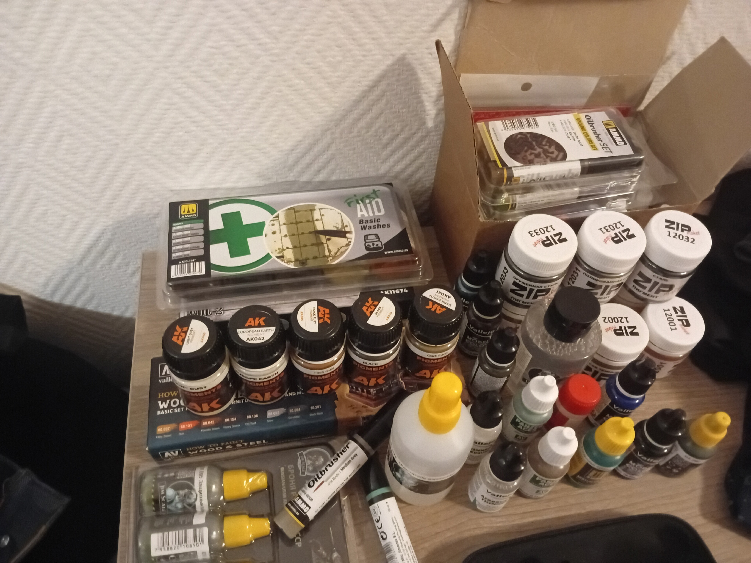 >>803568 у меня тоже говнохимия: грунт жим скейл + вальехо водные акрилы (вальехо бордовый, я их смешиваю, что бы подкрасить. Ибо серый жим скейл грунт на сером пластике не видно, не понятно, что уже залил, что нет), краска тоже жимскейл. Так когда надо зачистить места для деталей под приклейку, даже зубочисткой порой не счищается, железным пинцетом прям драть надо, прям железобетонное покрытие. Это на танчиках так. А на миниатюрах, которые вроде бы в той же коробке с танчиком, почему то слезает очень легко. Не понял почему так, то ли там пластик другой, то ли смесь жим-скейла с вальехой держится лучше, чем чистый вальехо грунт (я в это не верю), то ли верхний слой краски укрепляет, ибо миньки еще не крашены, только грунтованы и легко могут облезть.