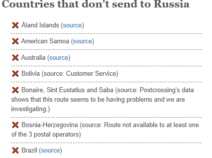 Что за хрень, я не понимаю. Отправленные в начале октября не дошли, вообще ни одна. Смотрю другие профили россиян, там неделю назад уже дошло все отправленное в те дни. И это люди слали из разных городов, почта из которых вроде как сначала в Москву свозится. А я из самой Москвы отправлял.