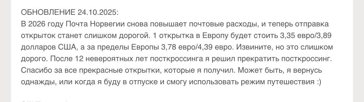 Дропнул хобби в начале 22 года (когда еще вышла охуенная марка из серии с Лукоморье, она идеально закрывала международный тариф 55 руб). Вот, сейчас на электронку упало письмо от постмании, что они закрываются, вспомнил, разобрал. Марок на 10-15к, куча открыток - надо будет заняться и разослать. Тупо дорого, одна открытка выходит в 150 руб с учетом всех сопутстствующих расходов.