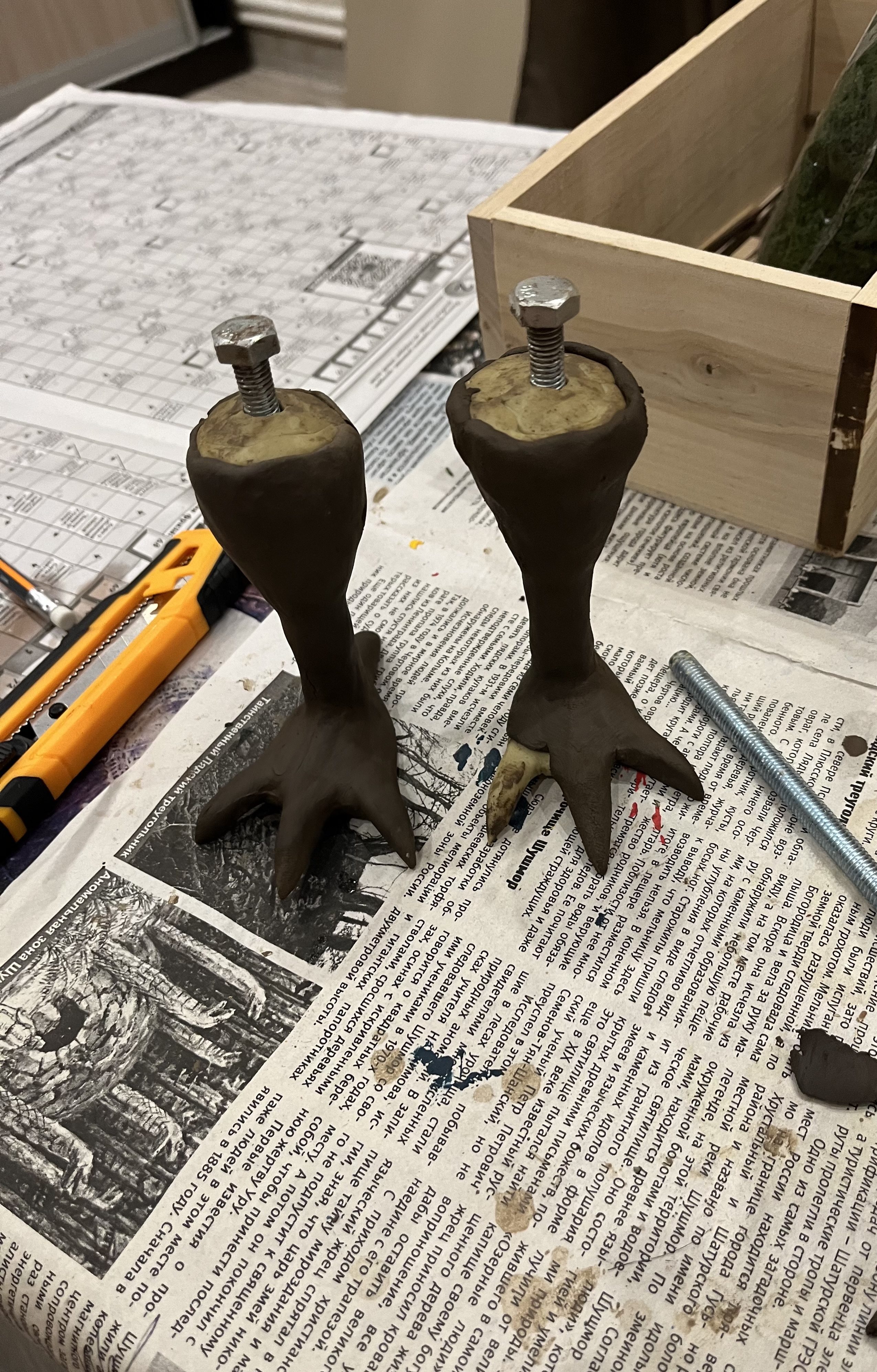 Всем привет. Подскажите,пожалуйста,с выбором материала. Леплю куриные лапы для избы на самоделку,основа обычный скульптурный пластилин ,а сверху какой-нибудь затвердевающий. Сначала попробовал скульптурную массу-не понравилось работать с ней, потом попробовал красную глину-она у меня утром вся потрескалась.(для такого не предназначена) В итоге нашел массу для моделирования ,вроде норм ,но ее надо как и глину размачивать ,и работать с ней тоже не очень. Пару лет назад делал Ктулху ,и вот там идеальный материал был( мягкий,пластичный и самозасыхающий),а сейчас ничего толкового в магазах найти не могу. Конкретное название мб кто-нибудь знает? Спасибо заранее