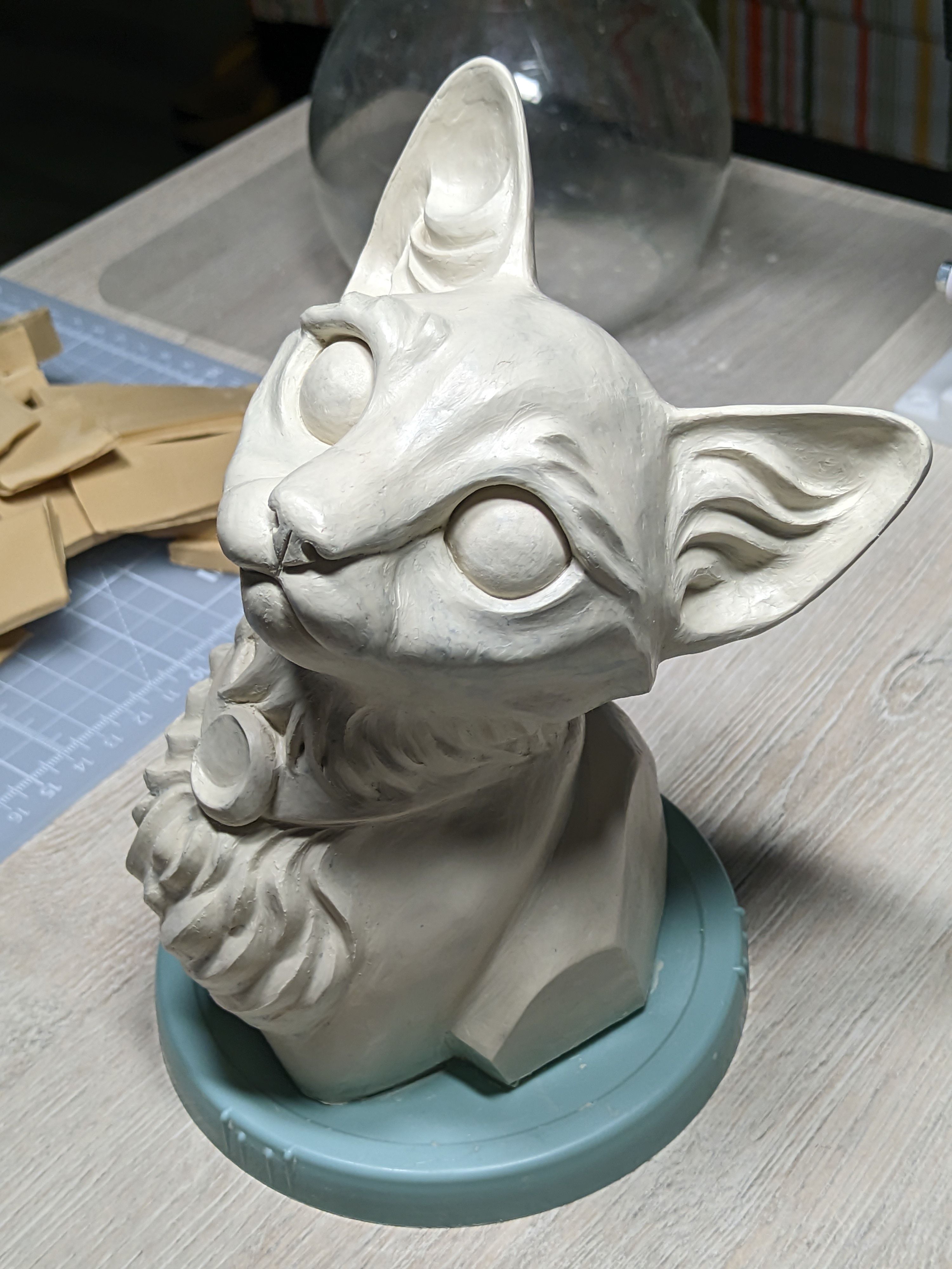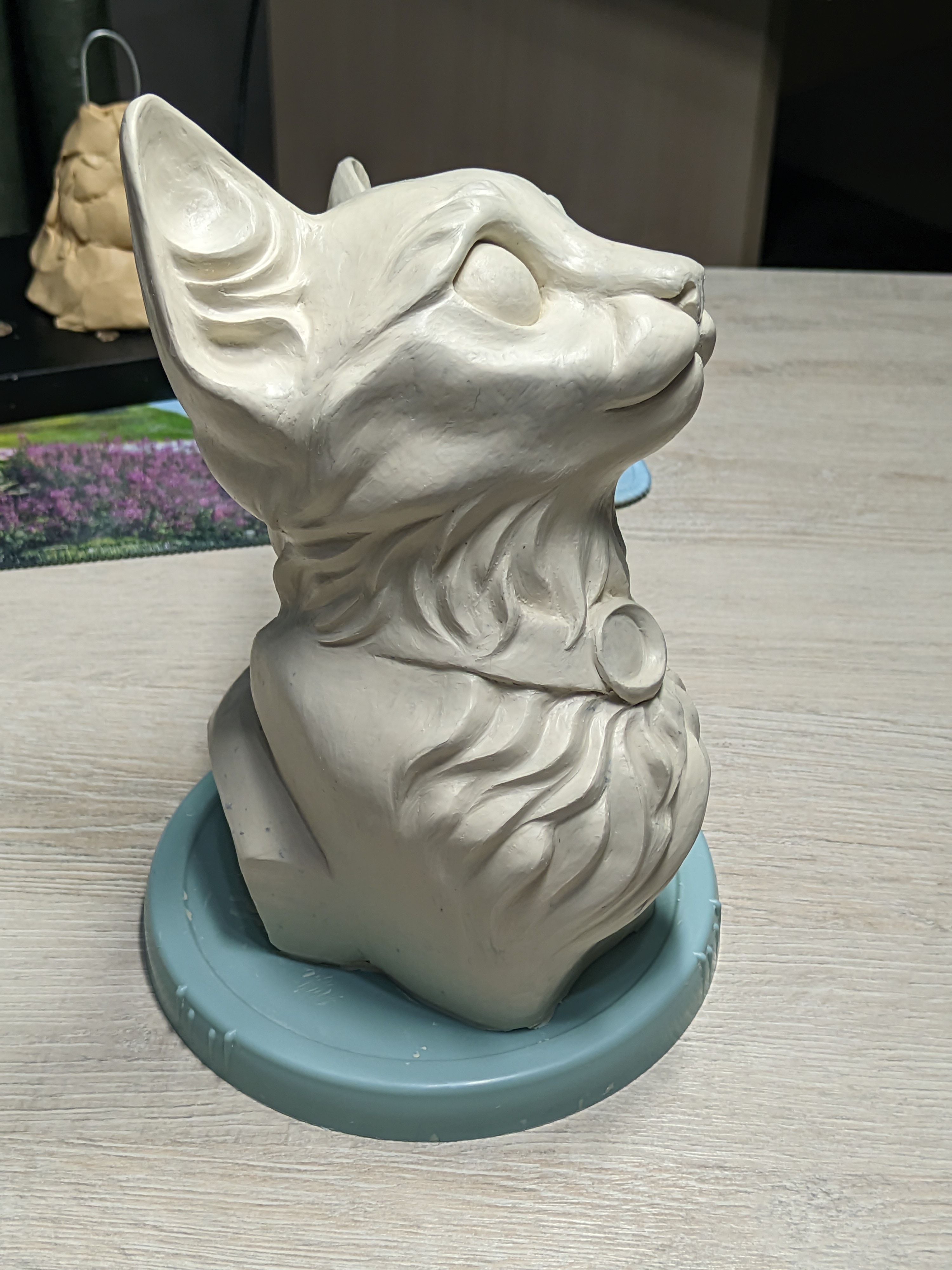 практически доделал кошку, я уже не знаю что с этими микрокатышками делать, уже еле-еле касаясь выглаживал, пробовал и силиконовую кисточку и растворитель галошу, все равно они остаются. делал из ск. пластилина впервые, и взял на эту пробу мягкую гамму, в процессе уже 10 раз жалел, что мягкий. и вообще она какая-то, хз, к пальцам не особо липнет, но к любому инструменту еще как и катышки эти от него же. не пробовал только горелку, но хз, она небось поплавит вместе с ними острые углы, а я хотел чтобы они тоже выделялись.