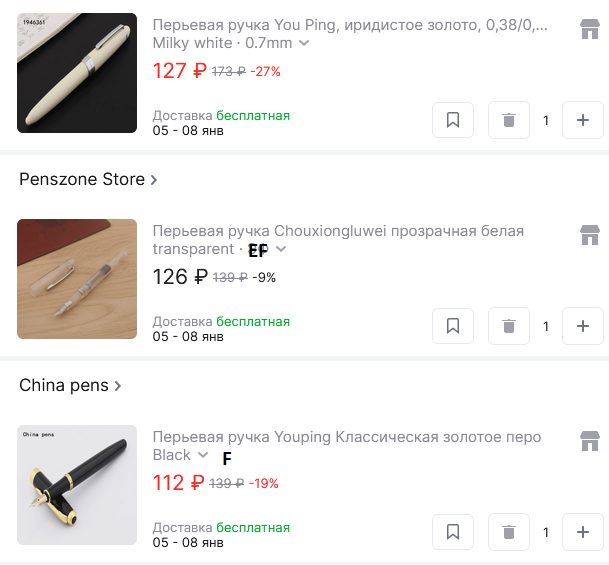 >>801979 Тоже купил целую охапку разных Джинхав. Пока итоги такие: перья №8 у них годные. Купил 9019 и x159, разобрал, идеально свёл, собрал и теперь пишу с удовольствием. У x159 великолепная геометрия в плане удобства хвата.