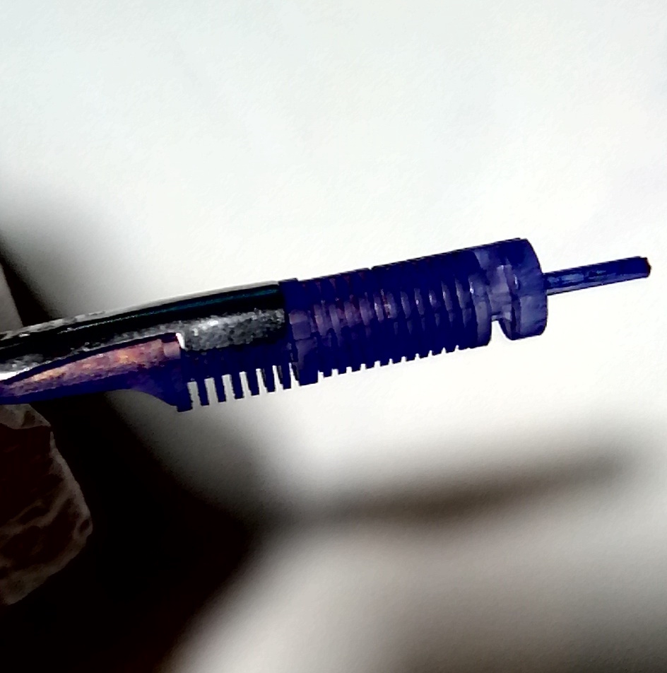 Деталь 1: сверху резьба, на которую навинчивается верхняя часть ручки. Плоская хйуня посередине упирается в деталь 2, нижняя часть вставляется в детали 2 и 3. Чёрная точка это дырка, вероятно, она связана с чёрной точкой на детали 3. Деталь 2: ввинчивается в деталь 3 на резьбу, представляющую собой 2 торчащих кусочка латуни. Деталь 3: алюминиевый корпус, в который вставлен латунный стакан (на риснке его не видно, он ниже), от которого тянутся два куска с резьбой. В латунный стакан вставлен прозрачный пластиковый стакан (синяя хуйня на рис.), резьба частично скрыта за ним. Чёрная точка - дырка, в которой торчит какой-то другой материал. Пластиковый стакан вниз сдвинуть не получилось, ввинтил деталь 2, насколько вышло, и ОЧЕНЬ аккуратно (но настойчиво) побил молотком через кусок резины, изначальная щель пропала, никаких трещин, хрустов, деформаций и пр. не заметил. Вероятно, раньше чёрная точка на детали 3 выпирала и вставлялось в чёрную точку (дырку) на детали 1. Далее деталь 1 вставляется внутрь, её надо правильно спозиционировать, иначе перо будет выезжать криво (или не будет выезжать вовсе). На трении она не держится, если собрать ручку и активировать механизм, пружина медленно выталкивает её. Утолщённую часть детали 1 под плоской хуйнёй на шеллаке закрепил, вроде норм.