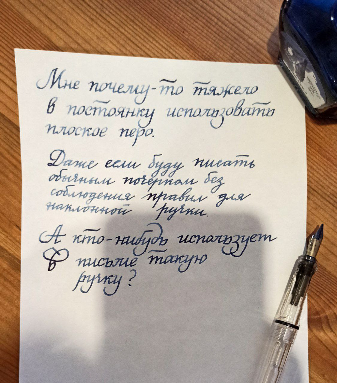Не понимаю ручки с плоским пером. Мб у меня какая-то некачественная (так как взята за рублей 100), но приятной разницы в толщине линий не даёт, а писать ею заметно тяжелее