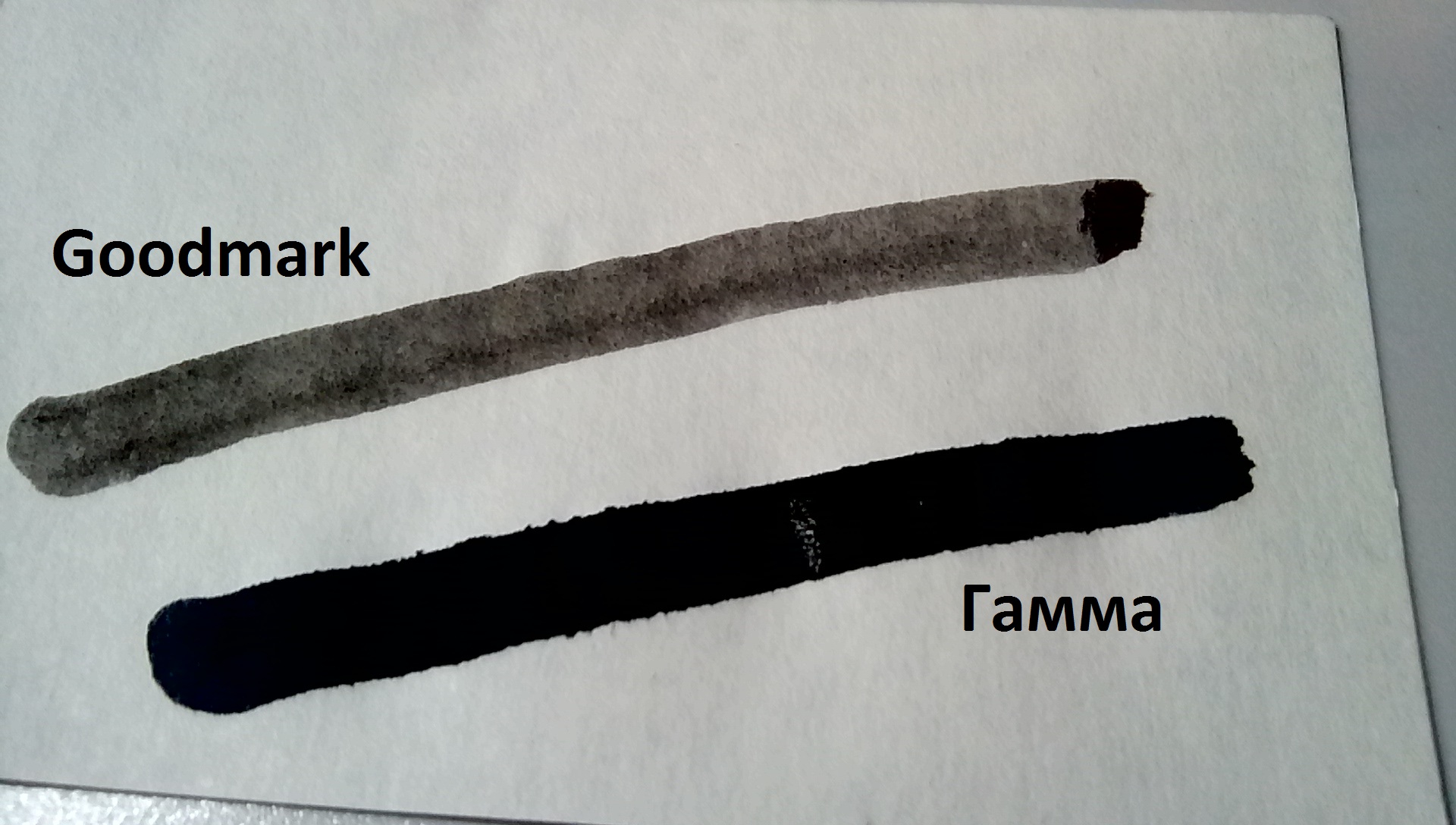 >>823776 Эпистолярно-с, хуйле. Насчёт не отмывается, не скажу, вымазаться не удалось - я как попробовал, понюхал а оно не только из флакона воняет, но и от ручки пасёт, и на бумаге, сразу слил обратно, промыл и Гамму обратно заправил. Вот для наглядности черканул по бумаге ухоковырялкой: сверху чиркаш Говномарки, снизу Гаммы. Тапок не передаёт всей глубины цвета, или точнее его отсутствия, это какая-то всратая пародия на тушь, а не чернила. Заплатил 99р за флакон говна, но выбрасывать таки жалко, приберегу для случая, когда доведётся плескануть этими помоями кому-нибудь в ебало, то похлеще зелёнки будет. ну или буду им всякие заливки фонов делать в респираторе, Гамму они не перекрывают, что даже удобно