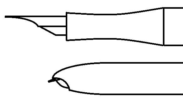 >>823987 >Давай подробней Ну, посмотри на конец своего пера: это прямоугольный параллелепипед со сглаженными рёбрами. Если хочешь более выраженную вариативность линии (т.е. более тонкую горизантальную), тебе надо грань, которая касается бумаги, сделать более острой. Потом чуть сгладить, чтоб не царапало. При этом две вершины, которые эта грань соединяет, требуют особого внимания: их надо сгладить, а то царапать будет, но при этом чем они будут острее, тем чётче будет проаодимая по бумаге линия. И всё это аккуратно отполировать. Ну тут тоже баланс нужен между гладкостью и чёткостью. Поищи в гугле/ютабе stub/italic nib grind, инфы достаточно.