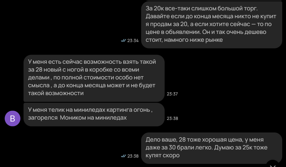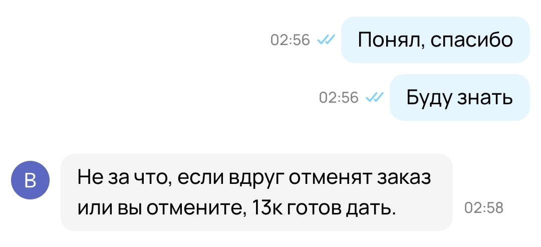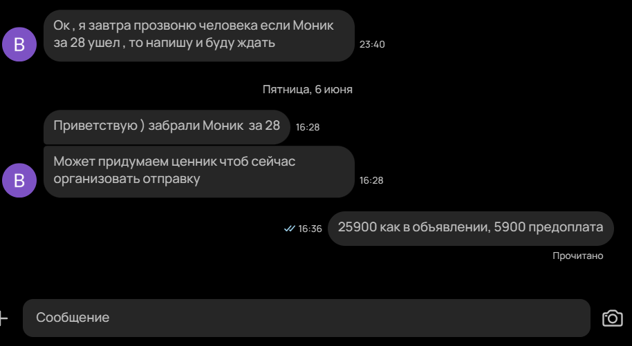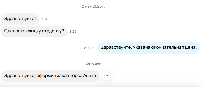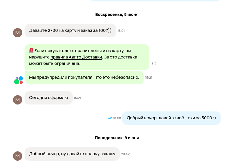 Абажник хотел скидку 25% от начальной цены (это так-то пиздец жирно), поэтому я выставил свои условия - скидку делаю, но деньги вперёд (т.к. со скидкой + комиссией будет вообще невыгодно мне). Что характерно, когда он получил скидку - начал ещё клянчить скидку на 200 рублей, лол.