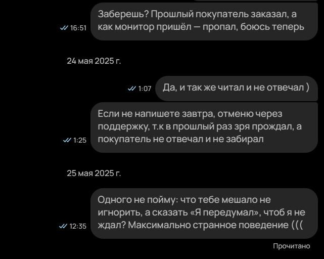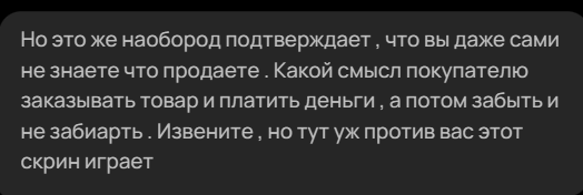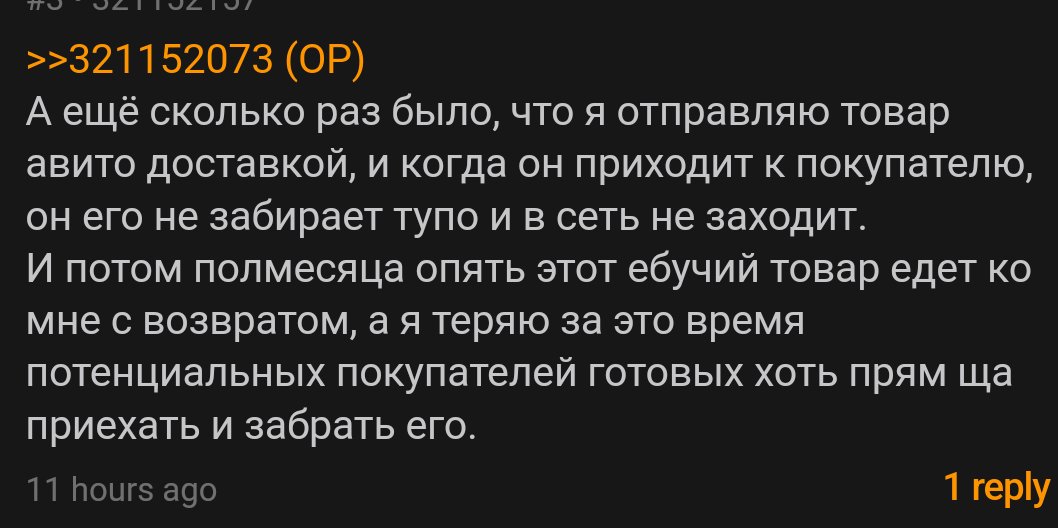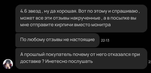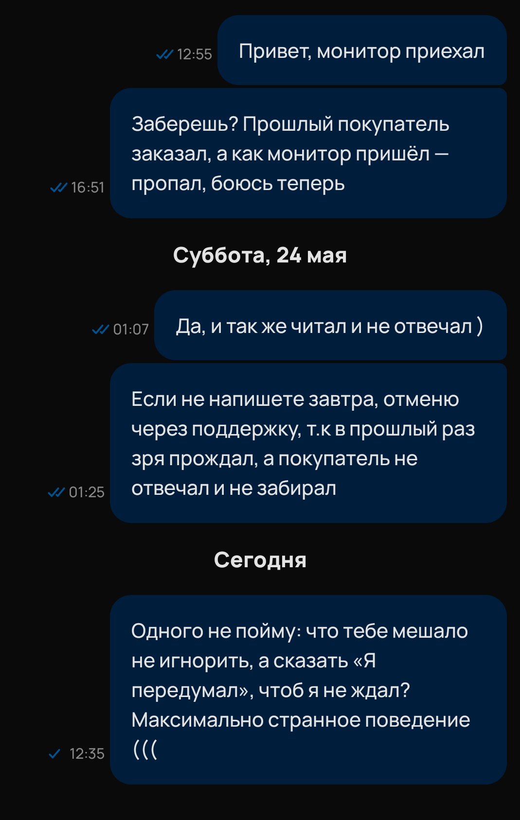 Вообще, я заметил, что геймеры — самые конченные люди. Все сходу на ты. А если учитывать то, что самый первый покупатель торопил с отправкой, чтобы отменить заказ прям перед тем, как я хотел его отправить — то вот таких случаев >>803608 было бы уже ЧЕТЫРЕ, и это один блядь товар, который катается из Сибири на запад уже три раза. Еще до того, как я стал продавать монитор, я немного пообщался с комьюнити тех, кто покупает такие моники и охуел с того, какие это тупые животные. Так что не удивлён. Возможно, у более дорогих мониторов (это бюджетная модель) контингент покупающих поумнее, но я вас предстерегаю, аноны: если будете продавать что-то геймерское в средней или бюджетной ценовой категории, берите предоплату, геймеры — конченные гниды, причем настолько часто, что мне уже 4 подряд попались.