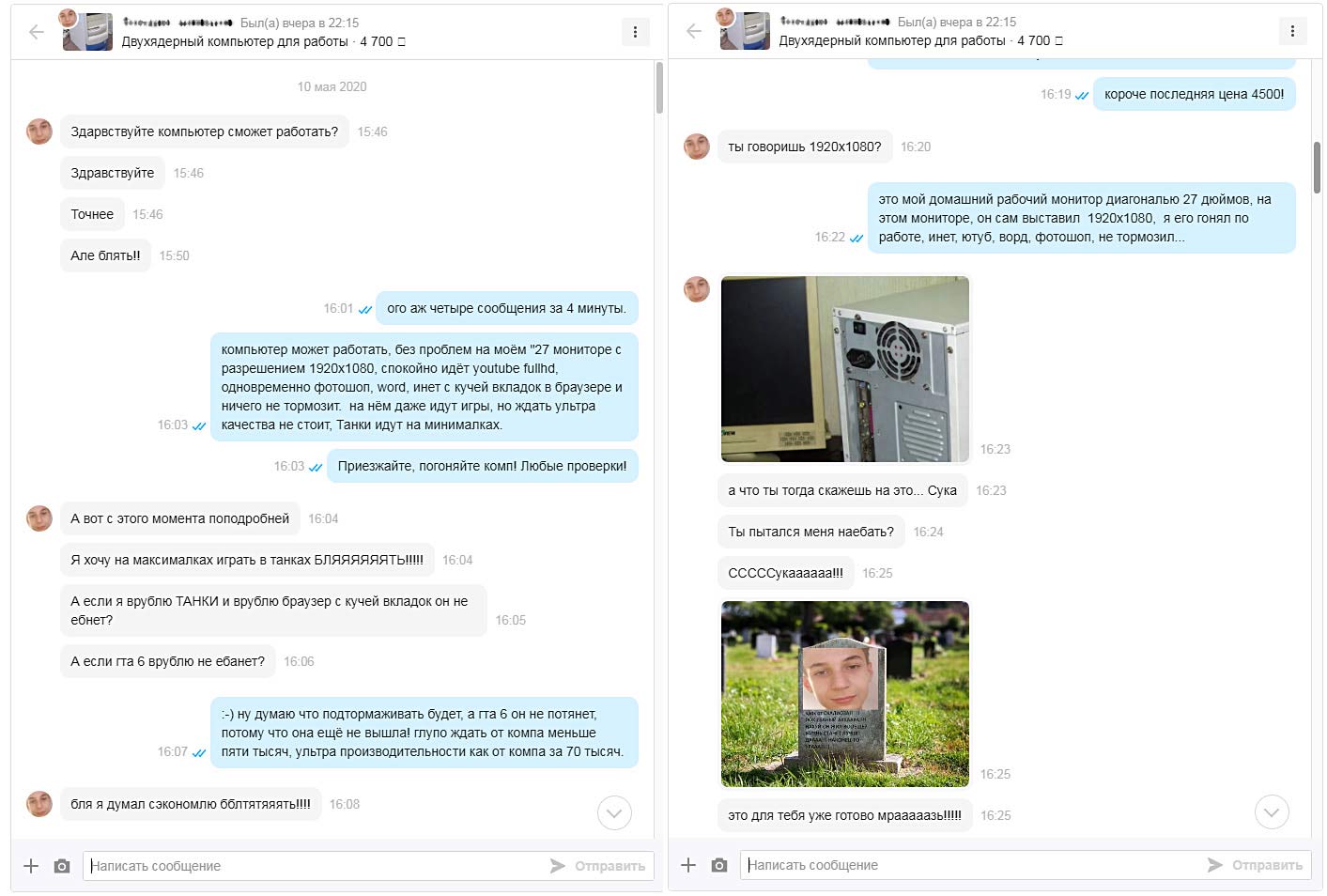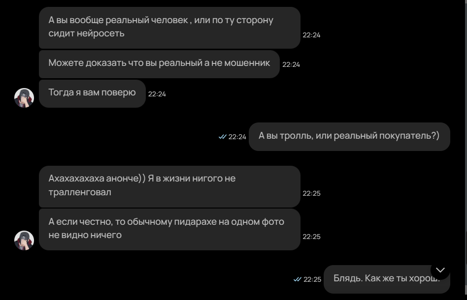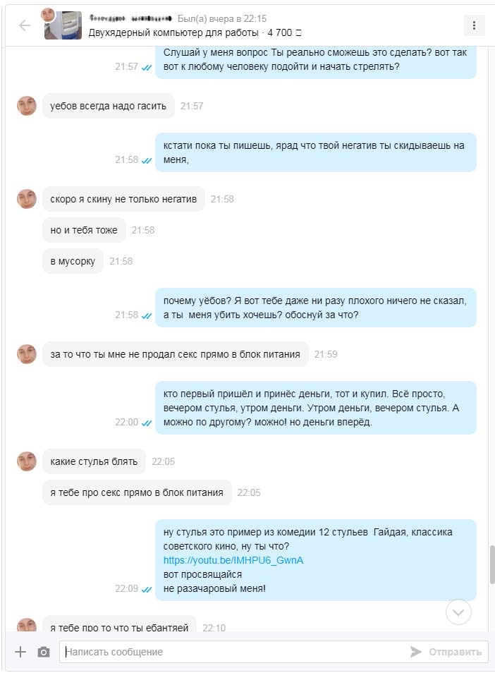 Был один пидрила еще, который заказал, а потом отменил прям перед тем, как я хотел отправить. Эти геймеры — самые часто переобувающиеся твари. Но я, блядь, удалил с ним диалог. Да и мстить ему мотивации нет, урон не такой сильный был. А вот этим троим, ух сука... Знаете, я в жизни очень мягкий и добрый человек, няша-стесняша, но вот эти пидоры блядь... сука.