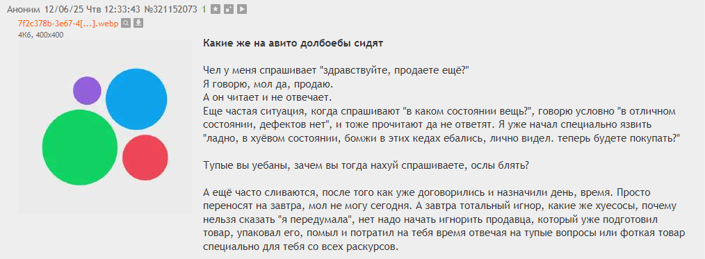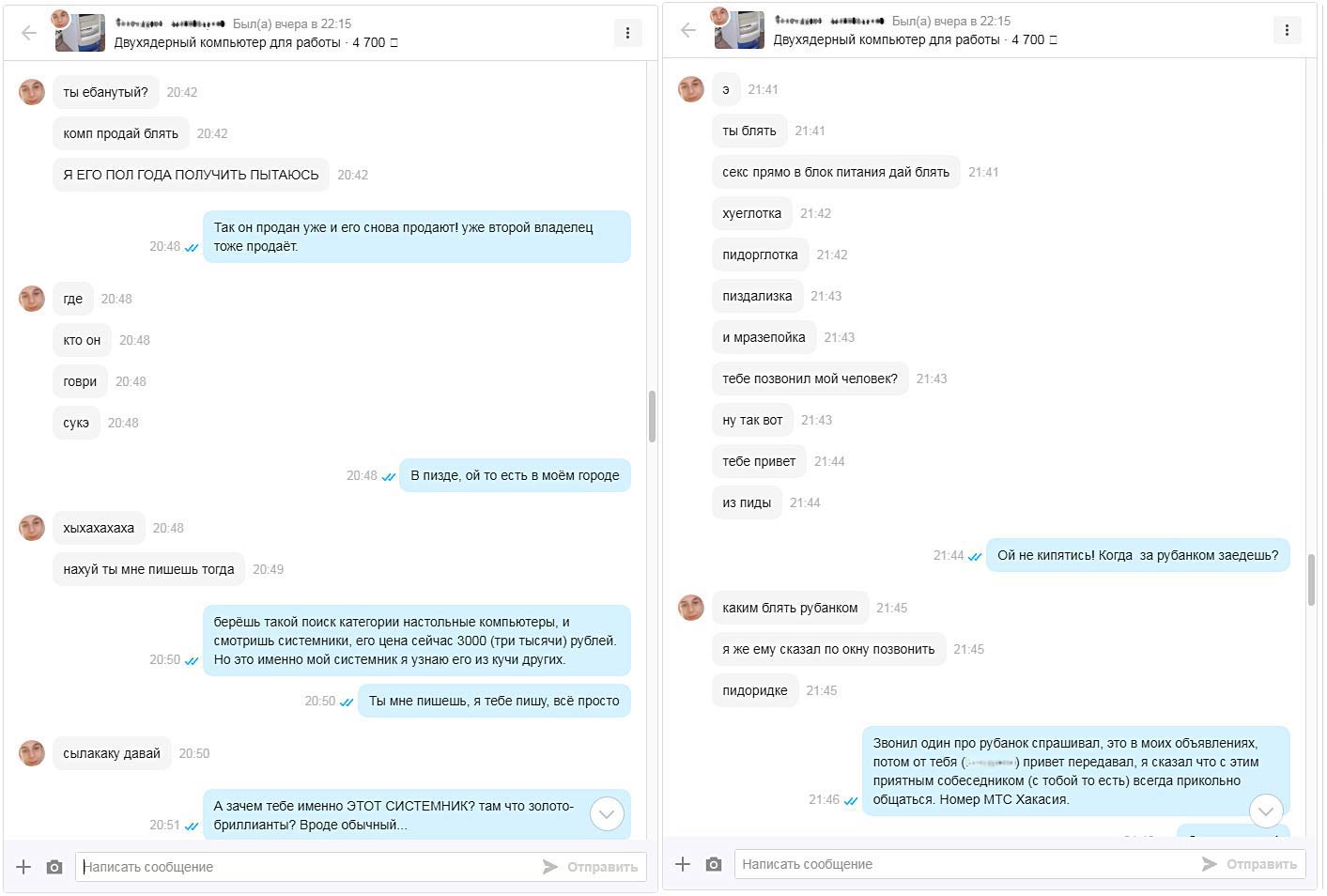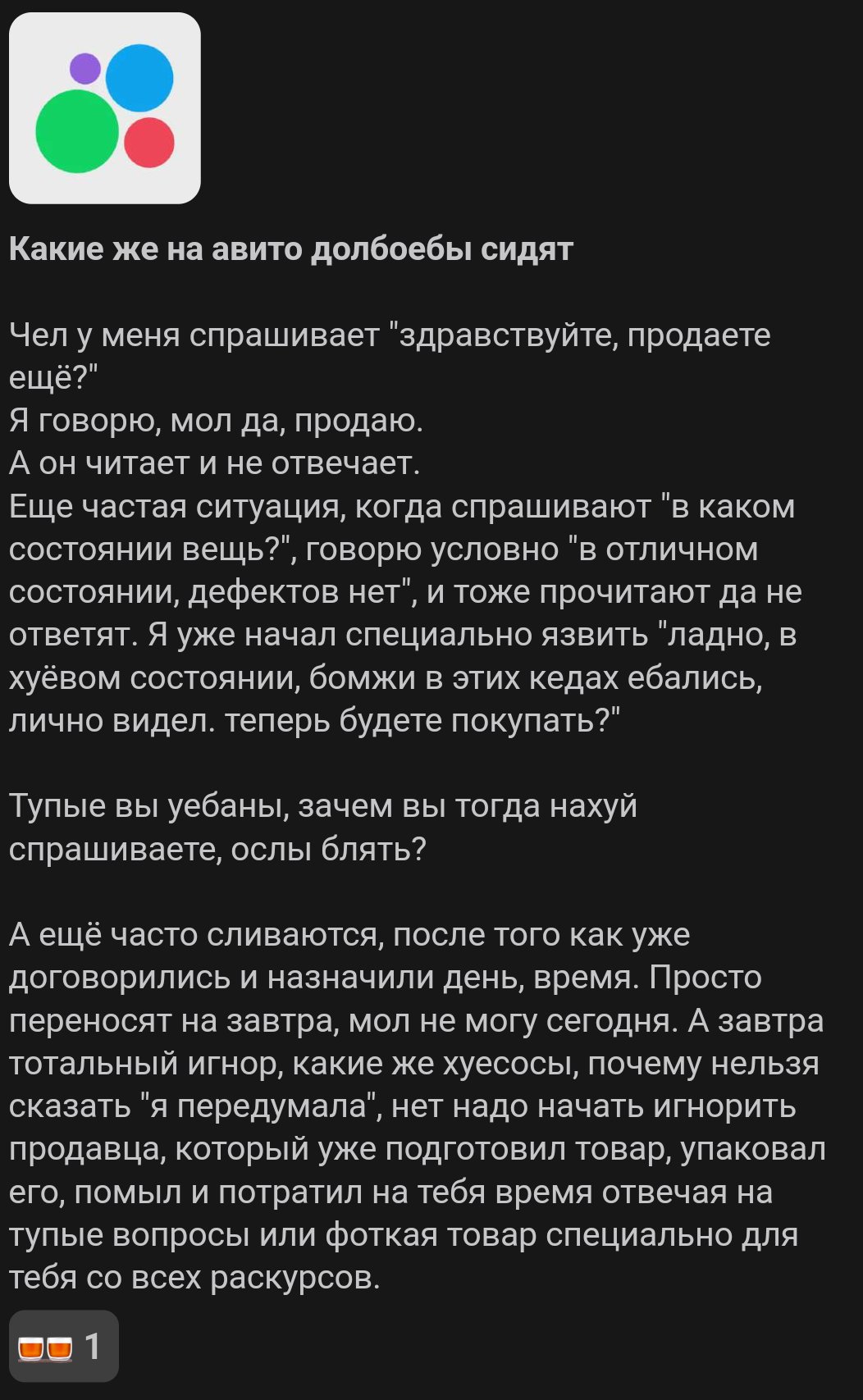 >пишешь тупо всем потому что еблан на еблане вместо продавца Интересно, почему я такими ебланами никогда не сталкивался я, хотя я и покупаю, и продаю? Может быть, я умею выбирать объявления с адекватами, читая описания товара и отзывы? Ах да, пидоrashka на это не способна. Piидорашка будет писать на каждую объяву «Актуально?» и плакаться, что ему не так ответили.