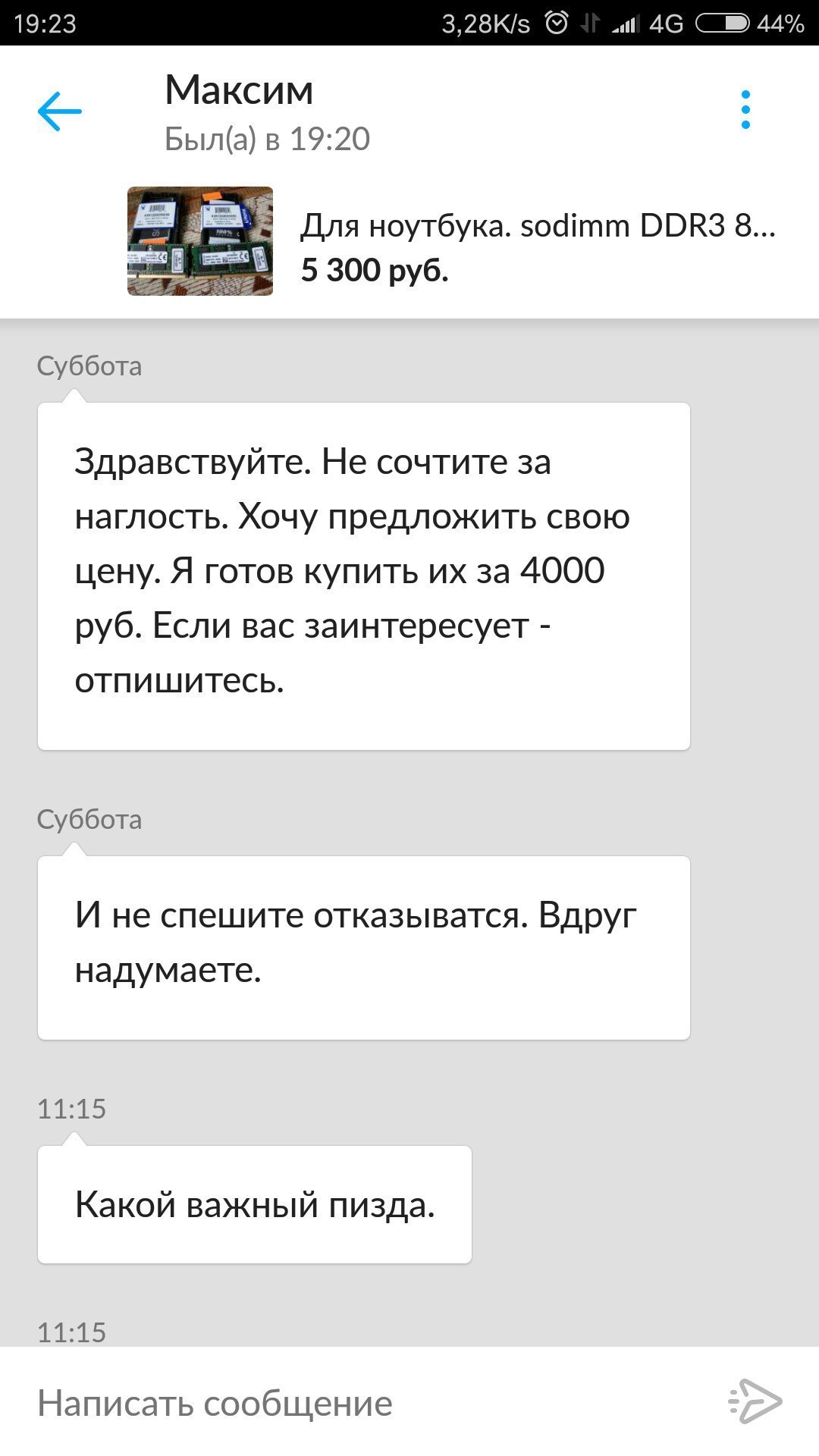 Зачем писать "Вы ещё продаёте?" и ничего не отвечать по итогу моего ответа? Уже столько раз было на пердолу писали, я уже готов и цену скинуть лишь бы забрал - а он в игнор.